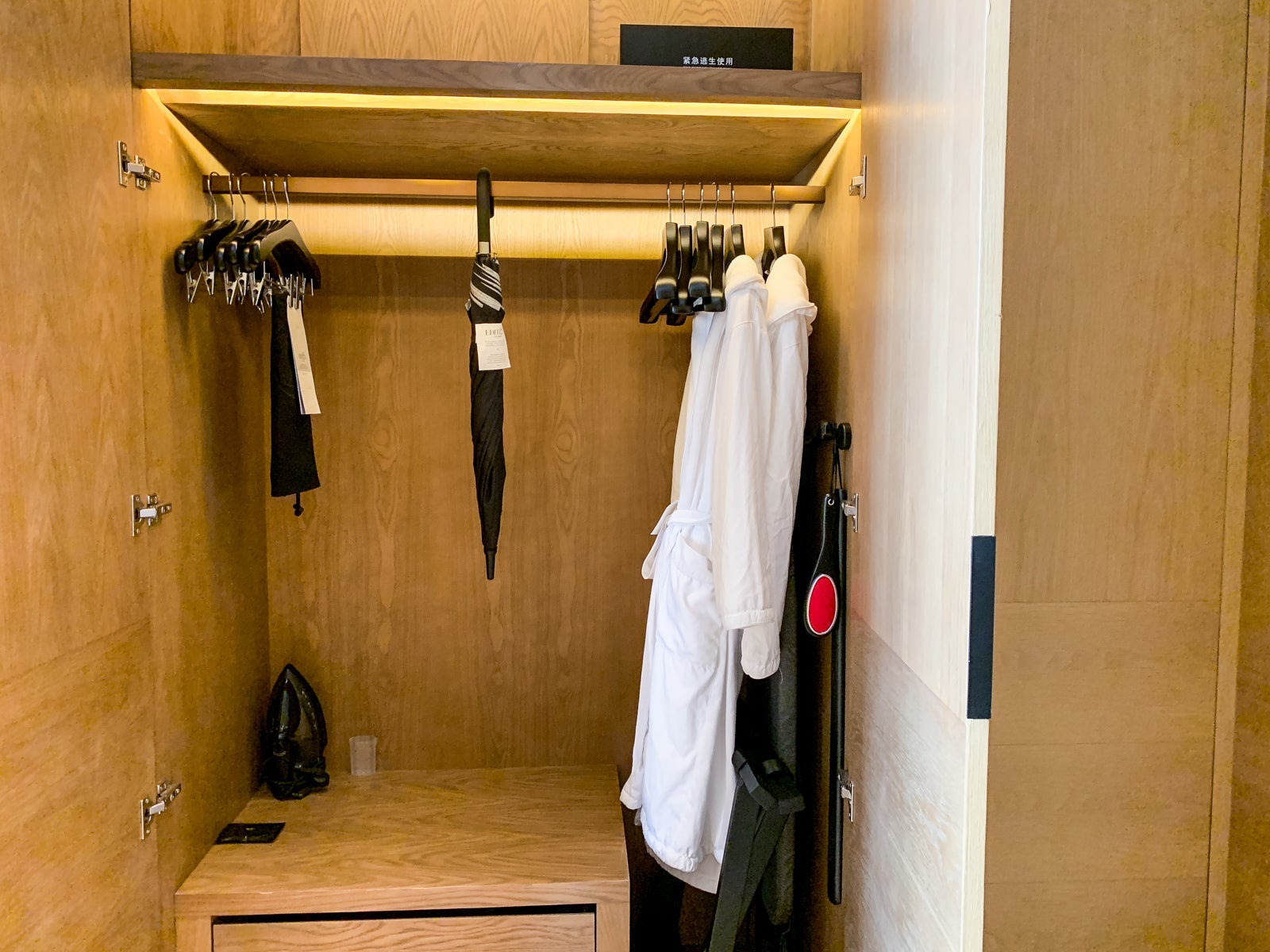 There was a small foyer, with the entrance to the bathroom on the left as I came in. Opposite the bathroom was a closet that came stocked with robes, a shoehorn, laundry bag and a prominently displayed umbrella, which felt to me like the hotel's subtle reminder to always be prepared for any type of weather.