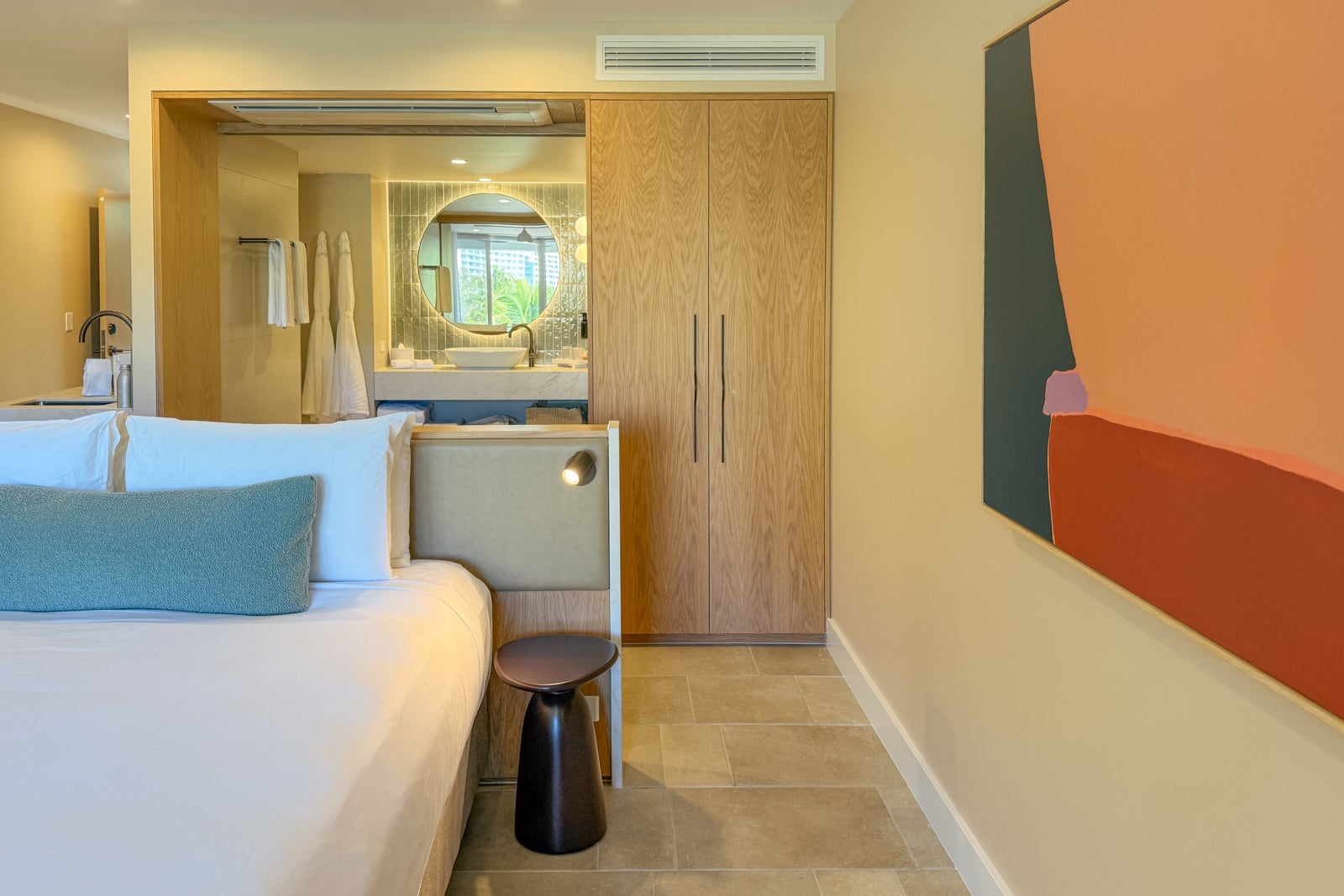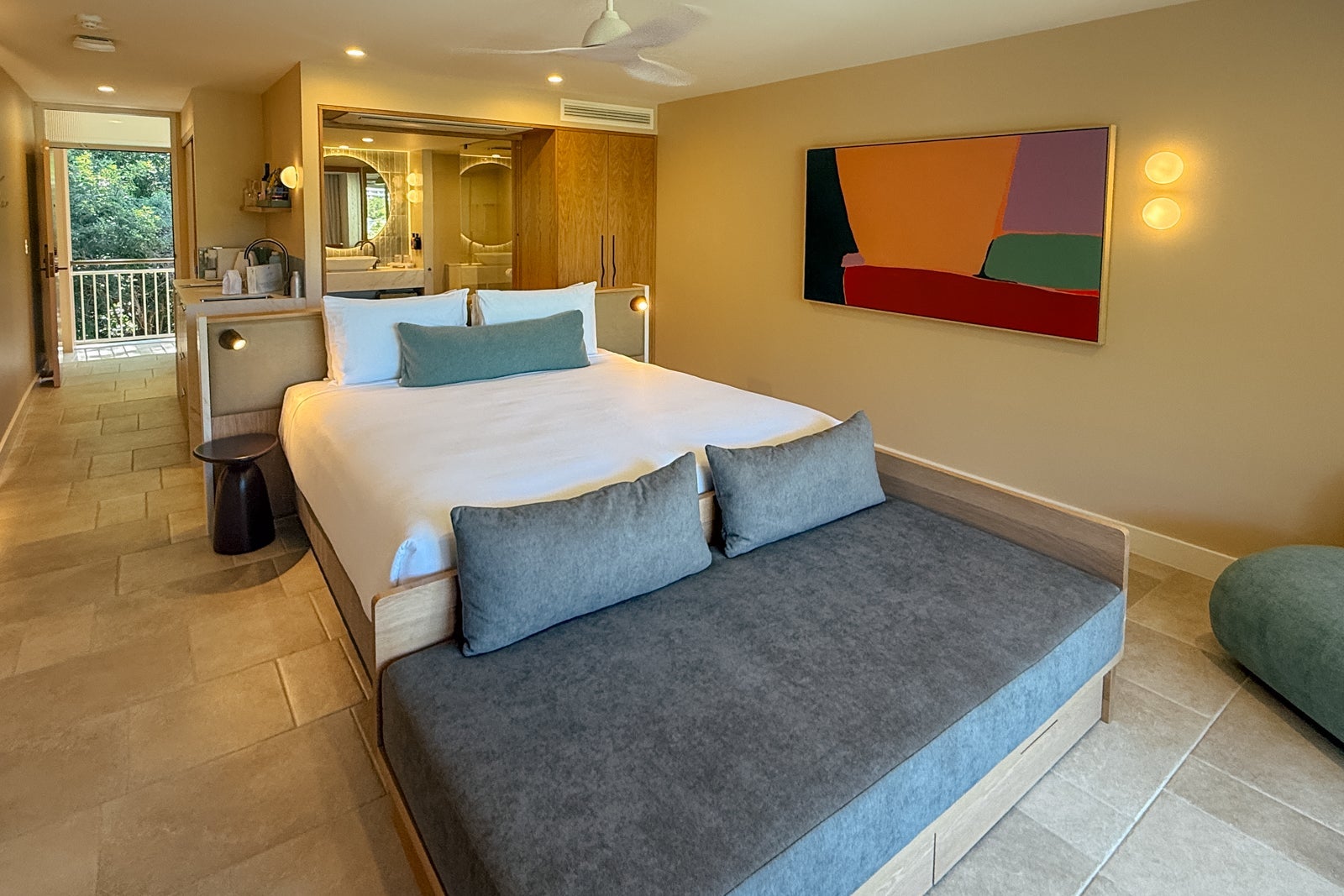 From the open-air hallway, I entered a large, bright room with a mostly neutral color palette, save some pops of color like a sea foam green slipper chair off to one corner and a colorful, beautifully simple print depicting the island's story by Indigenous Australian and Hungarian artist Tiarna Herczeg.