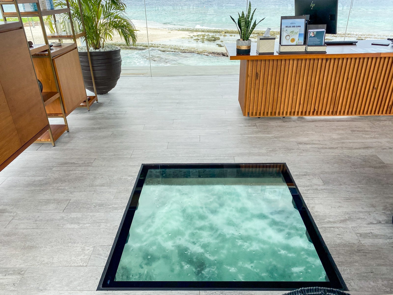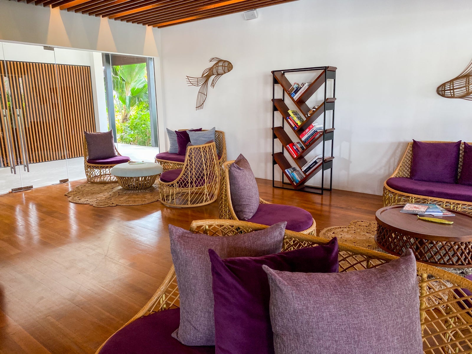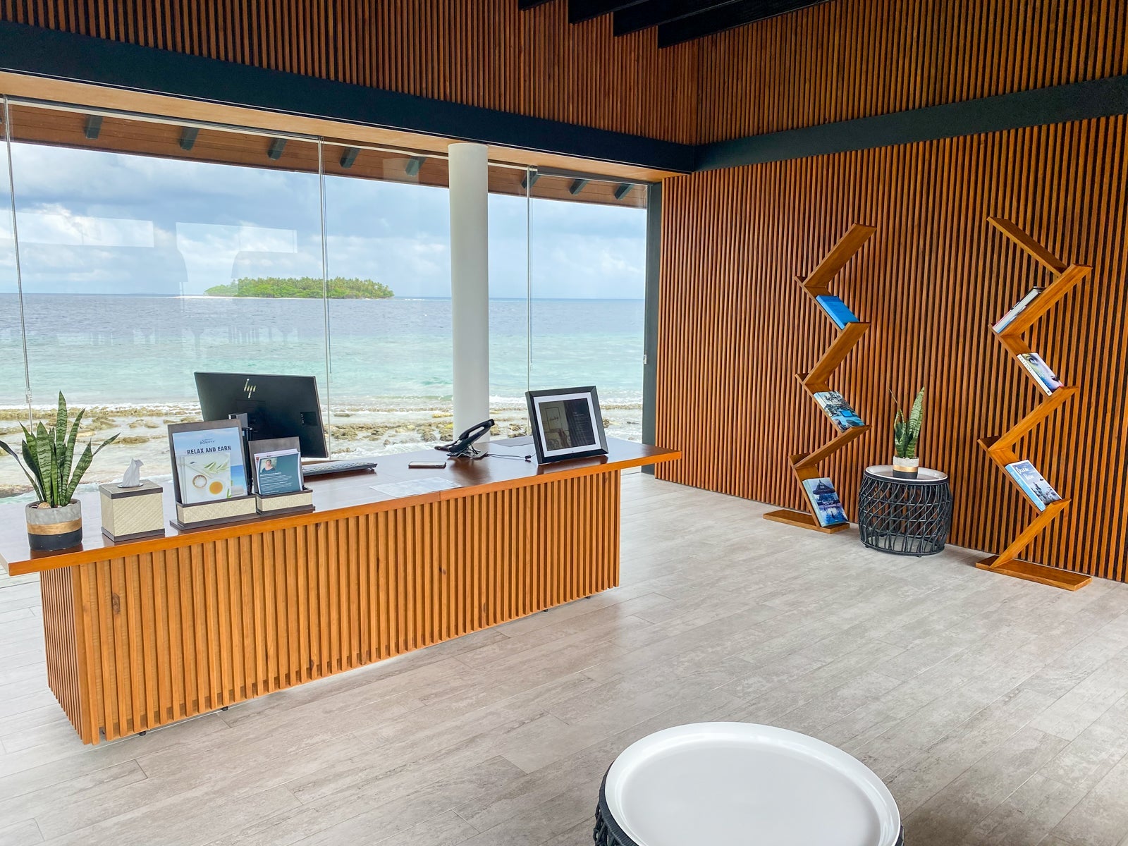 It is housed in an overwater villa and has a soothing, airy lobby.