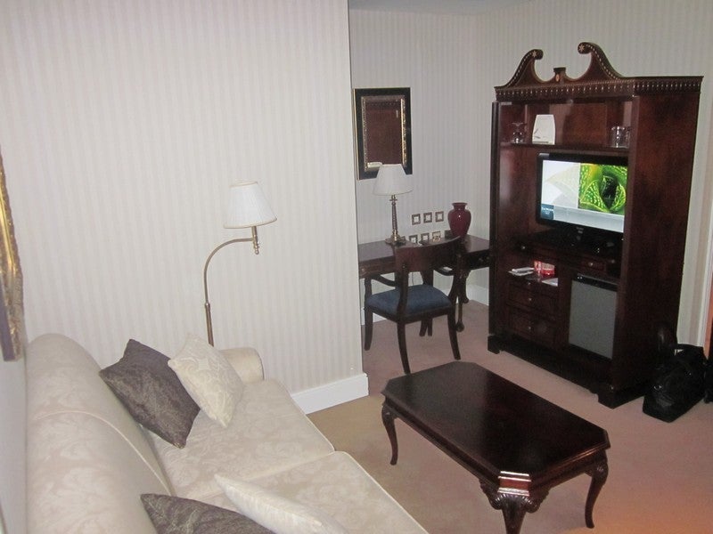 When you walk into the foyer, there's a small seating area and there were two bottles of complimentary still water and glasses. You then enter the living room, with a somewhat old-school sofa, flat screen TV and CD Player radio (they really just need to get a Bose iPod dock). There's also the door to the terrace, which is locked. In order to get it unlocked, you have to sign a lengthy waiver and have a maintenance man come in with a ladder and make some adjustments. I suppose they are ultra-sensitive to people breaking in if people leave the door open.