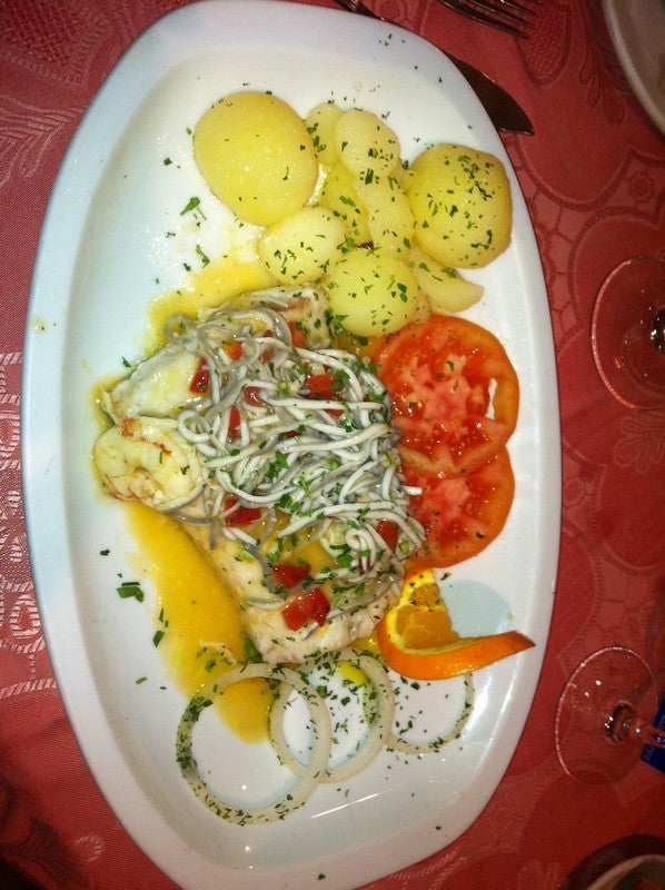 My main entree was a monkfish with shrimp and some sort of eel topping. Anyone have a clue what they are called? All I know was that the entree was absolutely delicious. Every single bite of the fish was fresh and flavorful and the sides were simple potatoes, tomatos and onions. It wasn't fancy, but it was simply delicious.