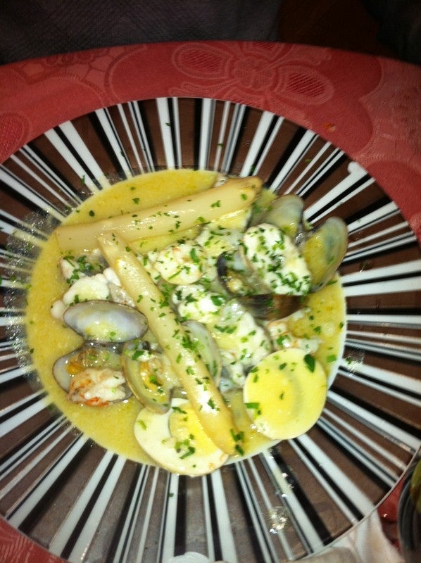 The other main entree choice was a clam and shrimp medley with white asparagus and hard boiled egg. This was good, but my fish was better.