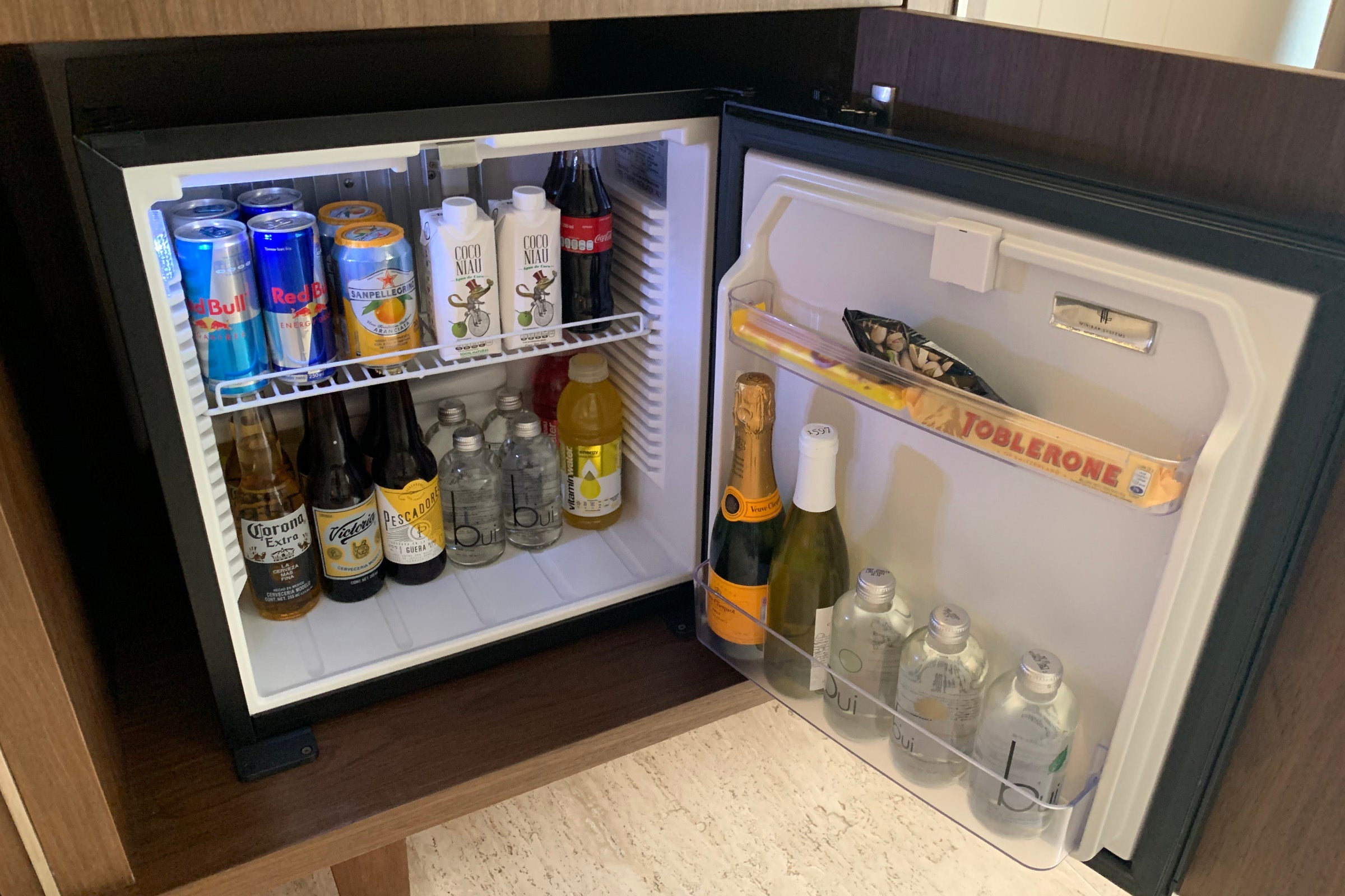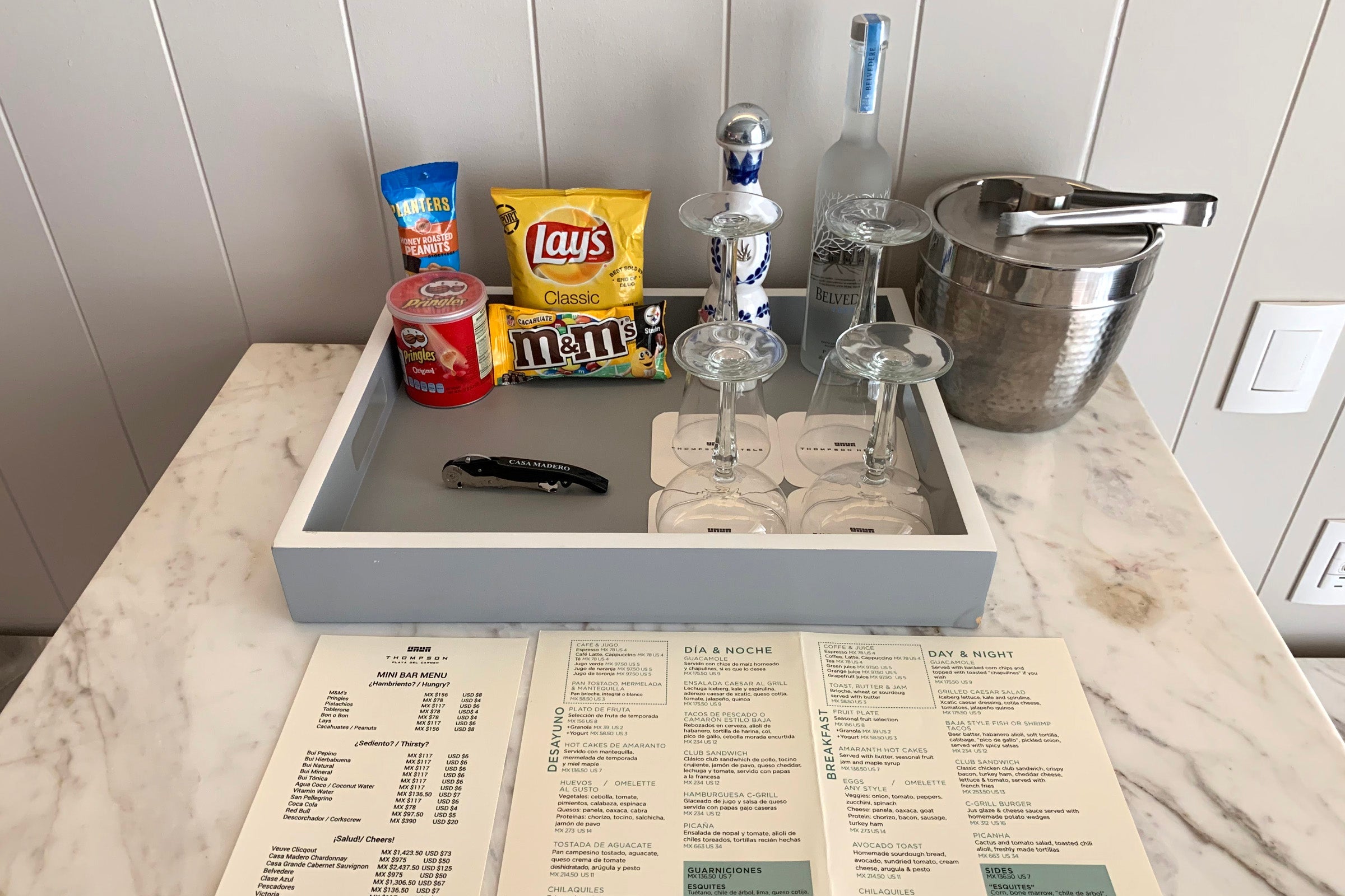 There was a ton to eat and drink just a few steps from the hotel, but there was a fully stocked (and expensive) minibar as well. Front-and-center snacks ranged from chips ($4) to chocolate ($8), along with a small bottle of Clase Azul tequila ($67) and Belvedere vodka ($50).
