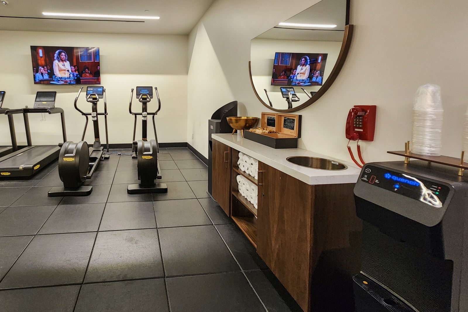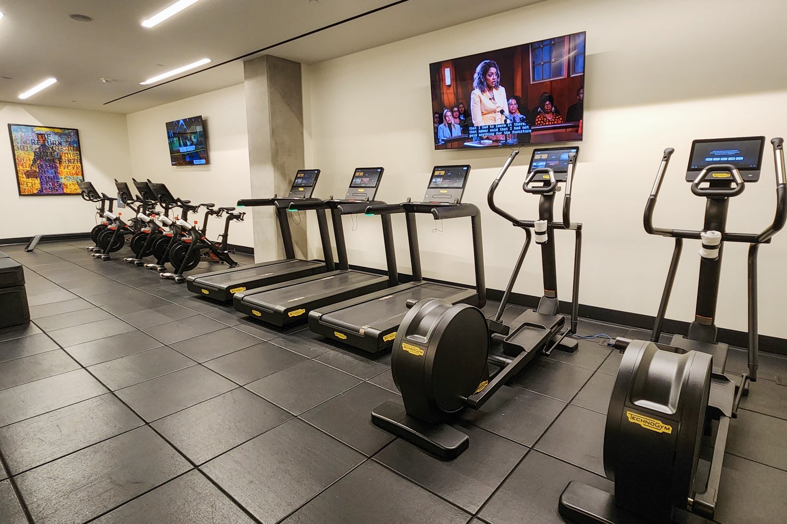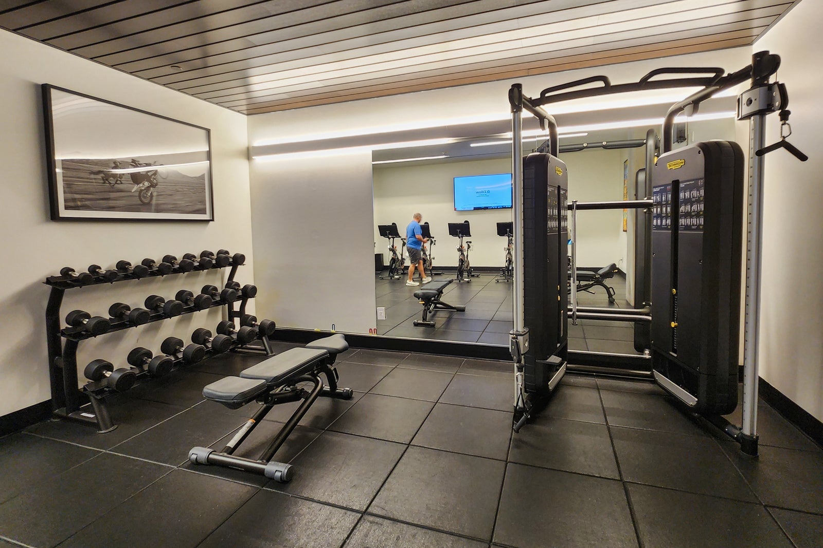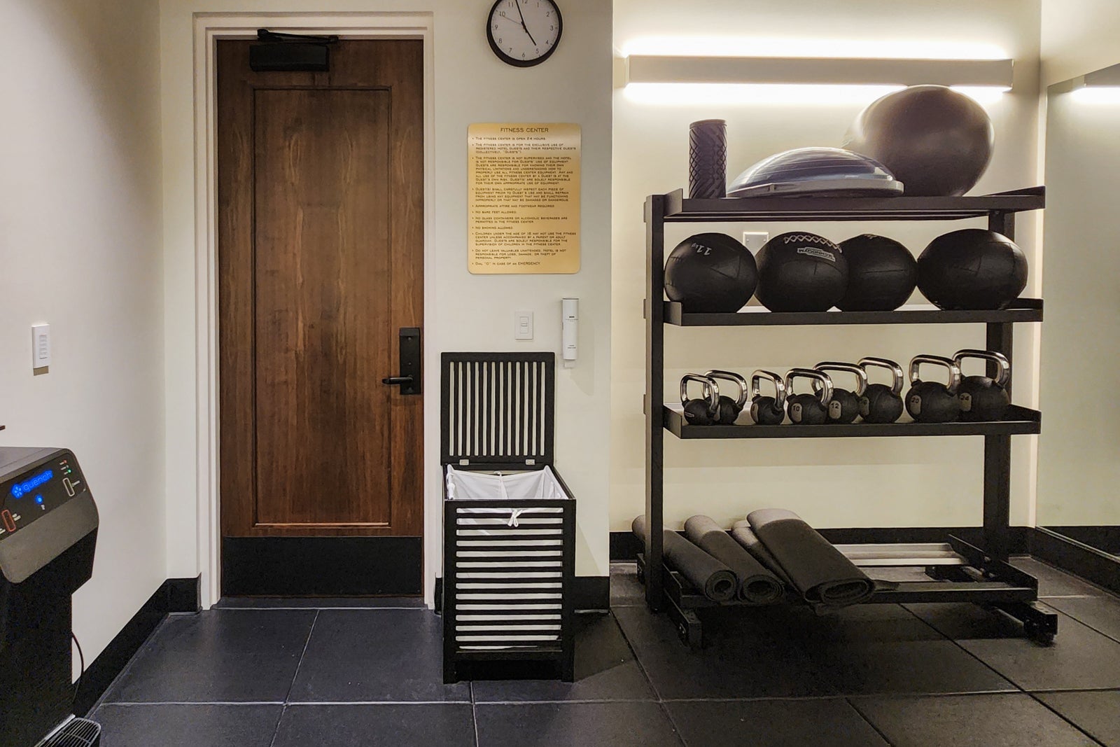 There's a fitness center on the bottom floor with a variety of cardio machines, free weights, kettlebells and exercise balls.