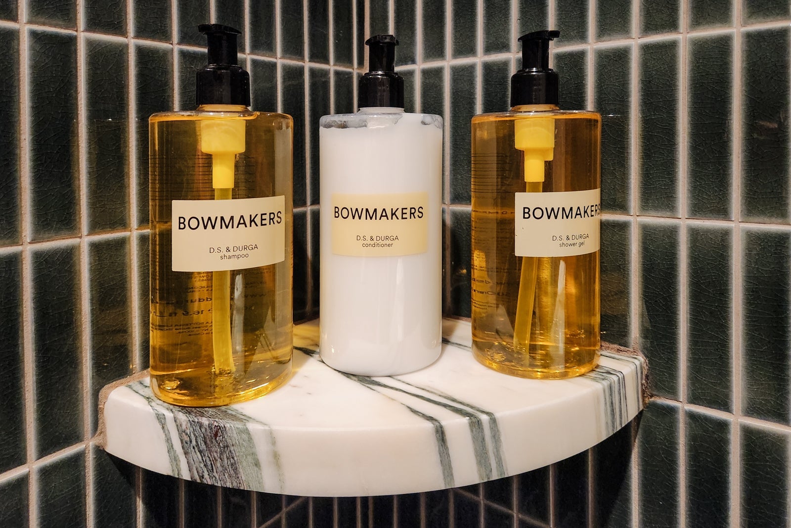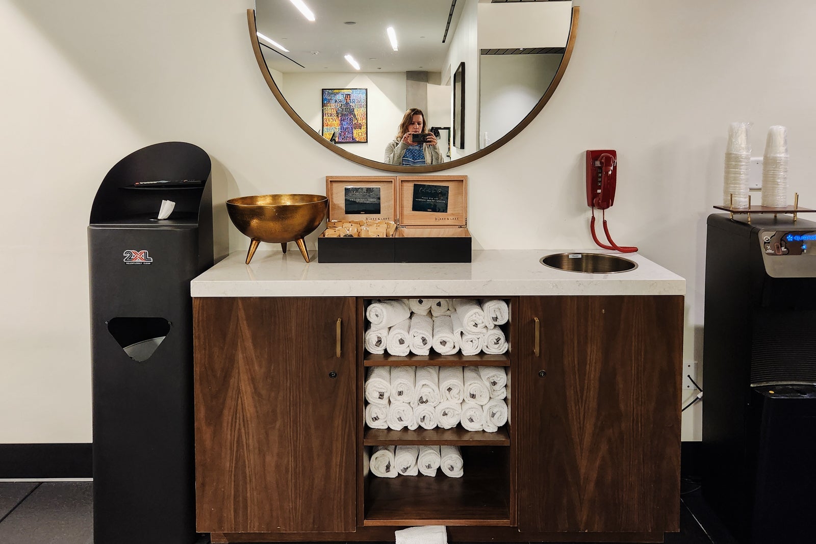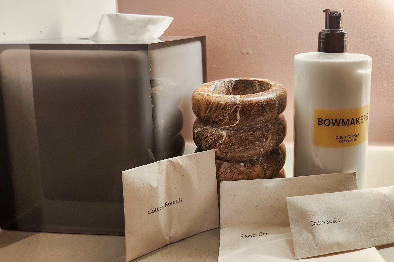 A barn door revealed a well-equipped bathroom, with extra towels, a hair dryer, a double-sided vanity mirror and a brown washcloth for makeup wearers. The spacious shower had both a rain-style overhead fixture and an extendable wand. There were Bowmakers bath products and a few other toiletry items provided for free, as well as for-purchase kits (like the Mile High Miracle skin kit by Skin Authority for $75) in case I wanted to have a spa night.
