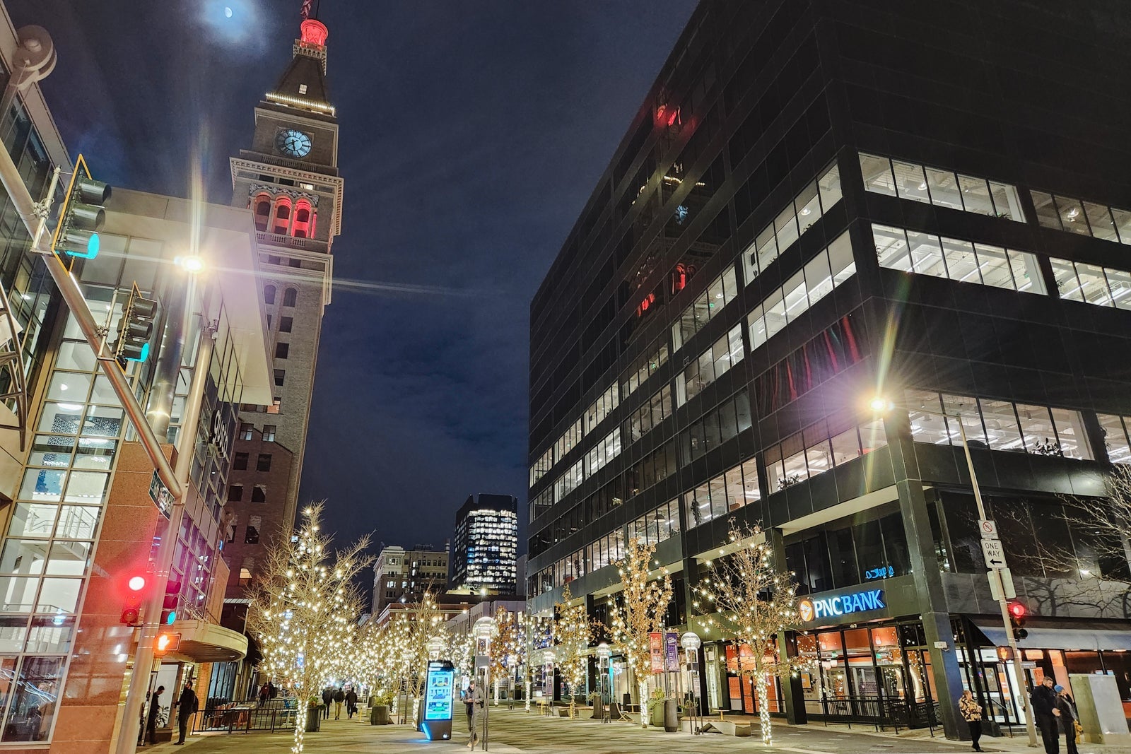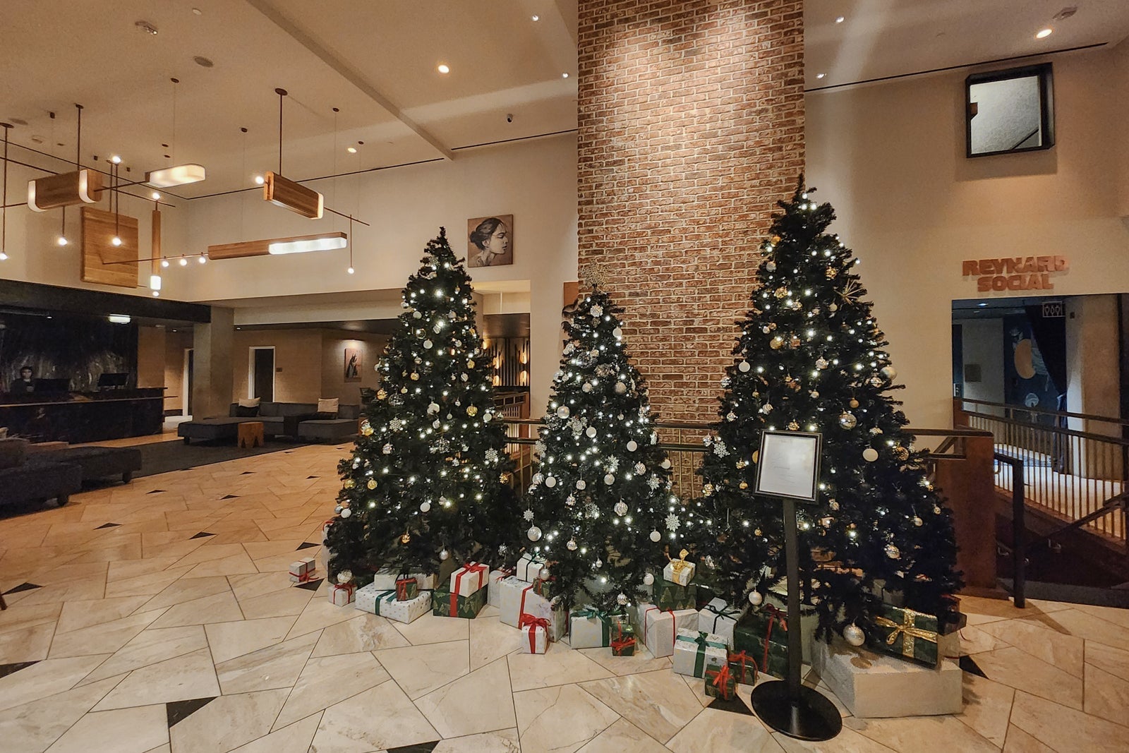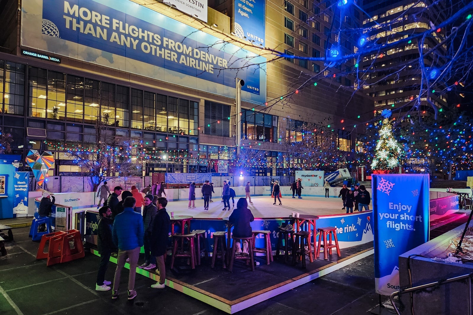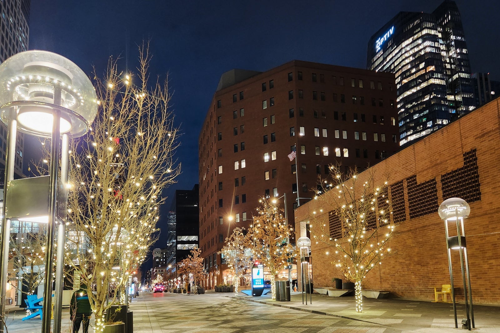 During my visit in December, the area was decked out in festive lights and garlands, with an outdoor skating rink just a couple blocks from the hotel.