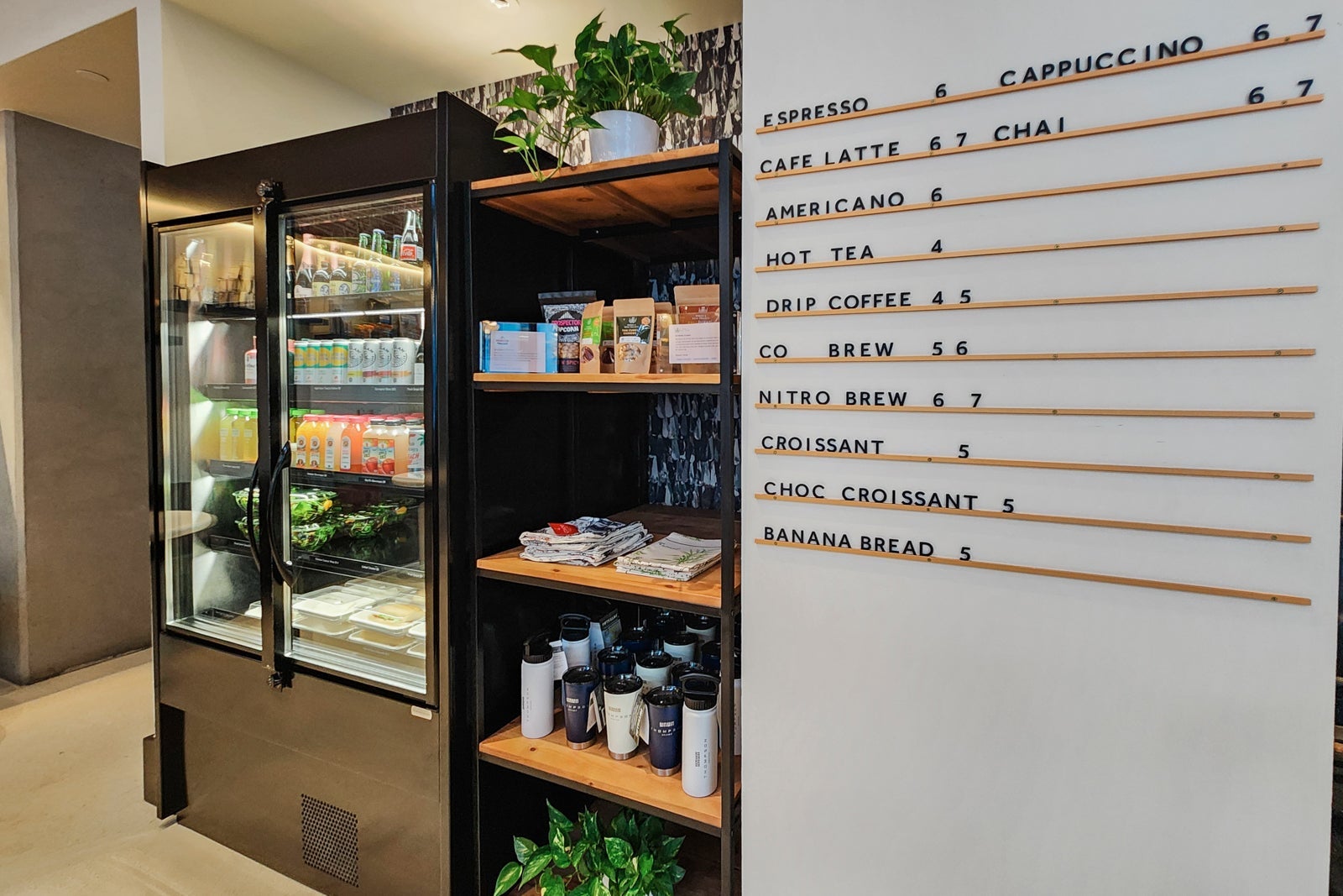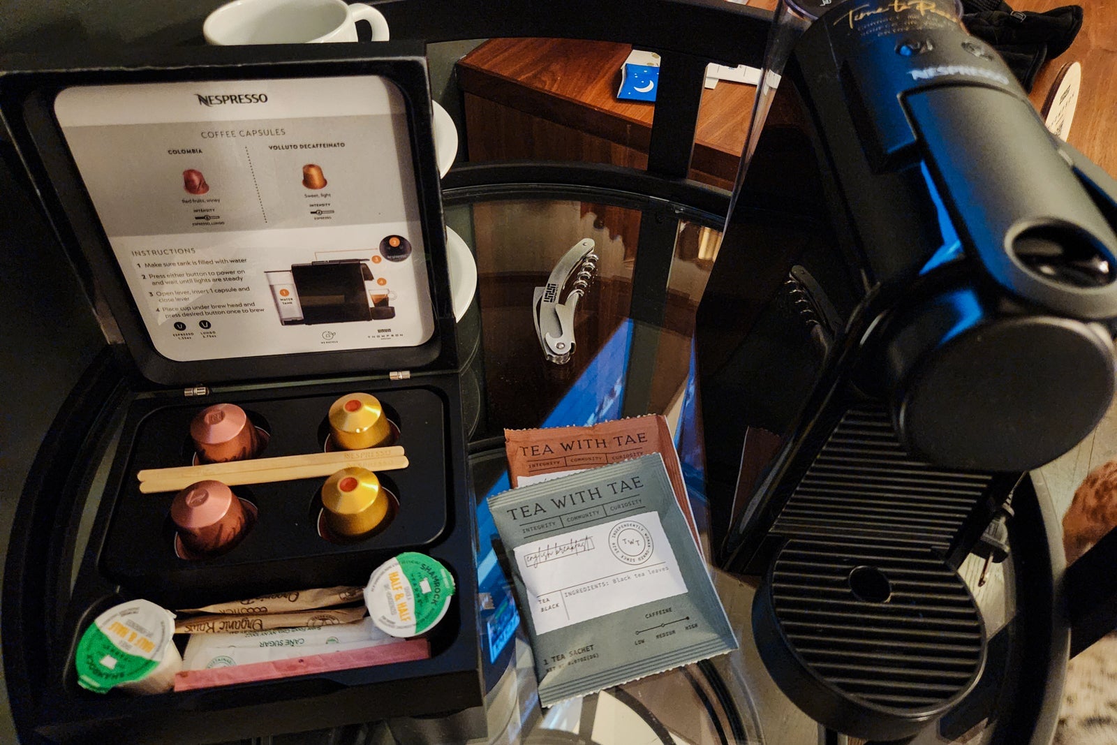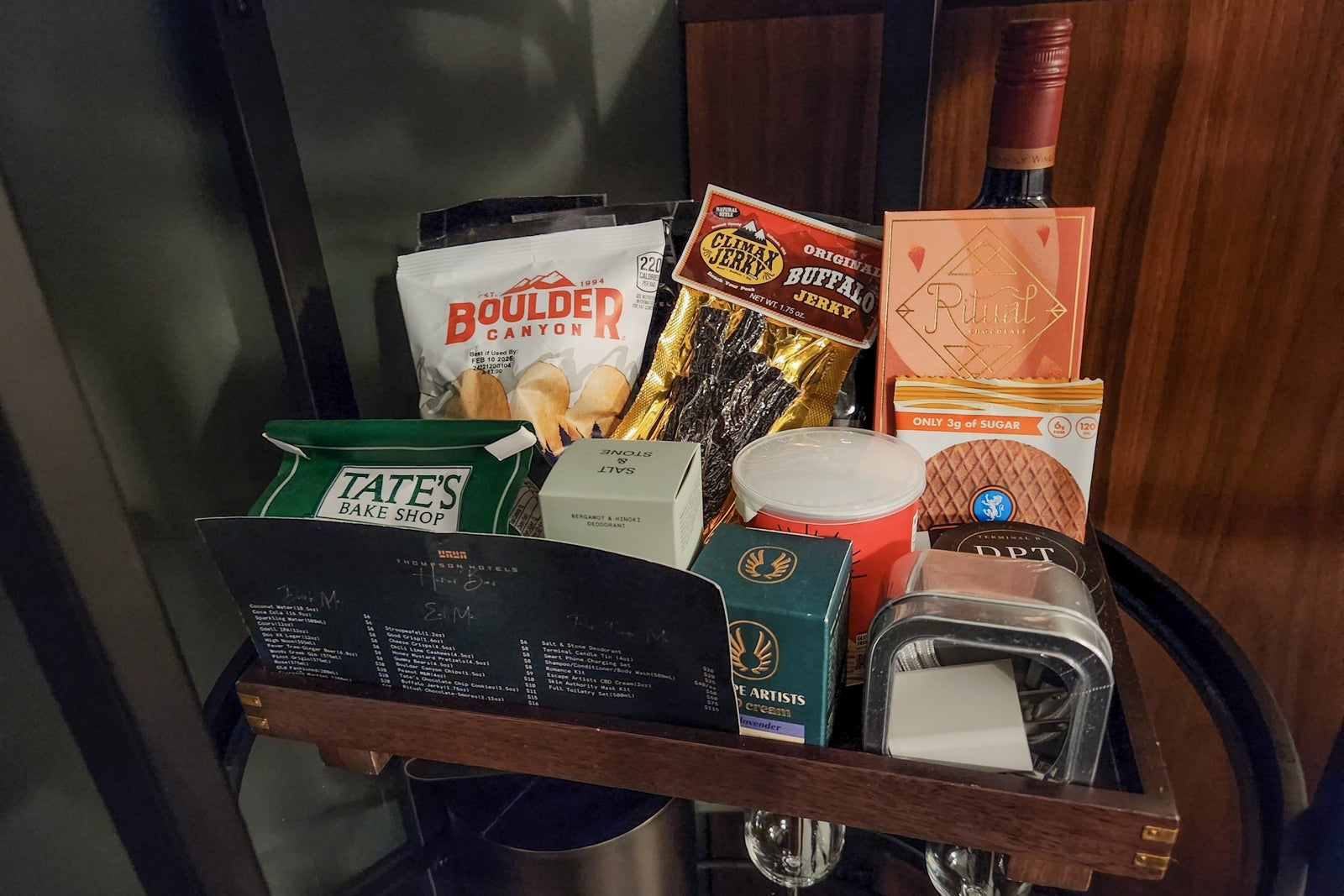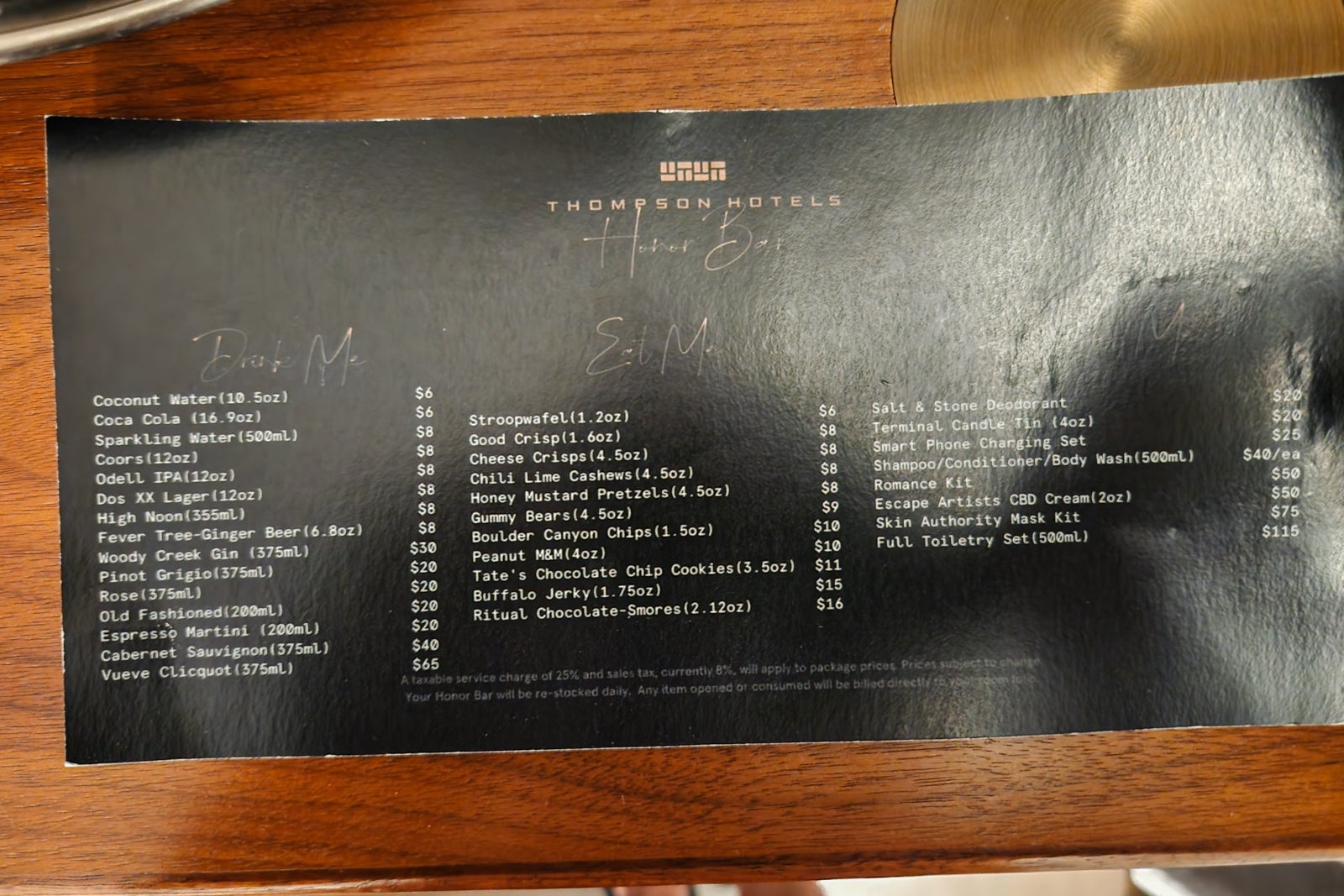 Besides the usual coffee/tea station, the room was loaded with snacks, drinks and other handy items available for purchase. Prices weren't cheap; a few examples include a $10 bag of kettle chips, a $16 chocolate bar, $20 canned cocktails and a $25 smartphone charging kit. I appreciated the notes included in the snack tray explaining how much each item cost, which some hotels leave out.
