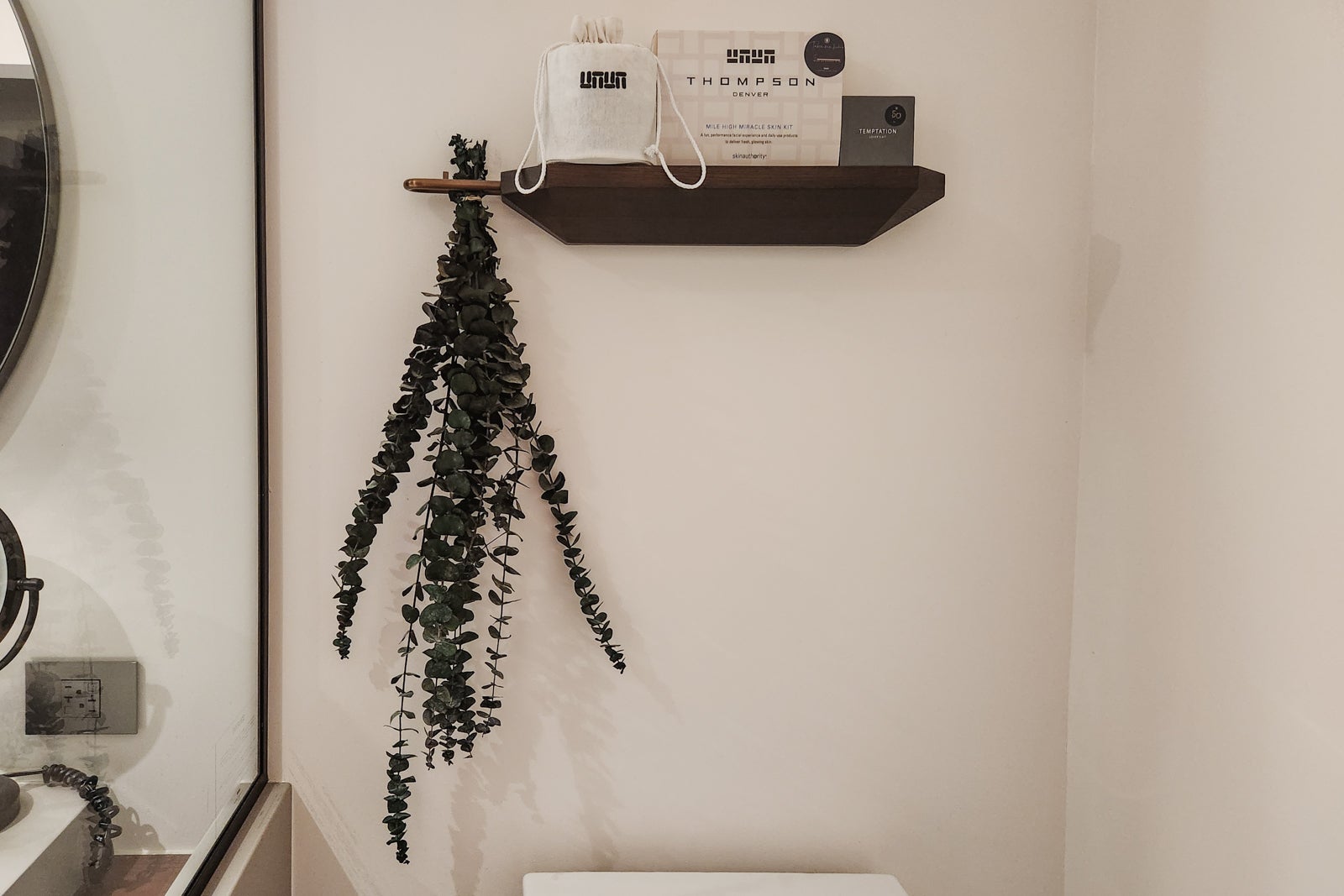 Dried eucalyptus hanging over the toilet added a spa-like touch and a light fragrance.