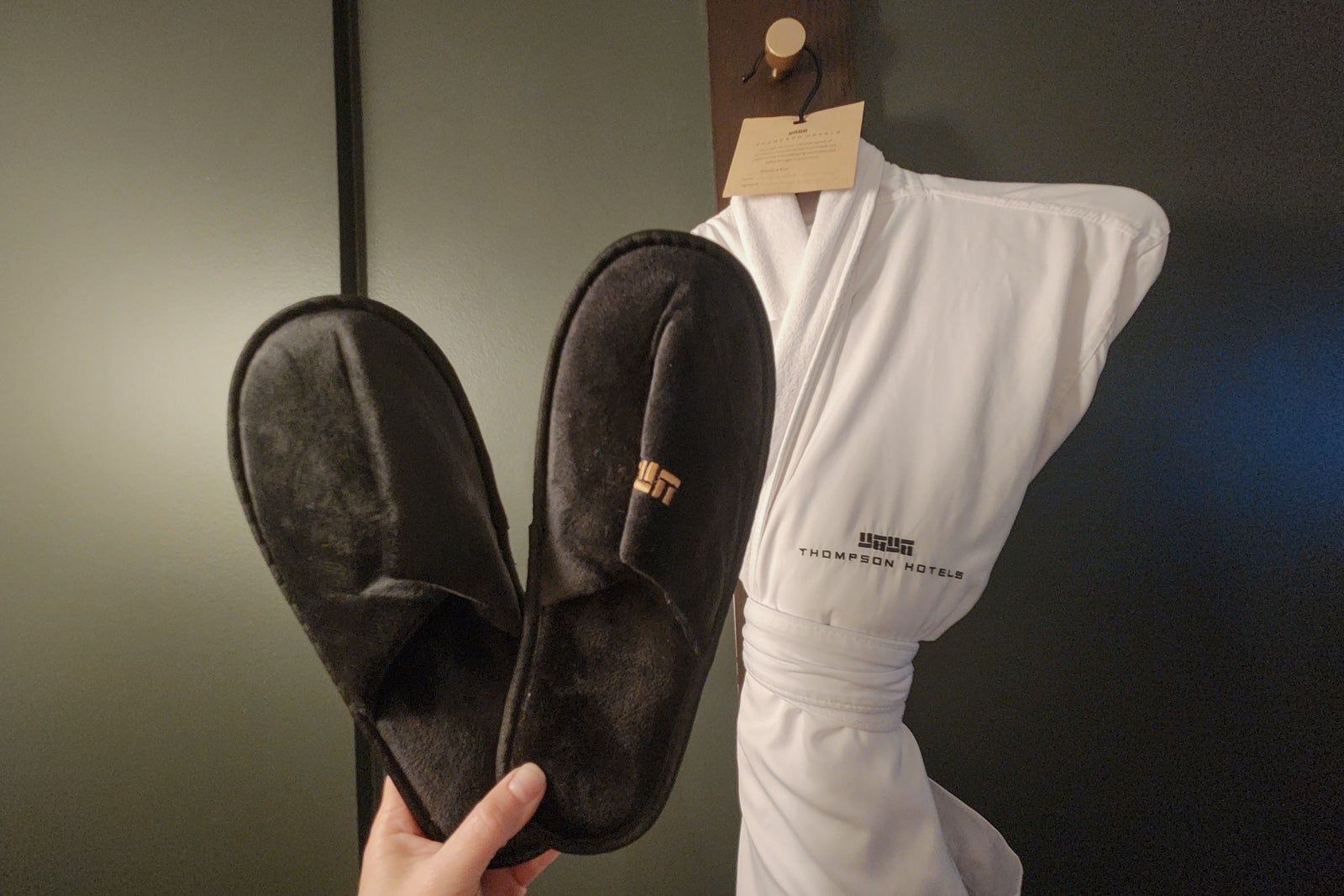 There were two bathrobes waiting for me, along with a pair of velvety slippers.