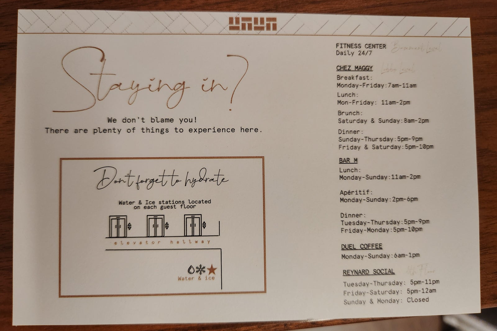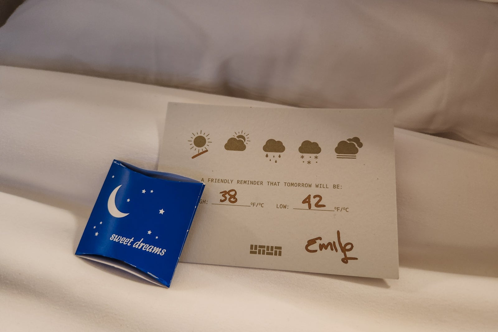 I arrived to find a piece of chocolate on the bed and a handwritten note with the weather forecast for the next day. Another note listed the hotel's dining venues and their hours, the fitness center hours, and a map showing the location of water and ice stations on each floor.