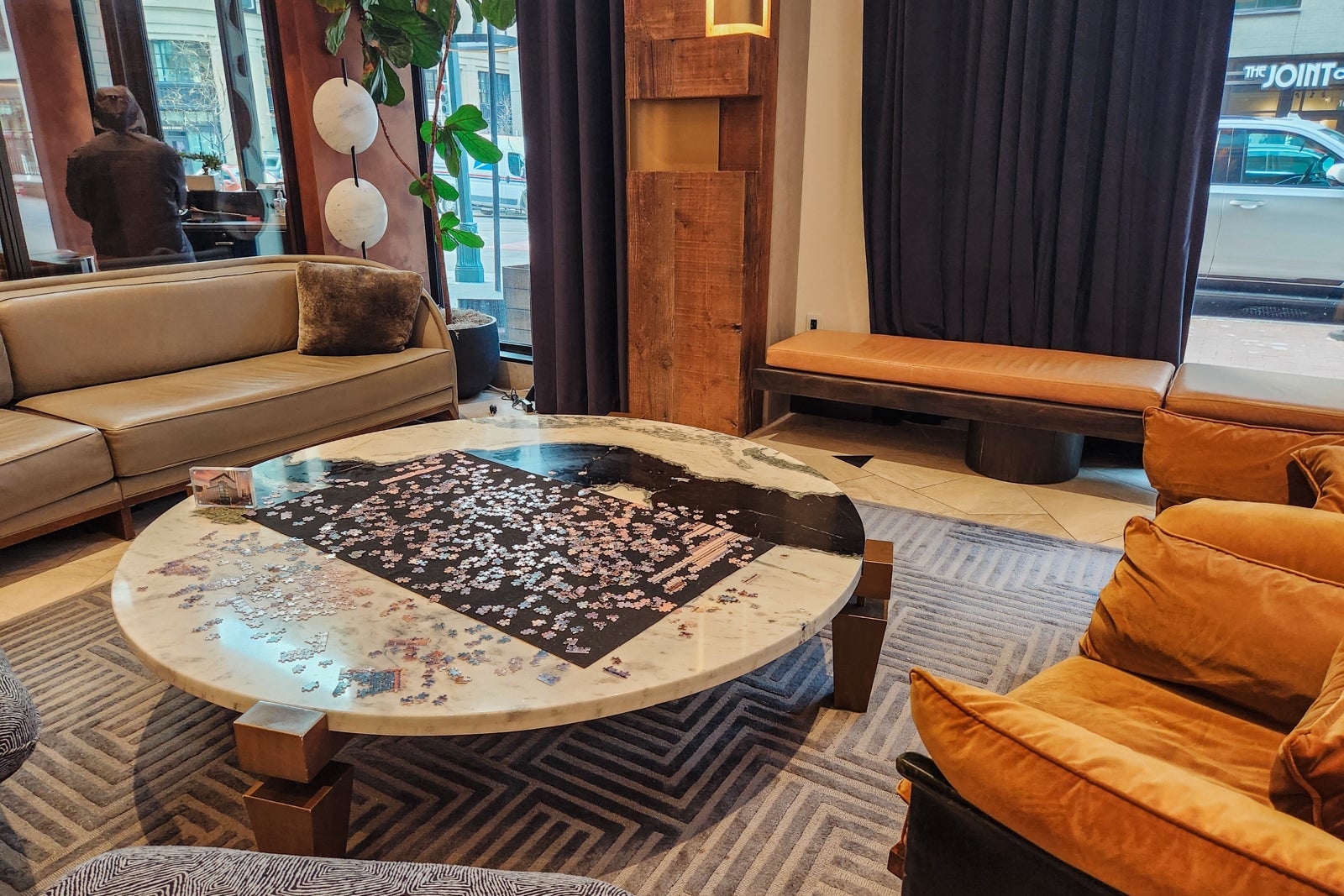 The rooms and common spaces draw from a palette of earth tones, with elements like wood, marble and leather adding to the natural feel. Contemporary art pieces and industrial light fixtures keep the decor from feeling old or fusty, and fun touches like a puzzle in the lobby and snacks at check-in add to the approachable vibe.