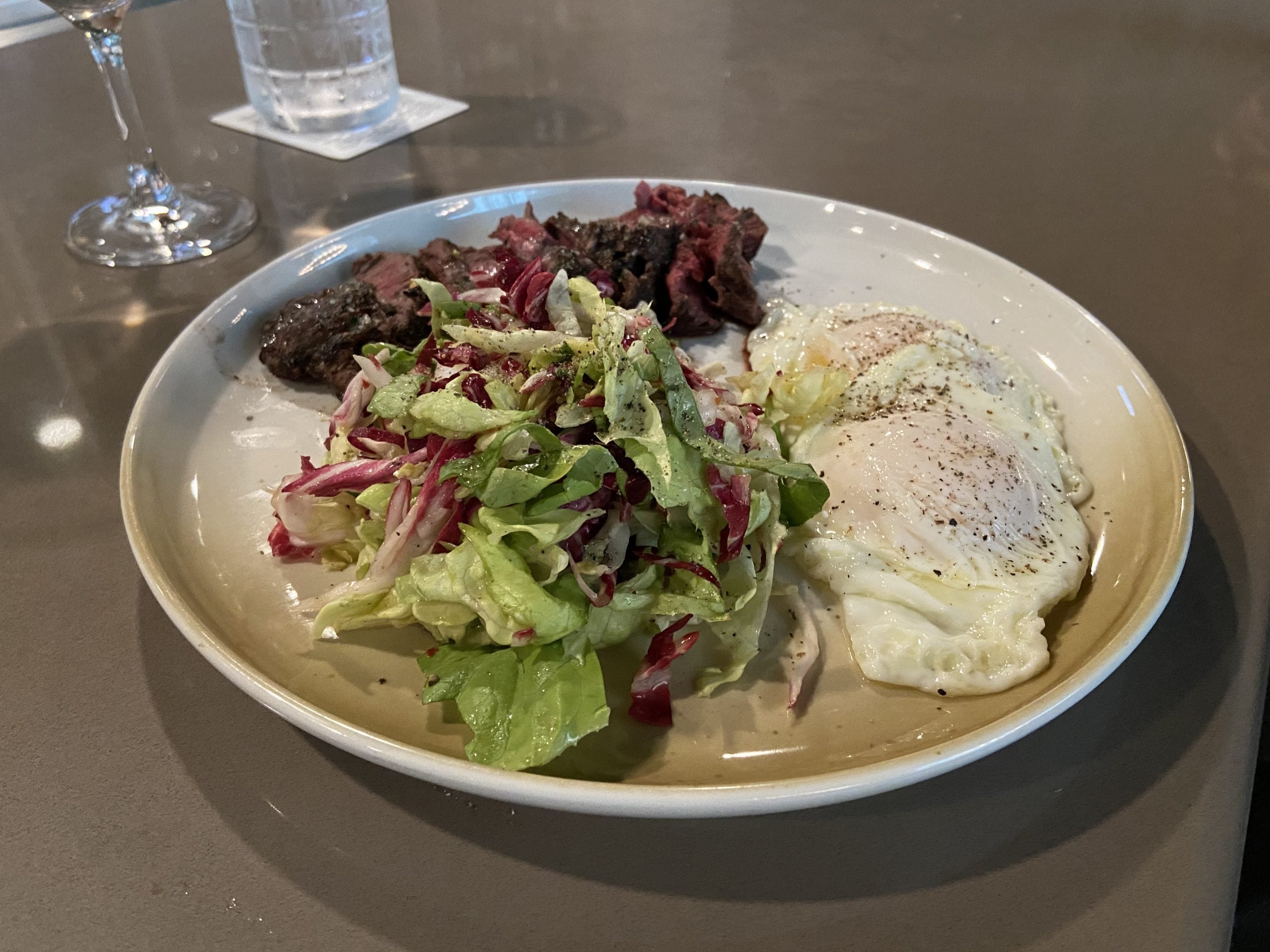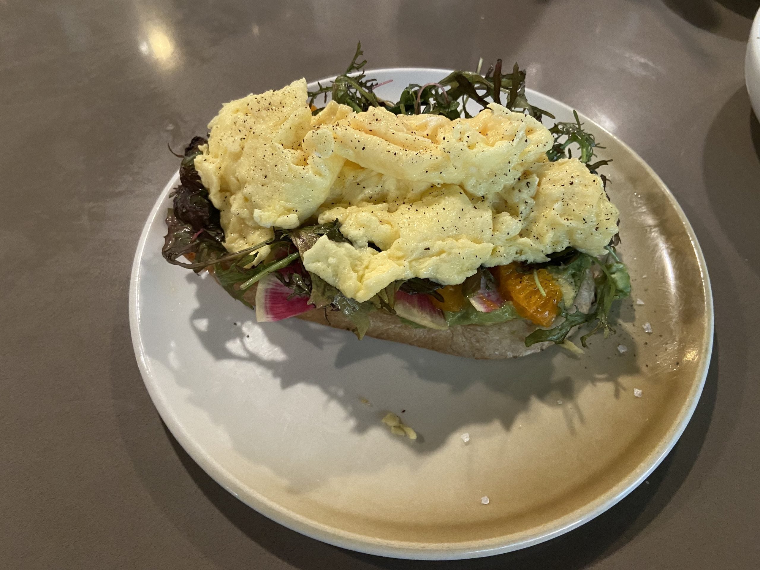 For brunch, I ordered the avocado toast with eggs and a bowl of the best stone-ground grits I've ever had. My sister had the wagyu petite tender with eggs over easy and a chicory salad.