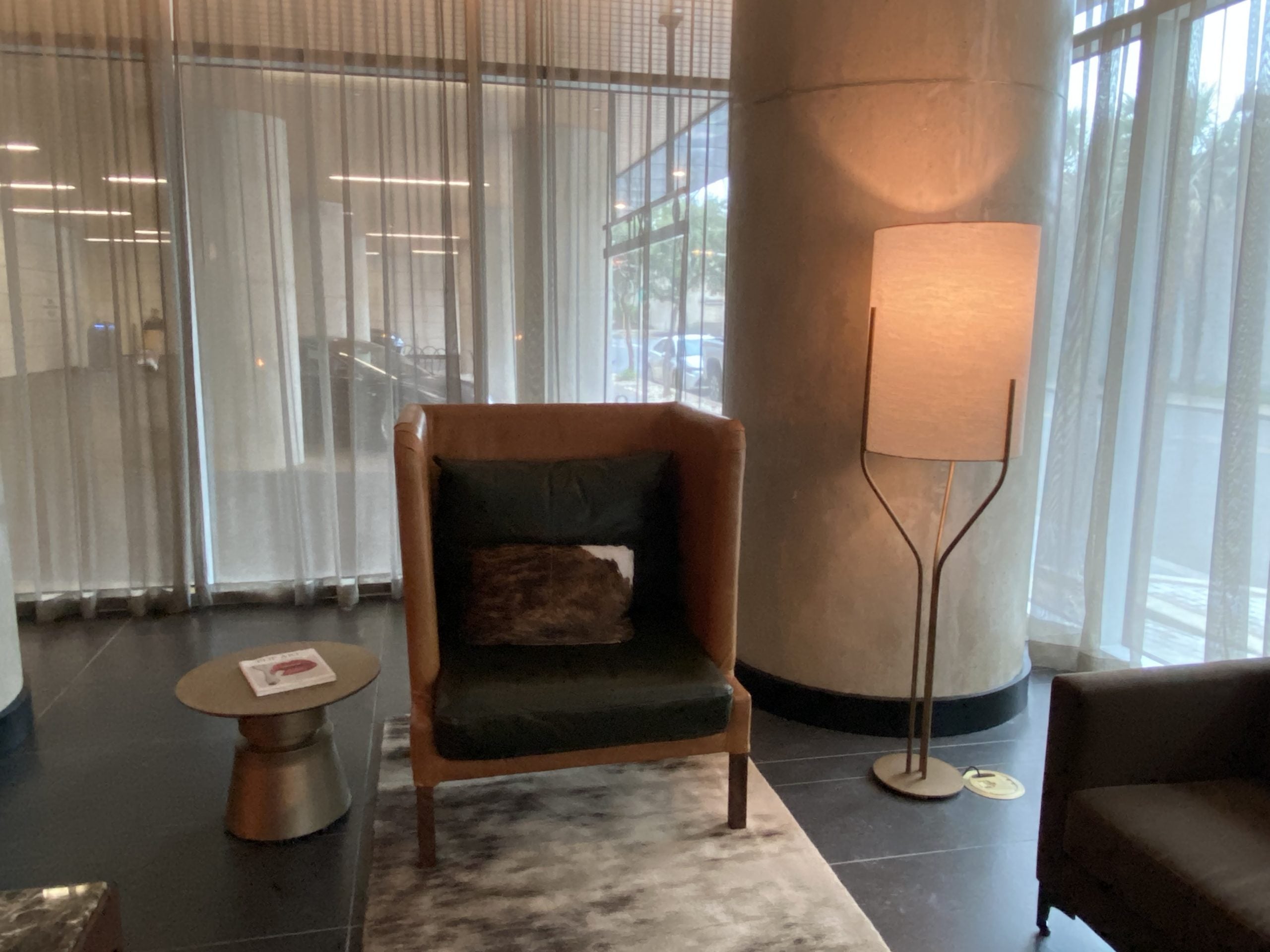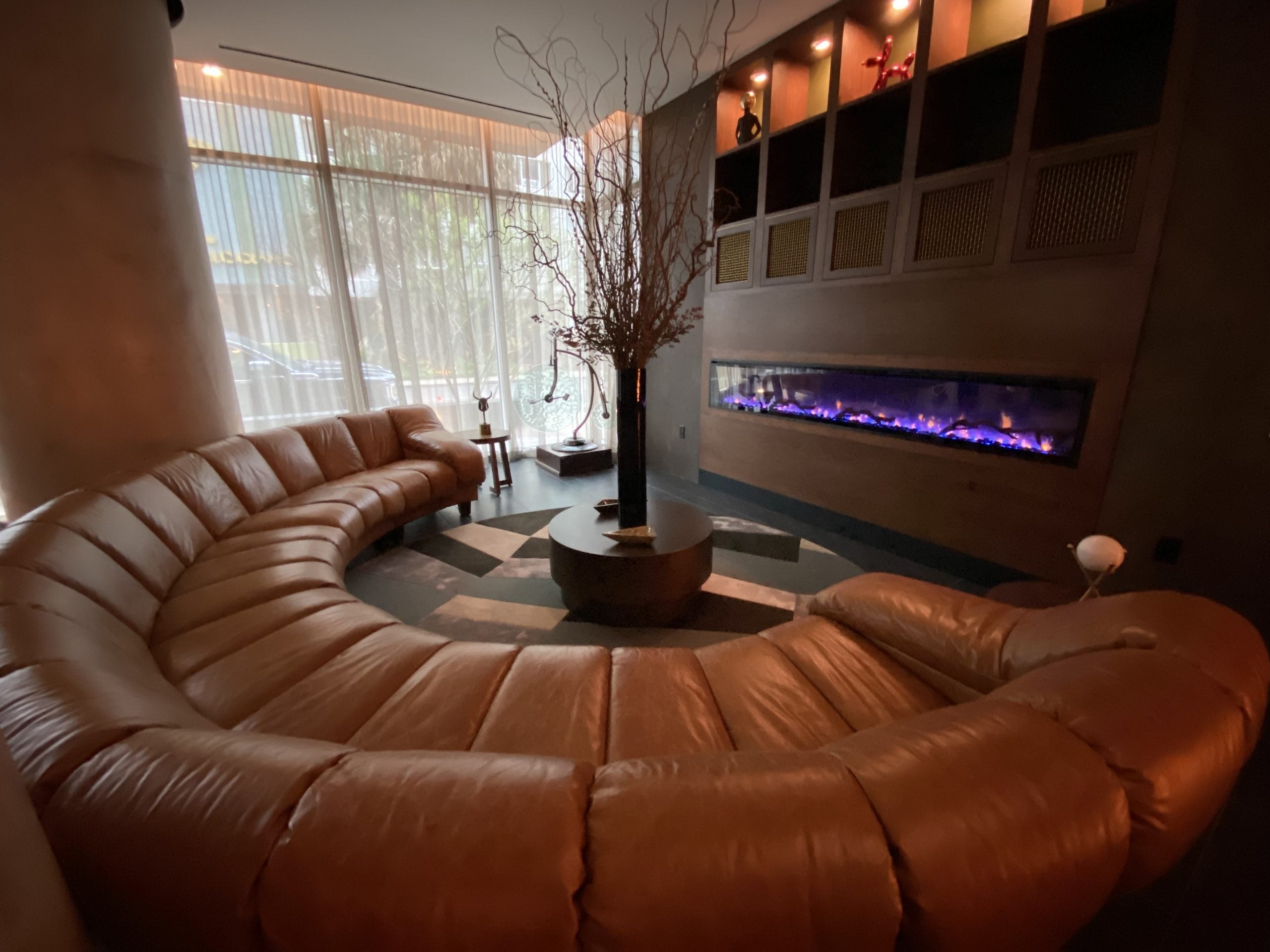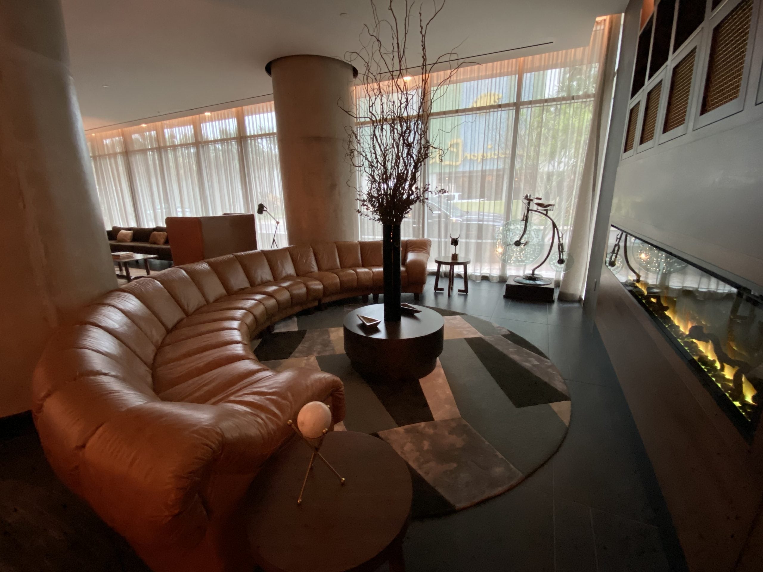 The lobby had an eclectic mix of comfortable seating, including a long padded bench across from the check-in desk, privacy chairs that remind you of those in American Express Centurion lounges and long sofas, with cow-hair throw pillows throughout. There was an expansive curved leather sofa in front of a long gas fireplace and shelves full of books. The concierge desk was made of a unique carved stone and glass, with comfortable barrel-shaped wool and brass chairs.