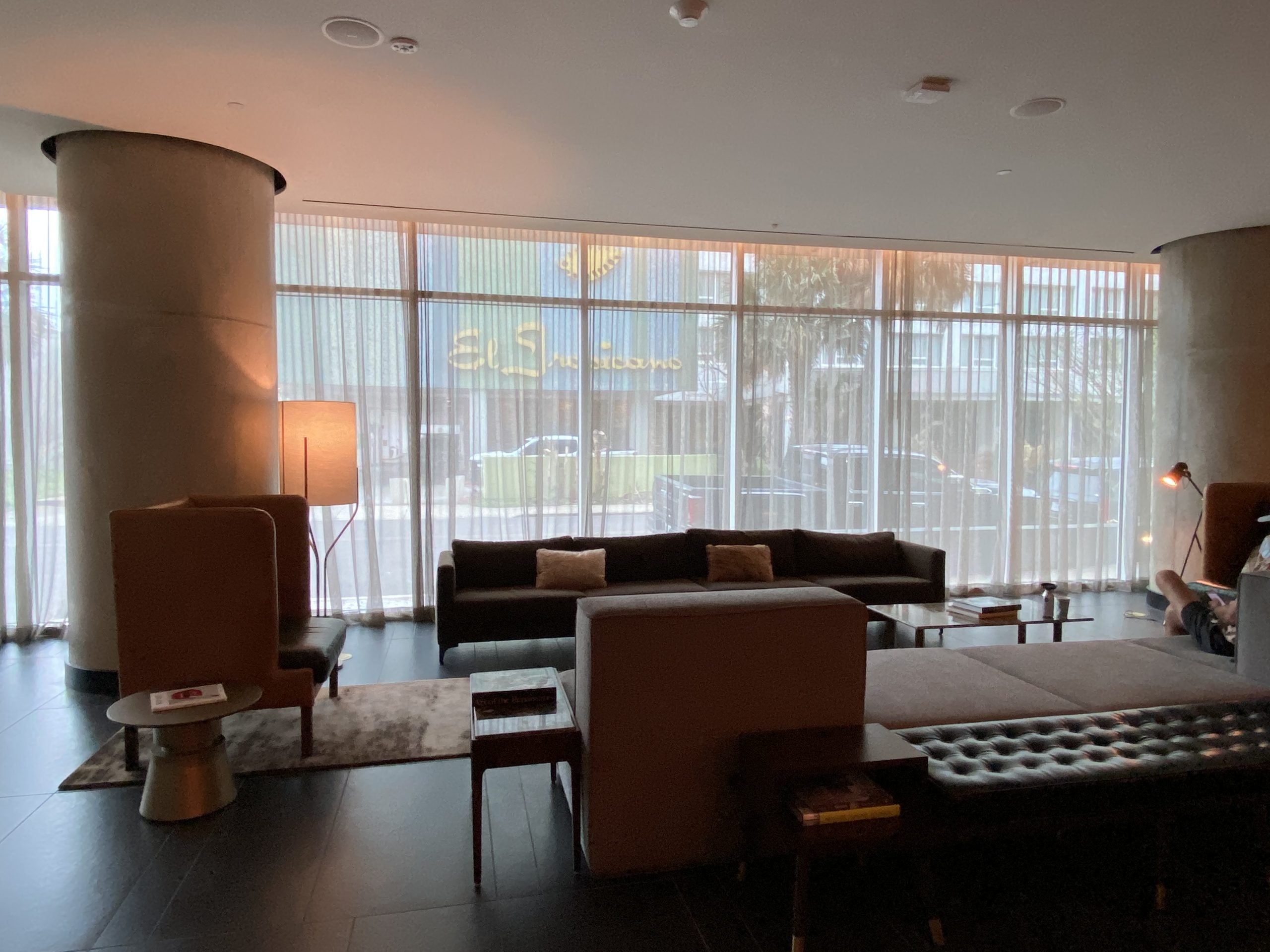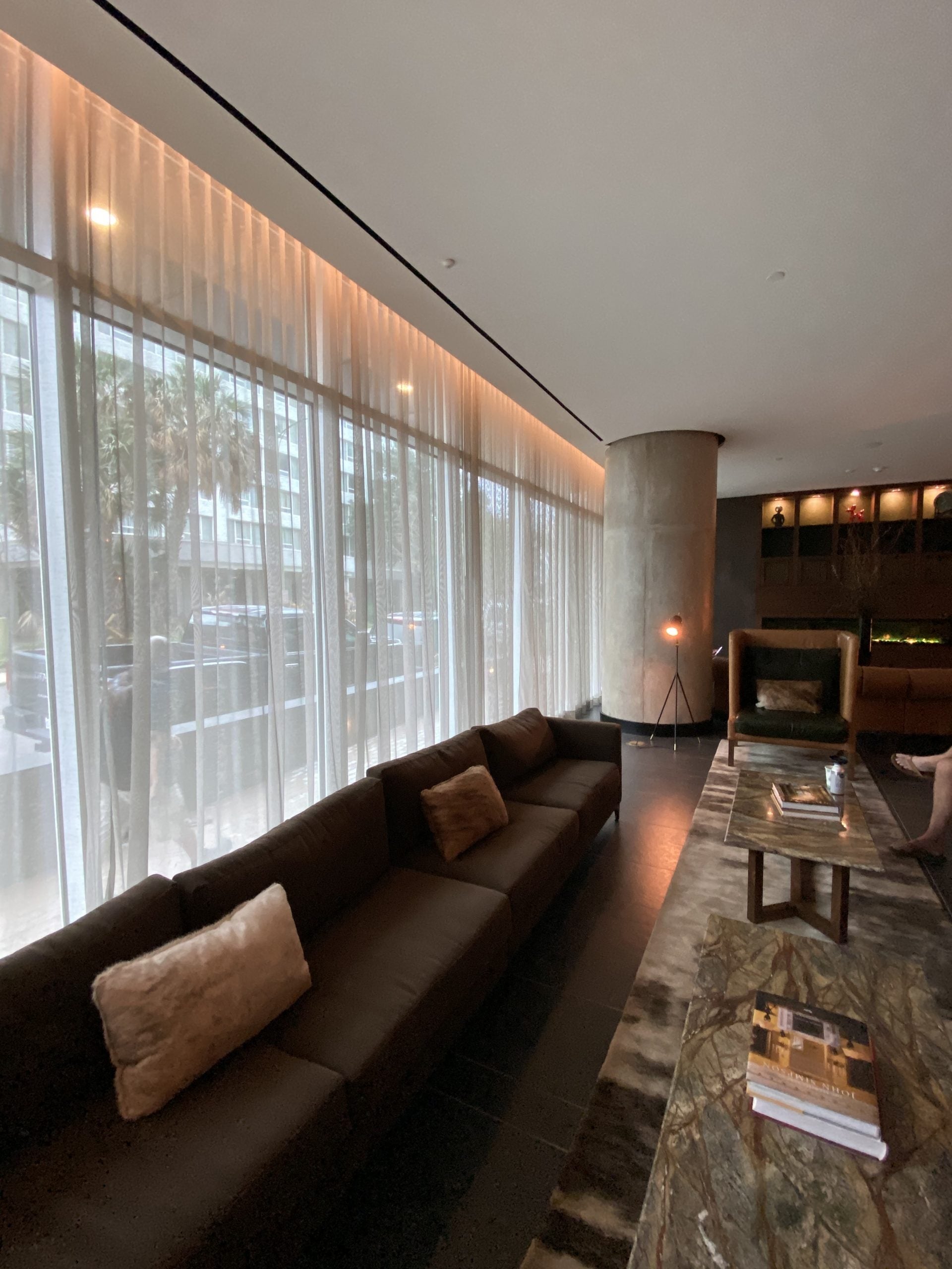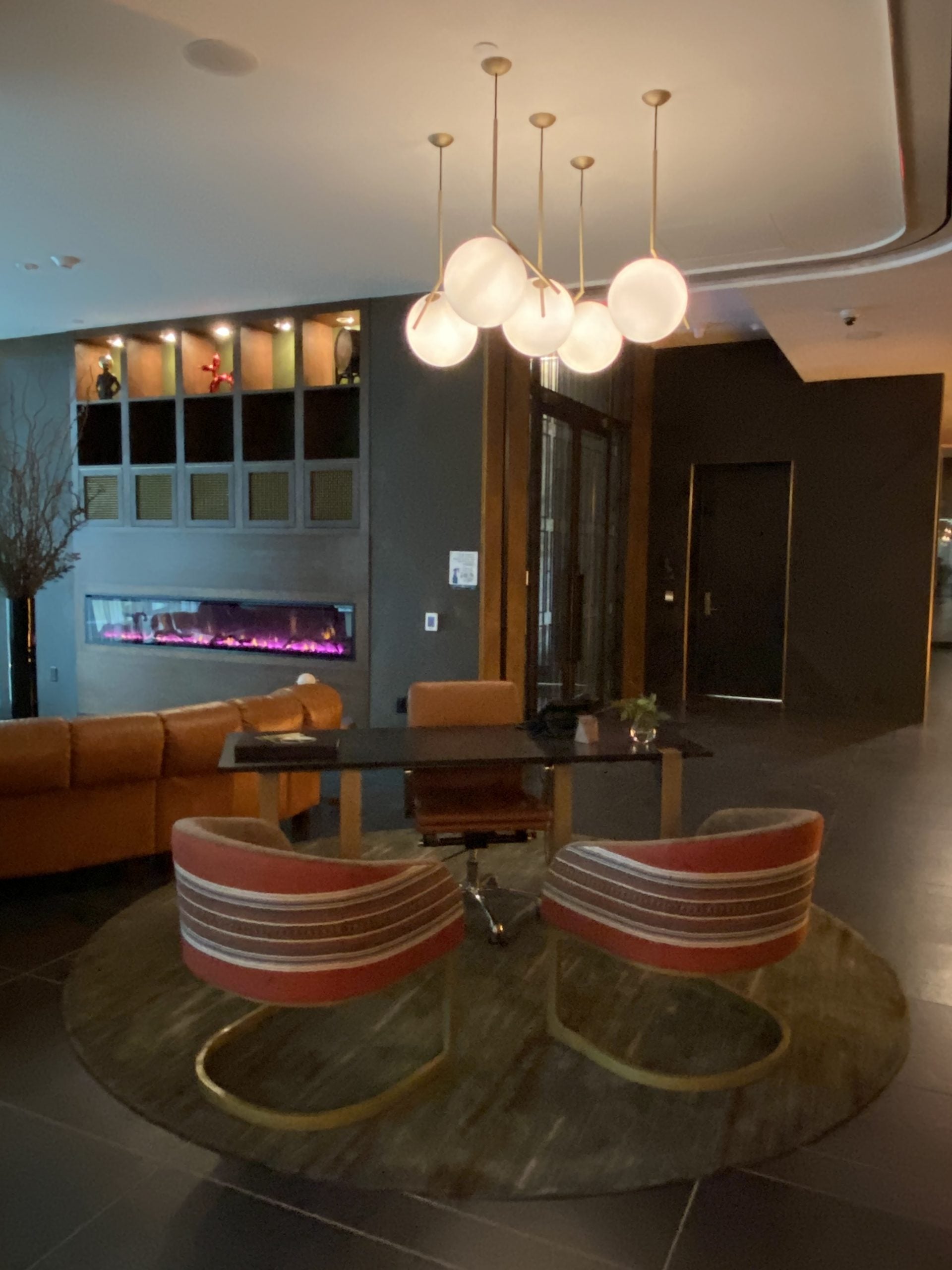 The lobby had an eclectic mix of comfortable seating, including a long padded bench across from the check-in desk, privacy chairs that remind you of those in American Express Centurion lounges and long sofas, with cow-hair throw pillows throughout. There was an expansive curved leather sofa in front of a long gas fireplace and shelves full of books. The concierge desk was made of a unique carved stone and glass, with comfortable barrel-shaped wool and brass chairs.