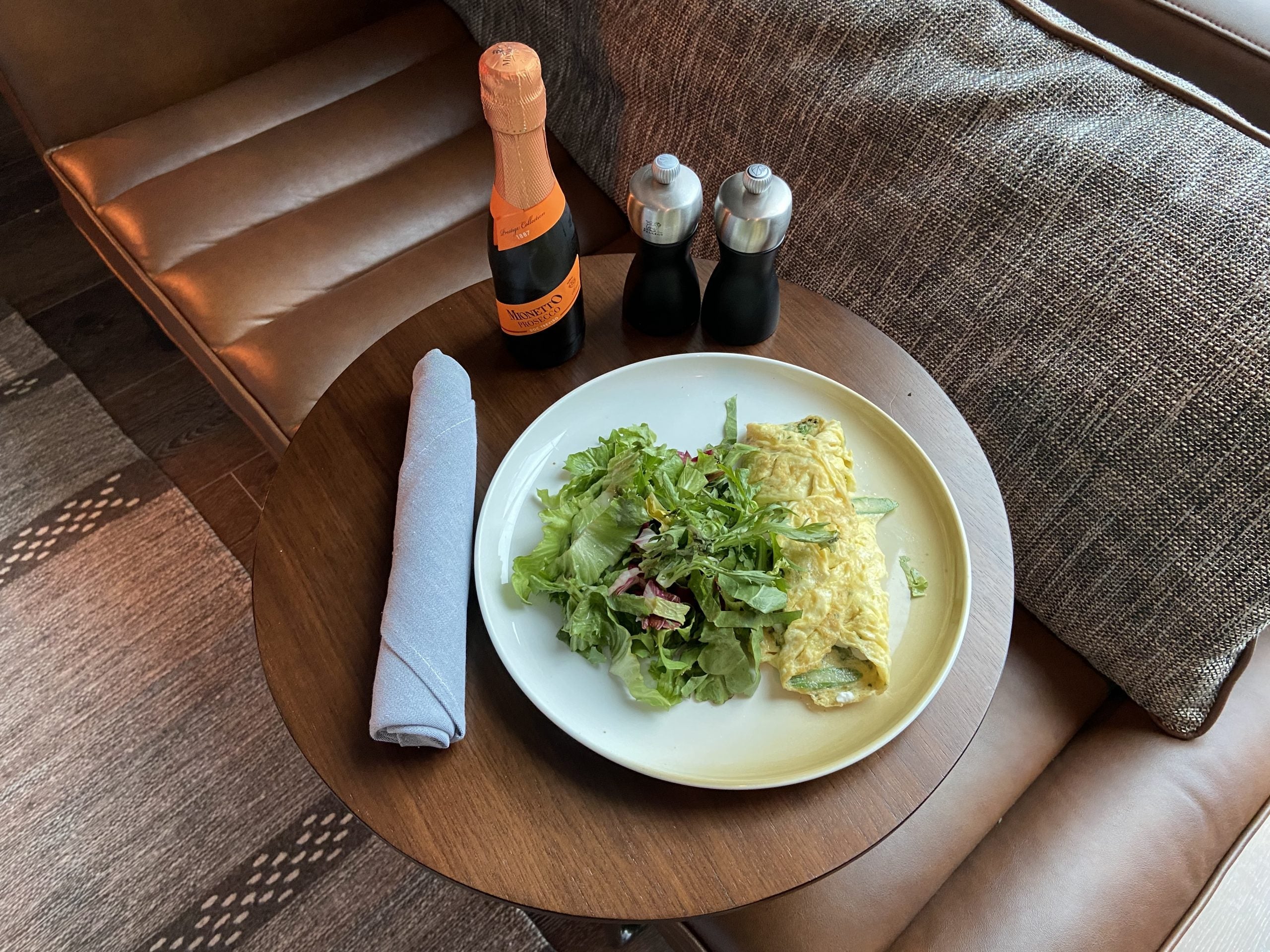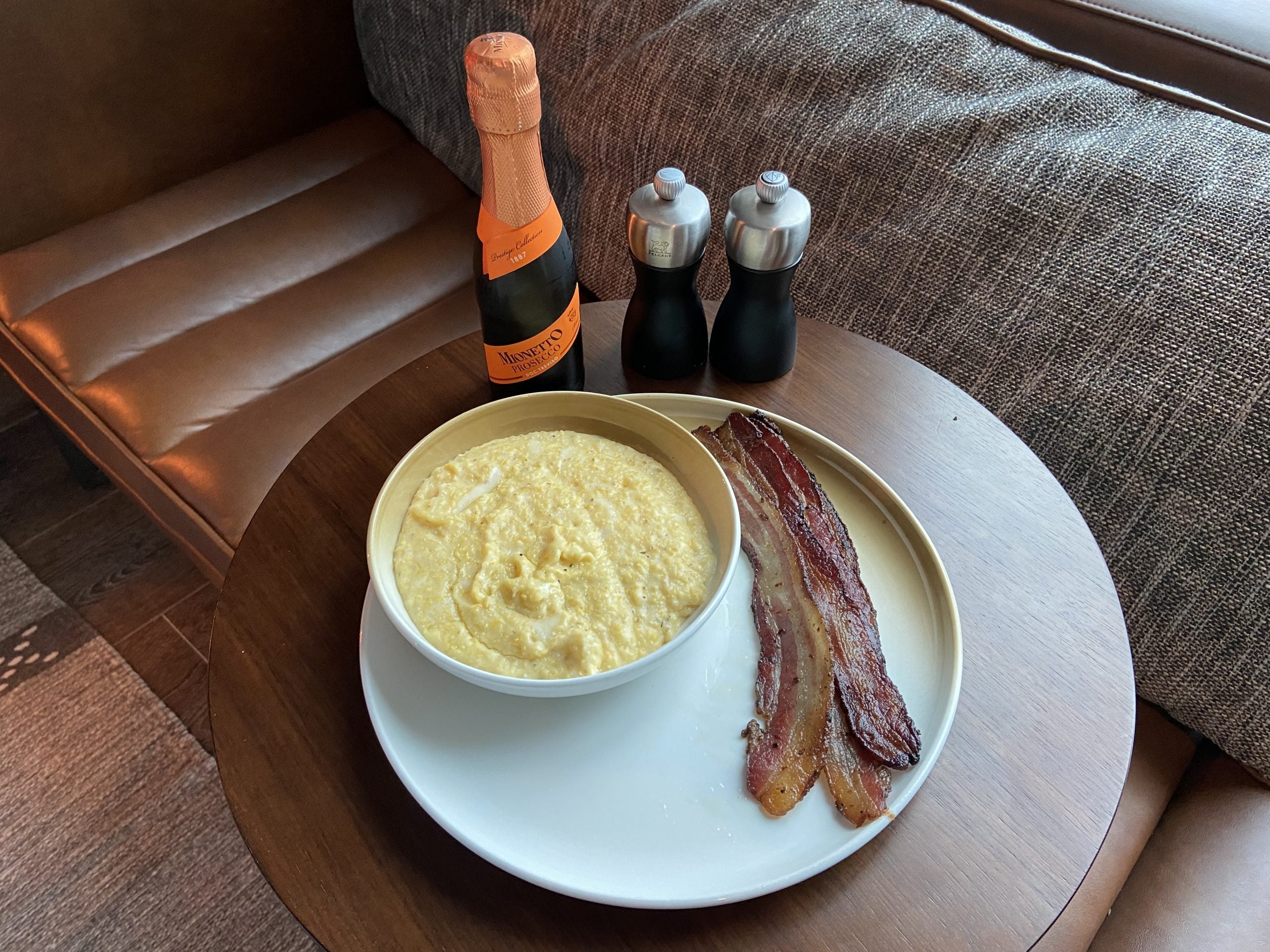 We tested out room service, which was handled by Landrace restaurant. There was no menu; instead, I used my smartphone to see the menu. I kept it simple, ordering those great stone-ground grits with a side of bacon. The front desk gave us complimentary mini bottles of prosecco.