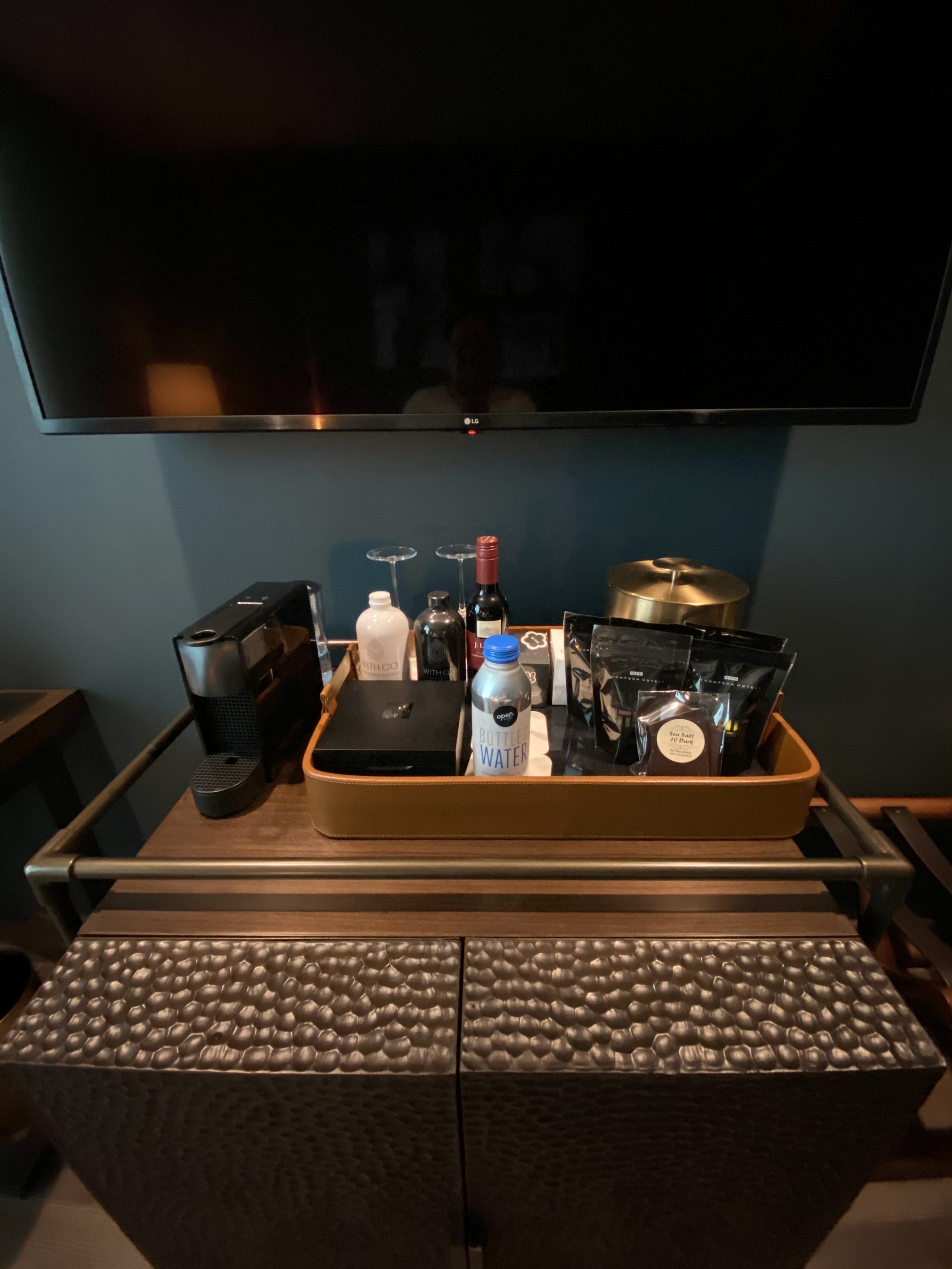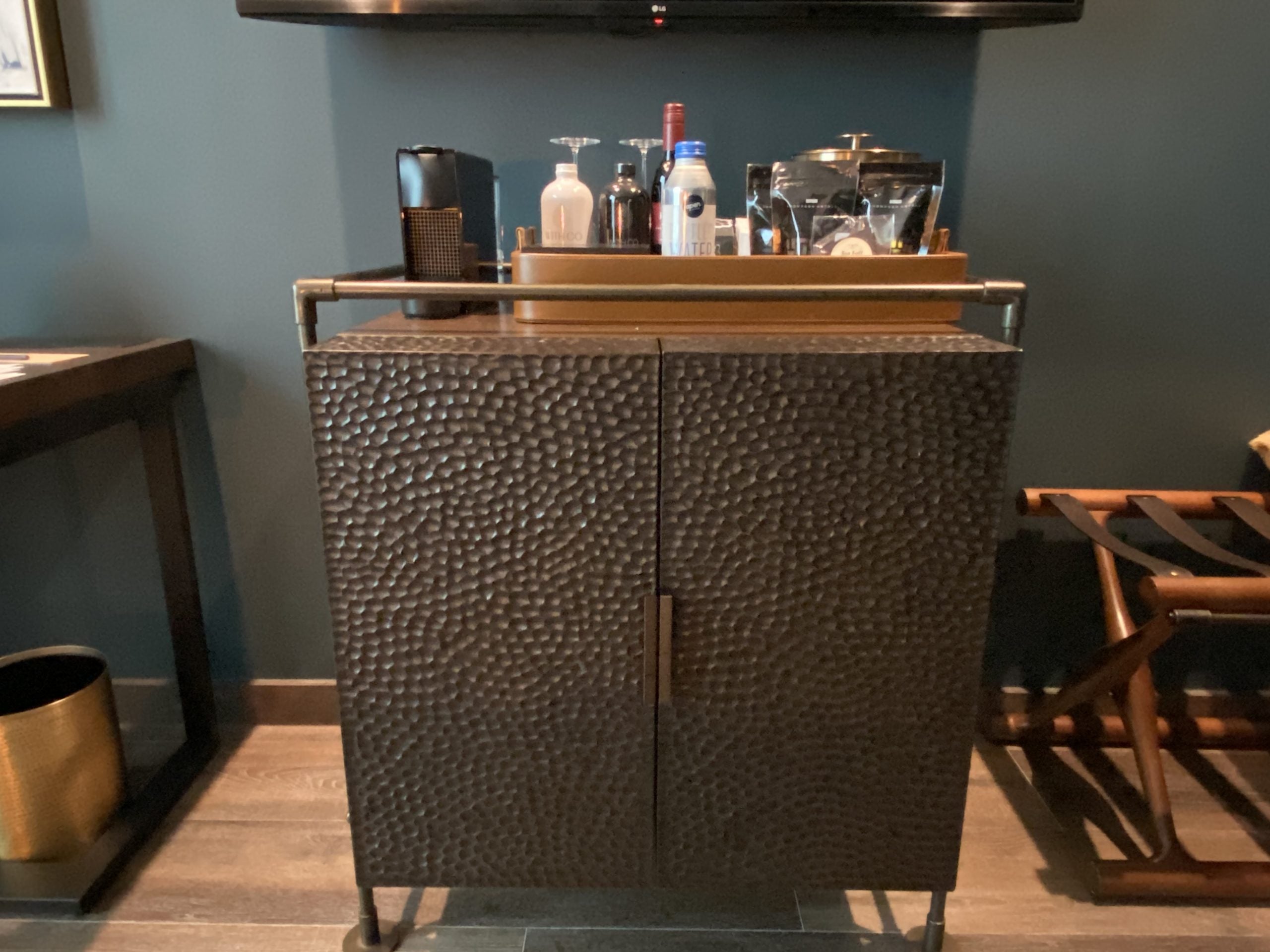 The minibar was a sleek, hammered metal storage cabinet. On top was a beverage and snack bar, featuring regional goodies from brands such as Dallas-based Ranch Water and Austin's craft-distilled Saint Liberty Bertie's Bourbon Whiskey along with a Nespresso coffee machine.