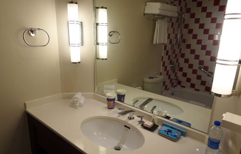 A relatively large closet held multiple hangers, and one of my favorite perks, Toy Story themed laundry bags and slippers. Surprisingly, the mini-fridge was not stocked, aside from the two complimentary bottles of water I received daily — much appreciated since the temperature was over 100° Fahrenheit in Shanghai when I was there.