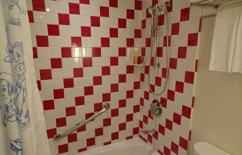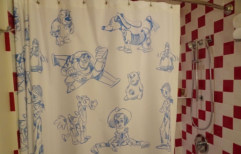 The combination shower/bath was decked out in red and white tiles, with the shower curtain showing various characters from the film, like Andy, Woody and Buzz Lightyear (more on that later).