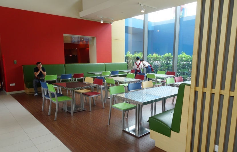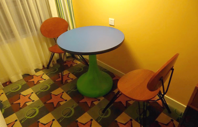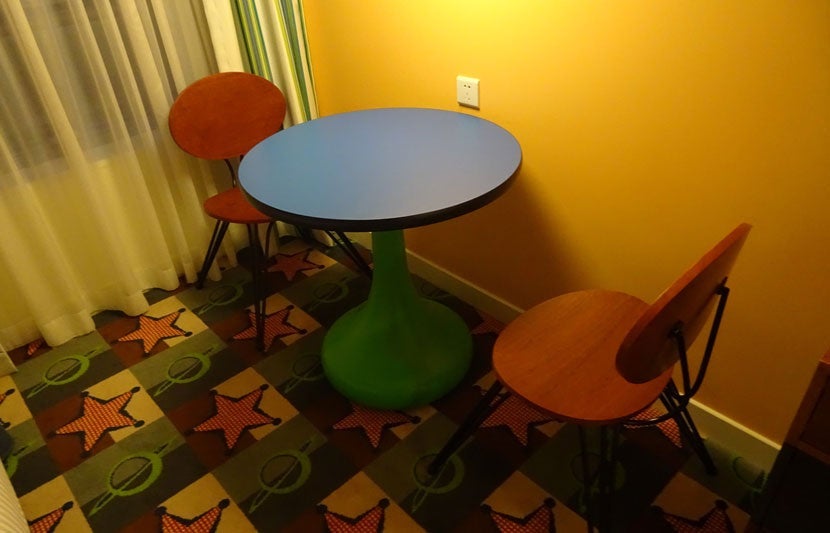 Even though the room isn't very large, the designers found a way to fit in a small, colorful table with a couple of wooden chairs — they were very uncomfortable and I wouldn't recommend sitting in them for more than a few minutes if you're planning to get work done.