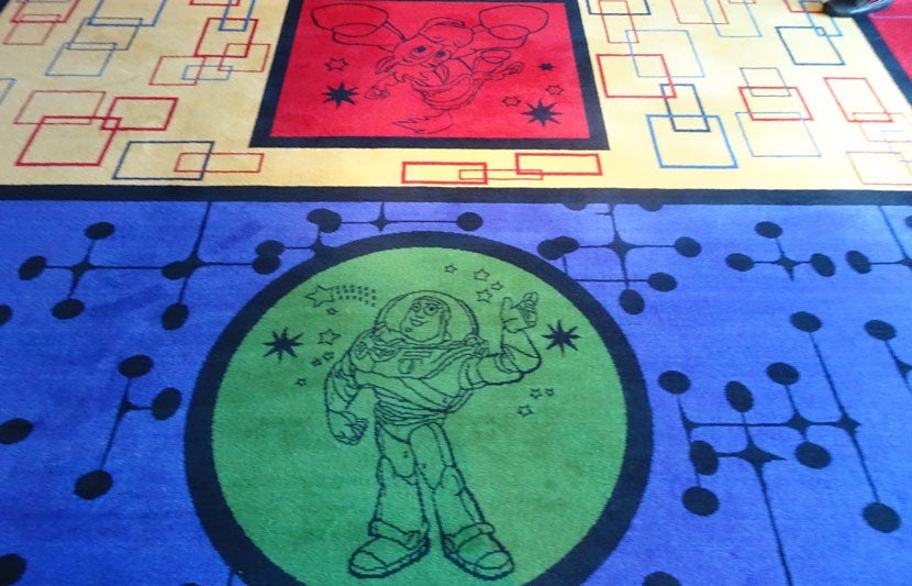 The carpeting that welcomes you after you leave the elevators was made up of multiple patterns showing Buzz and his friends in different scenes and colors.