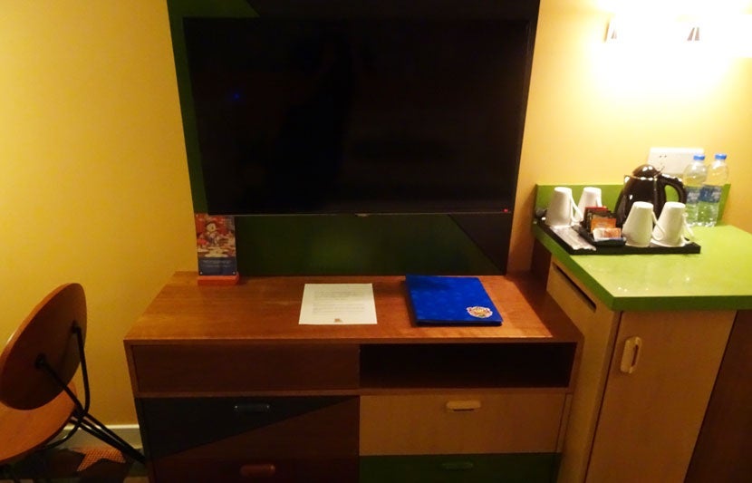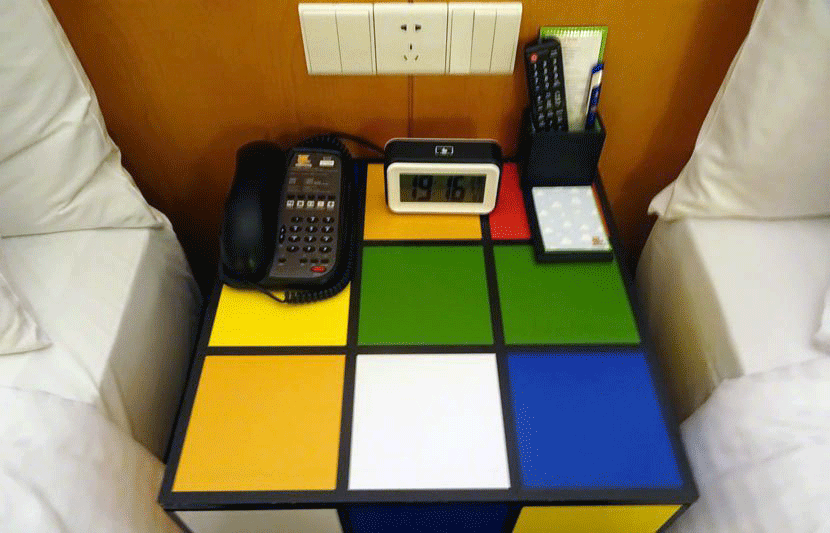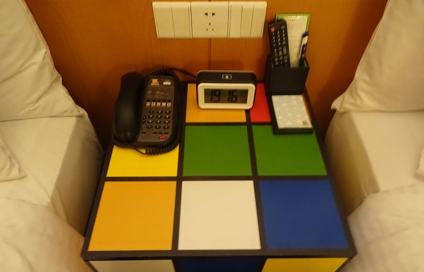 The nightstand was bright and colorful, too. Unfortunately the telephone and alarm clock it held were a little dated, which was surprising since the hotel only opened last summer.