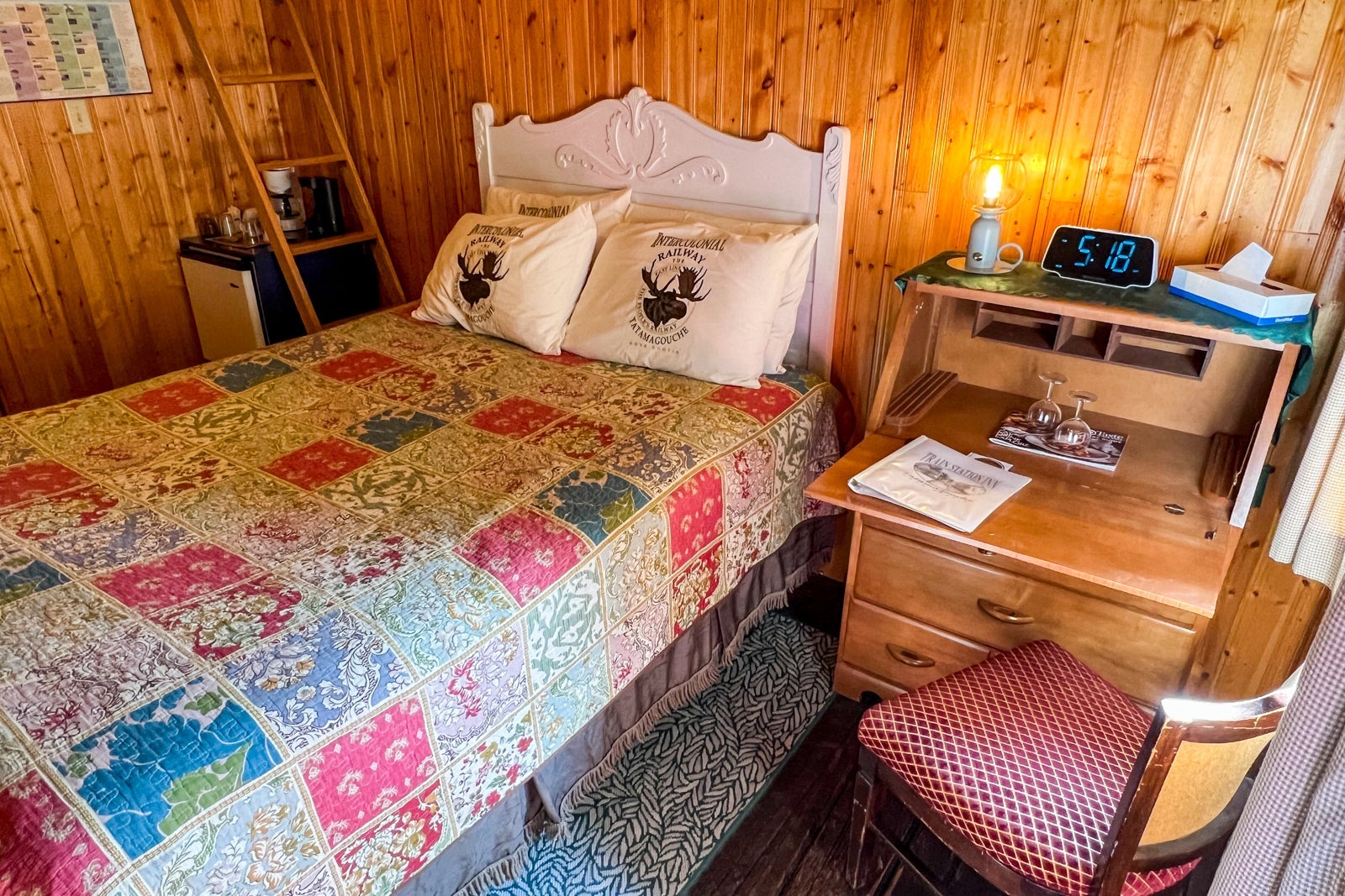 At the front of the car was the bedroom with a comfortable queen-size bed, a dresser and another conductor's chair mounted in the corner. This chair wound up being more decorative than functional, as we never really used it during our stay. However, it was a fun reminder that we were (in fact) sleeping in a train car that used to traverse the country for the Canadian National Railway.