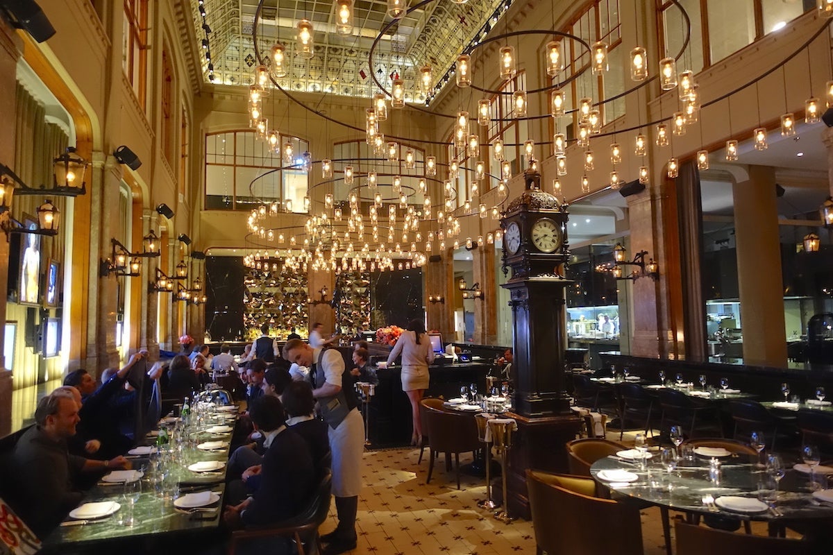 The space is lit by enormous spiral chandeliers, which give it dramatic but romantic ambiance, as well as wall sconces that hark back to 19th-century street lamps. There's a striking standing clock anchoring one side of the room and a statue of Hermes on the other, closer to the bar.