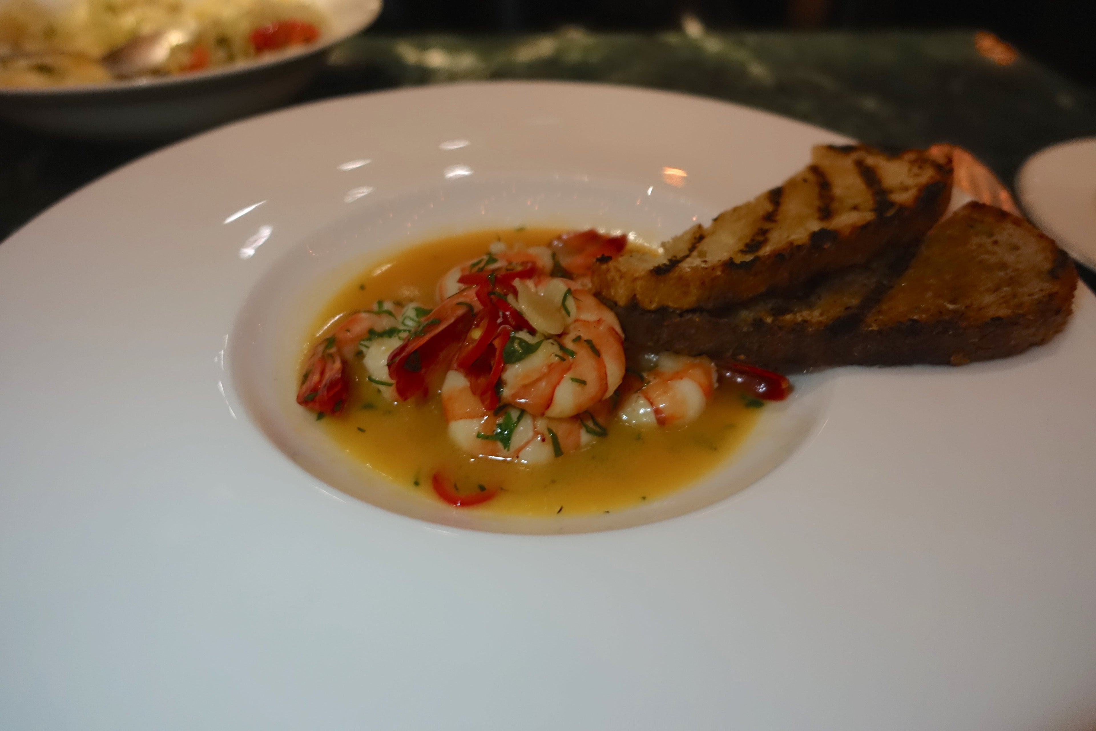 The tables are also an homage to the building's banking past, with classic green marble tops and tufted leather chairs. Here, the focus is on Mediterranean cuisine and seafood. I started with a delicious salad of shaved fennel, pistachio, orange and grapefruit. For my main dish, I tried the prawns in Champagne sauce, which were also delicious. Next time I'd go for one of the fish options, like salt-baked whole sea bass.