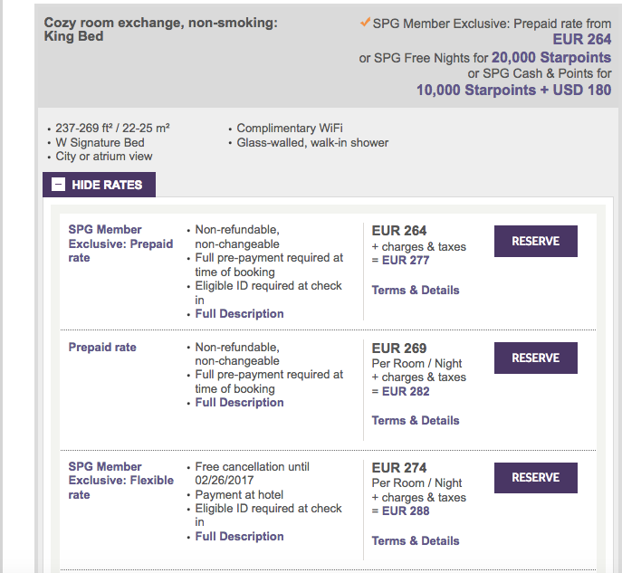 I booked a room in the starter category: a "Cozy Exchange Room" for 277 euros (~$297) including taxes and fees for the night. It's a Starwood Category 6 property, so an award night would have cost 20,000 Starpoints or 10,000 Starpoints plus $180 in taxes and fees and given me a value of between 1.1 and 1.5 cents per point according to TPG's latest valuations. Sorry, but that's not good enough to tempt me to use some of my SPG points stash.