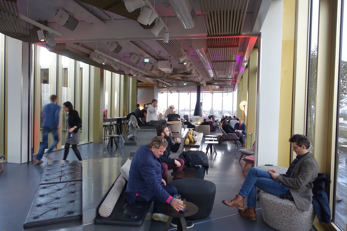 A raised platform ran through the middle of the lounge with chairs and benches on various levels. I felt bad for the staff, who were taking orders and trying not to trip stepping up and down from level to level. On the far side of the bar were several semi-private sitting areas separated from one another by copper poles (another homage to connectivity) and furnished with bright blue and purple sofas.