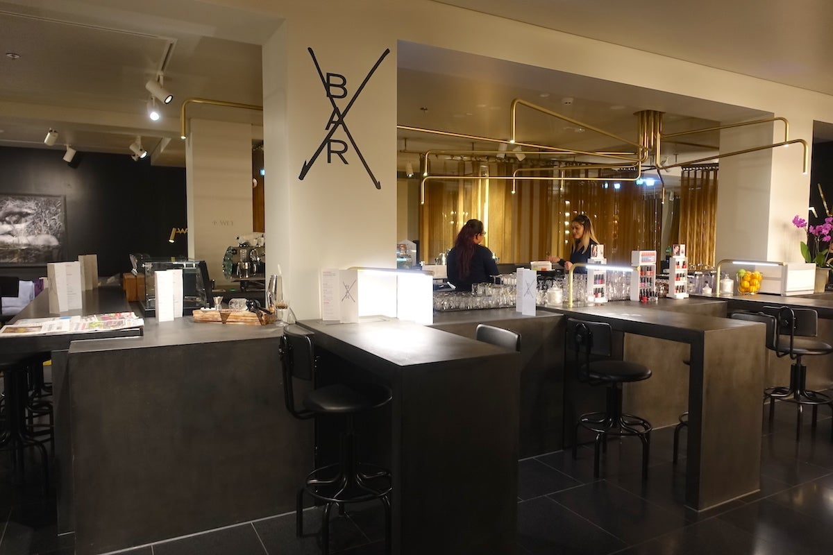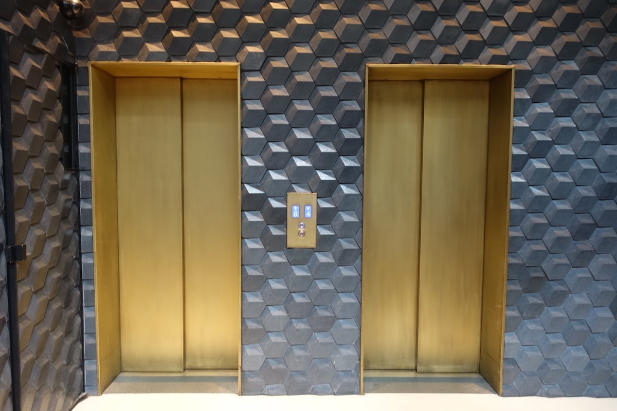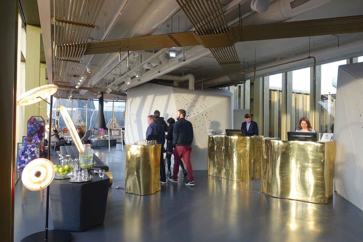 This used to be the building's rooftop, but when it was converted into a hotel, the space was enclosed in a kind of glass box, creating an entirely new floor. No other guests were at the shimmering metallic check-in desks, so I was greeted immediately, and as soon as the agent looked up my reservation, she thanked me for being an SPG Gold member and offered me a glass of water or Cava.
