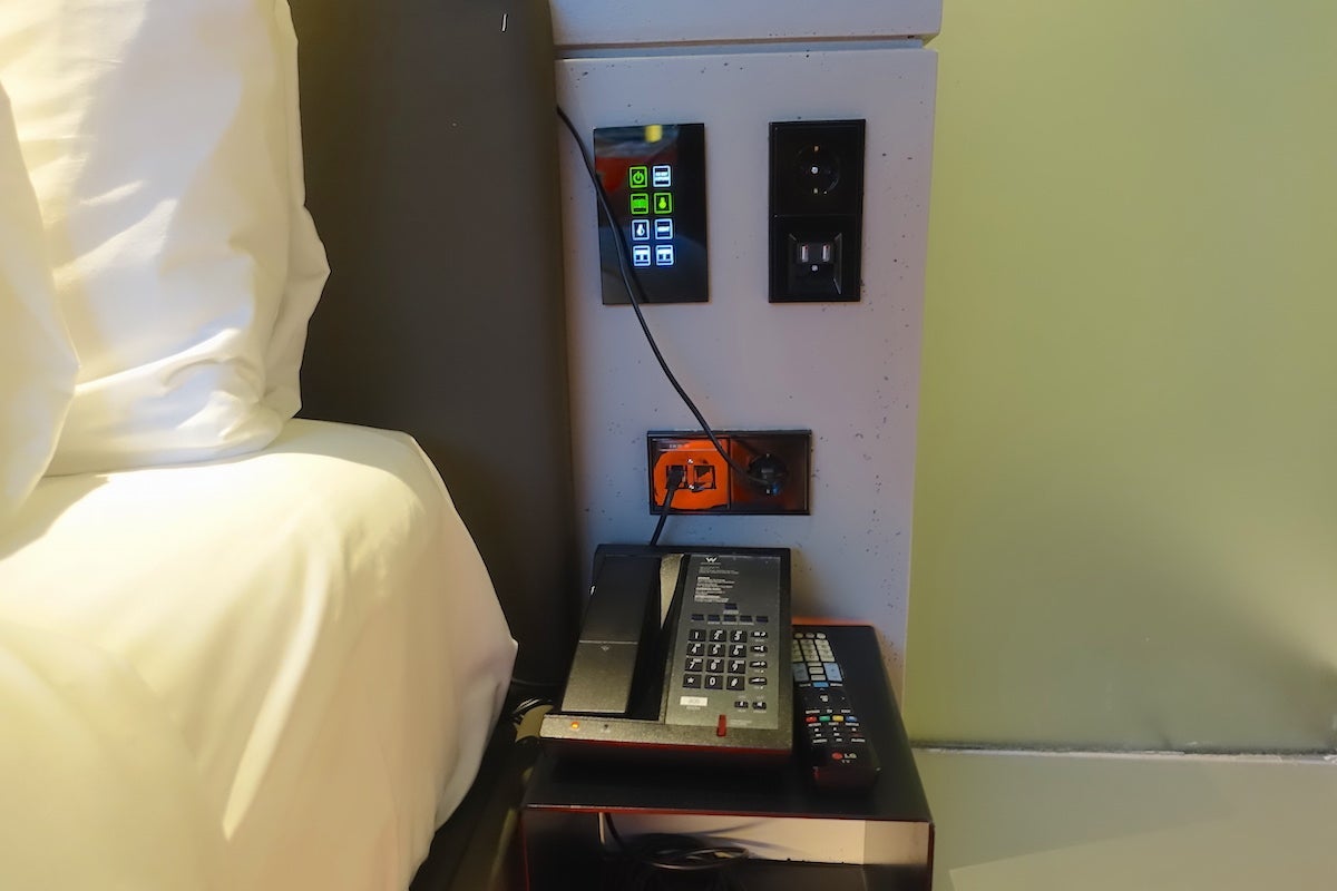 One of the bedside panels also held a variety of outlets for charging electronics. There was no desk to speak of; instead, there was a sort of high swivel chair tucked into the counter that doubled as the bathroom sink. I would highly suggest not putting your computer or phone up there in case you're a sink splasher.