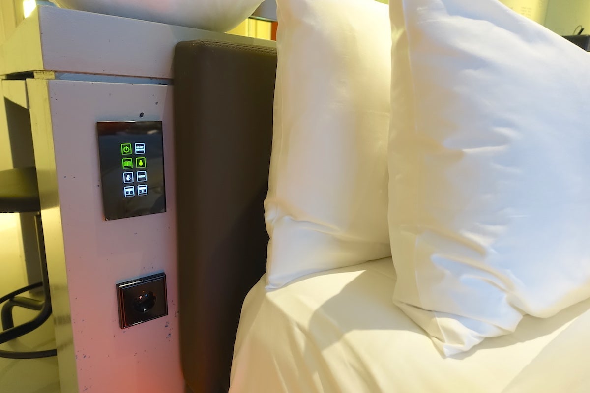 The bed was dressed in white sheets and topped with a gray blanket featuring patterns made up of words from bedtime stories. It looked welcoming, and I have to say, I got a great night's sleep. It was the right mix of firmness and cushioning, and I woke up in a makeshift nest of all the pillows. The shades as well as the lights, air conditioning and do not disturb/housekeeping signs were all controlled by electronic touch panels throughout the room, including next to the bed.