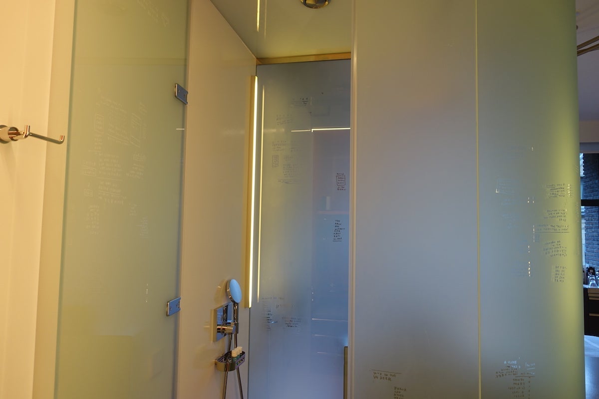 Next to the vanity was the shower, which was a glass chamber covered with quotes about life, travel and other whimsical thoughts, all etched into the otherwise frosted glass. Its design was meant to evoke the old phone booths that once dotted Amsterdam — another subtle reminder that this building used to be the telephone exchange. The floor inside the shower was sort of strange because it was composed of big stone tiles that were not quite fixed into place, and water drained out in the cracks between them. The shower heads were controlled by buttons — simply press on, then press off — making them easier to use than most other hotel showers. As is standard with W hotels, the bath products are from Bliss.