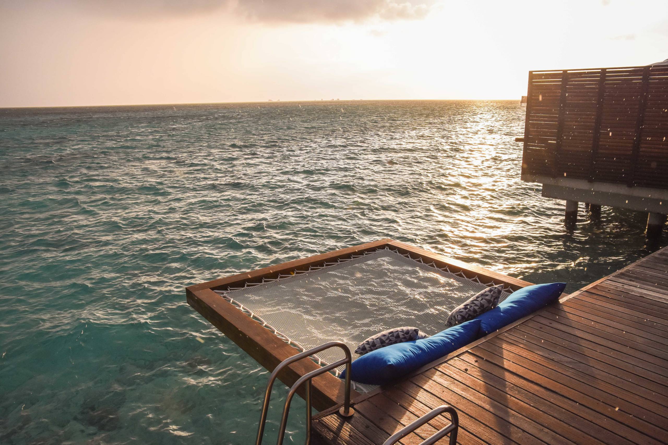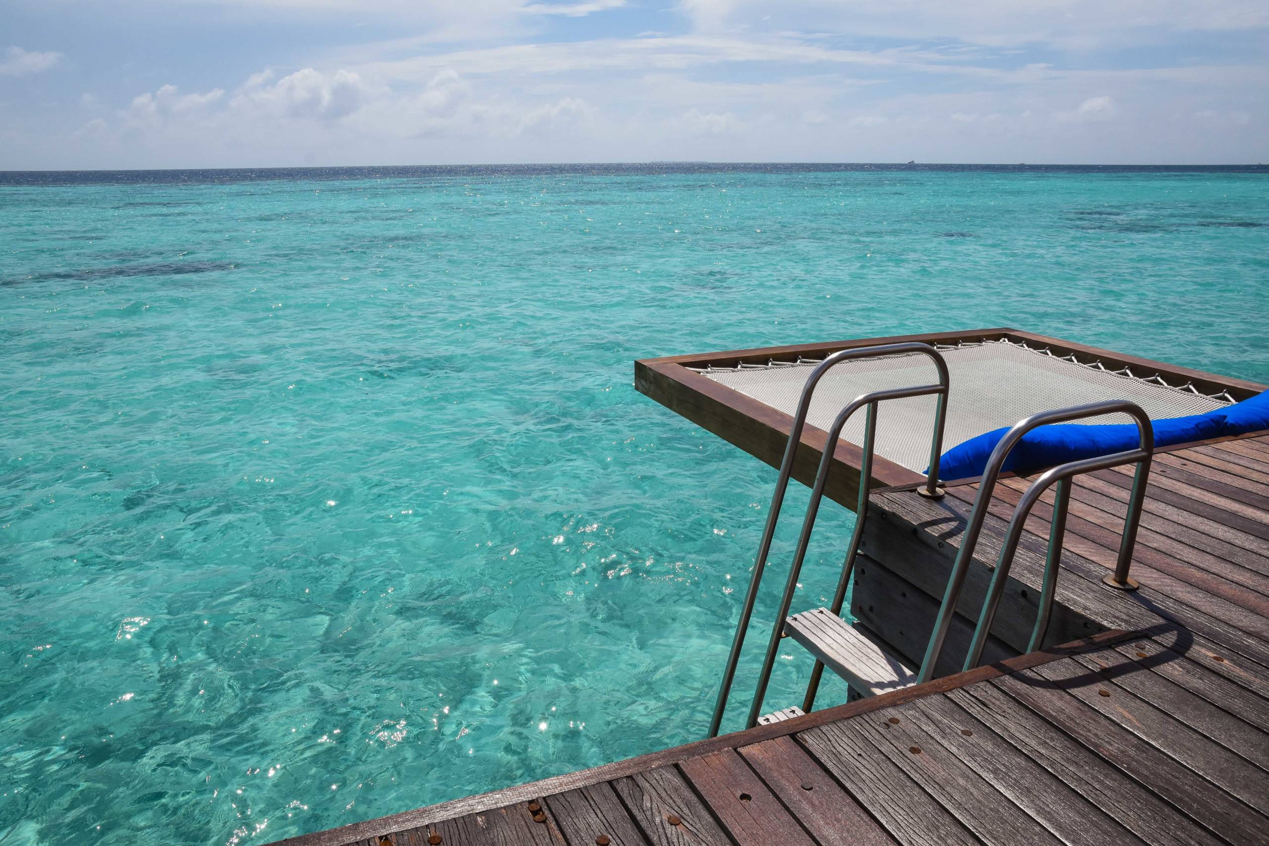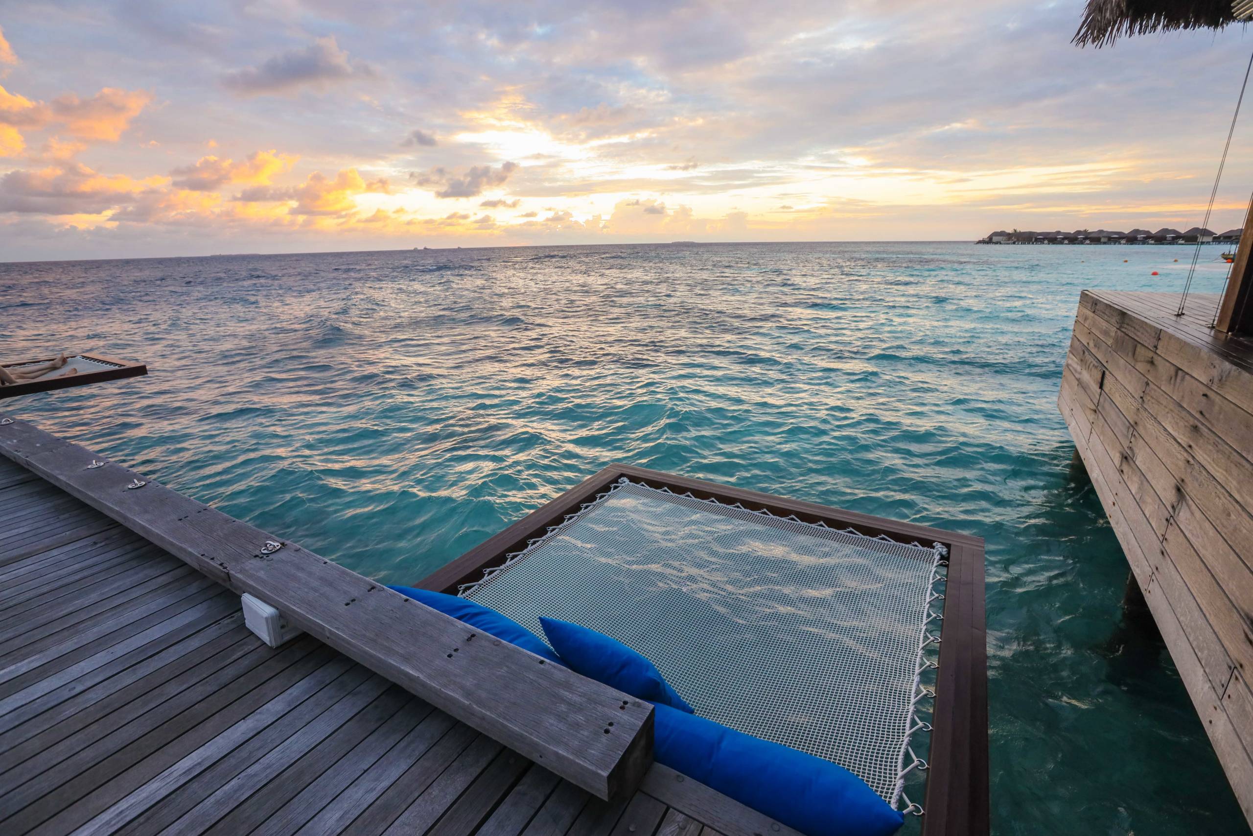 This terrace itself was stunning. It included the same round daybed, table and sun loungers and jacuzzi pool as the beach villa, but it also had a rope bed jutting out over the sea and magnificent views onto the ocean.