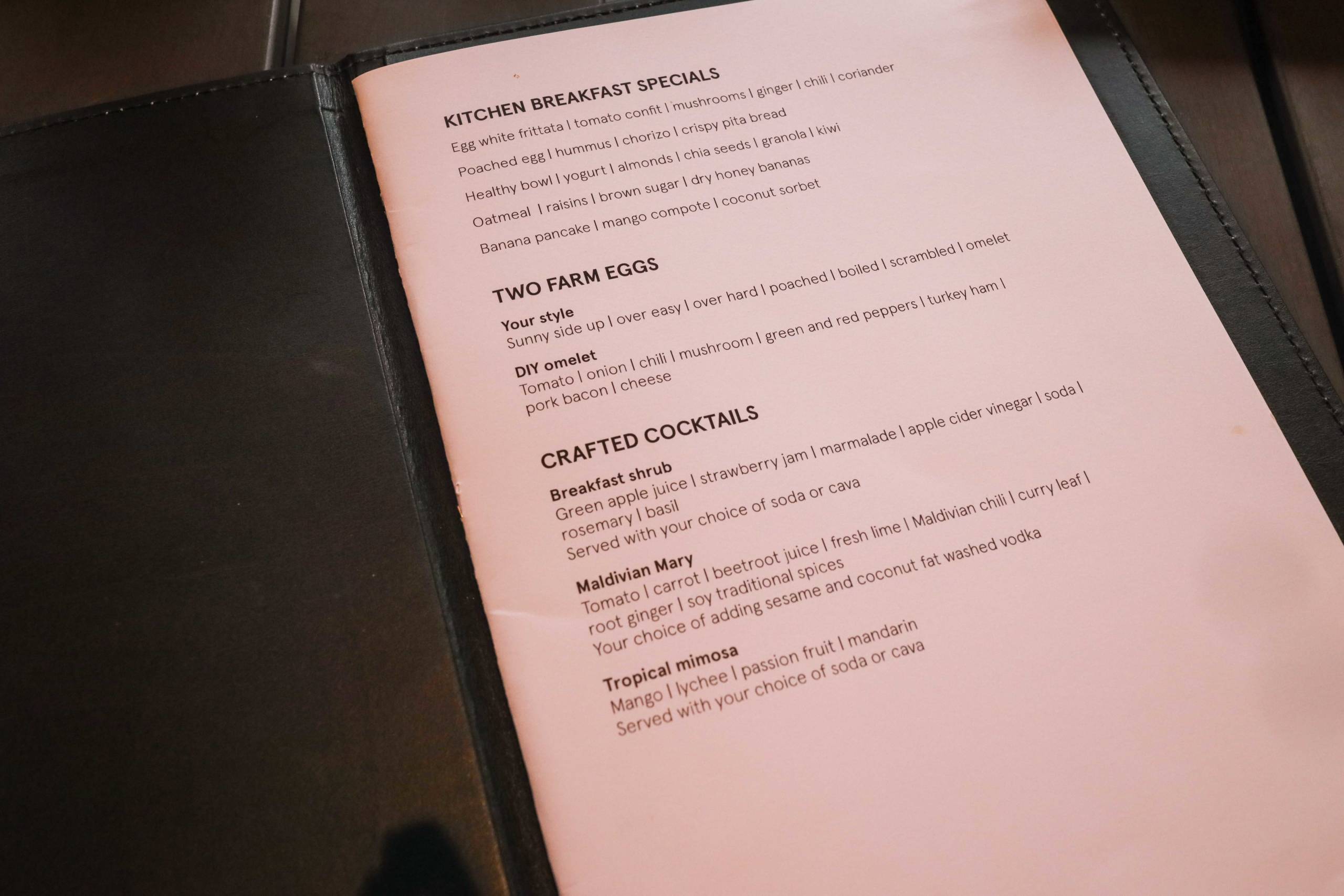 The breakfast also includes booze -- an inventive take on Bloody Marys (the Maldivian Mary) and mimosas. You can have these alcohol-free, or take your cava straight up.