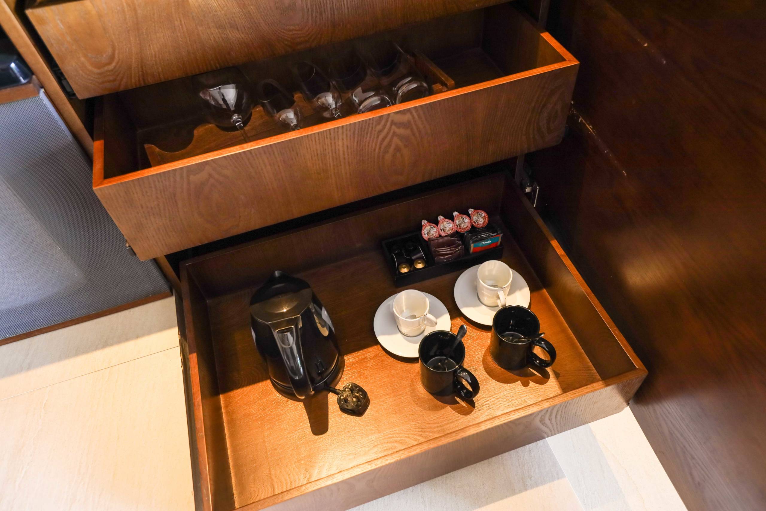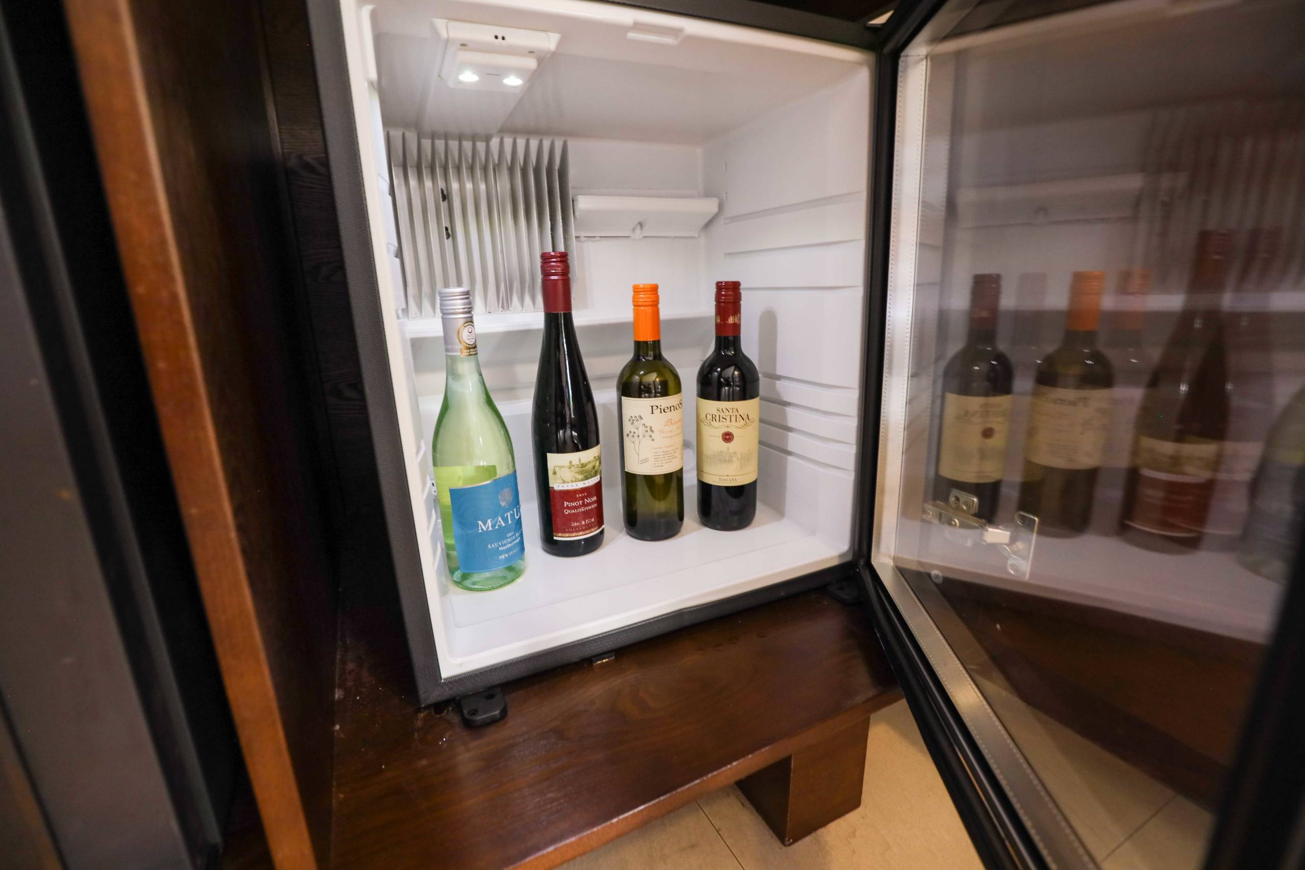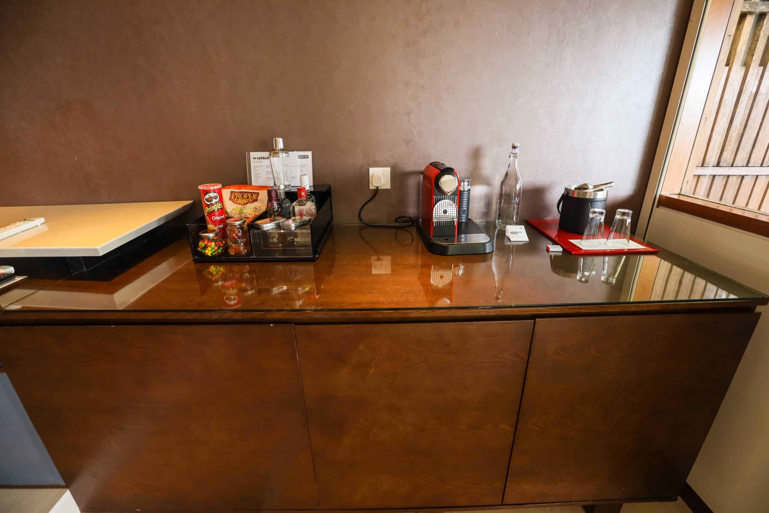 There was a red Nespresso machine with complimentary capsules, complimentary glass bottles of water set out around the room, a well-stocked minibar (which had free soft drinks) and a separate wine fridge.