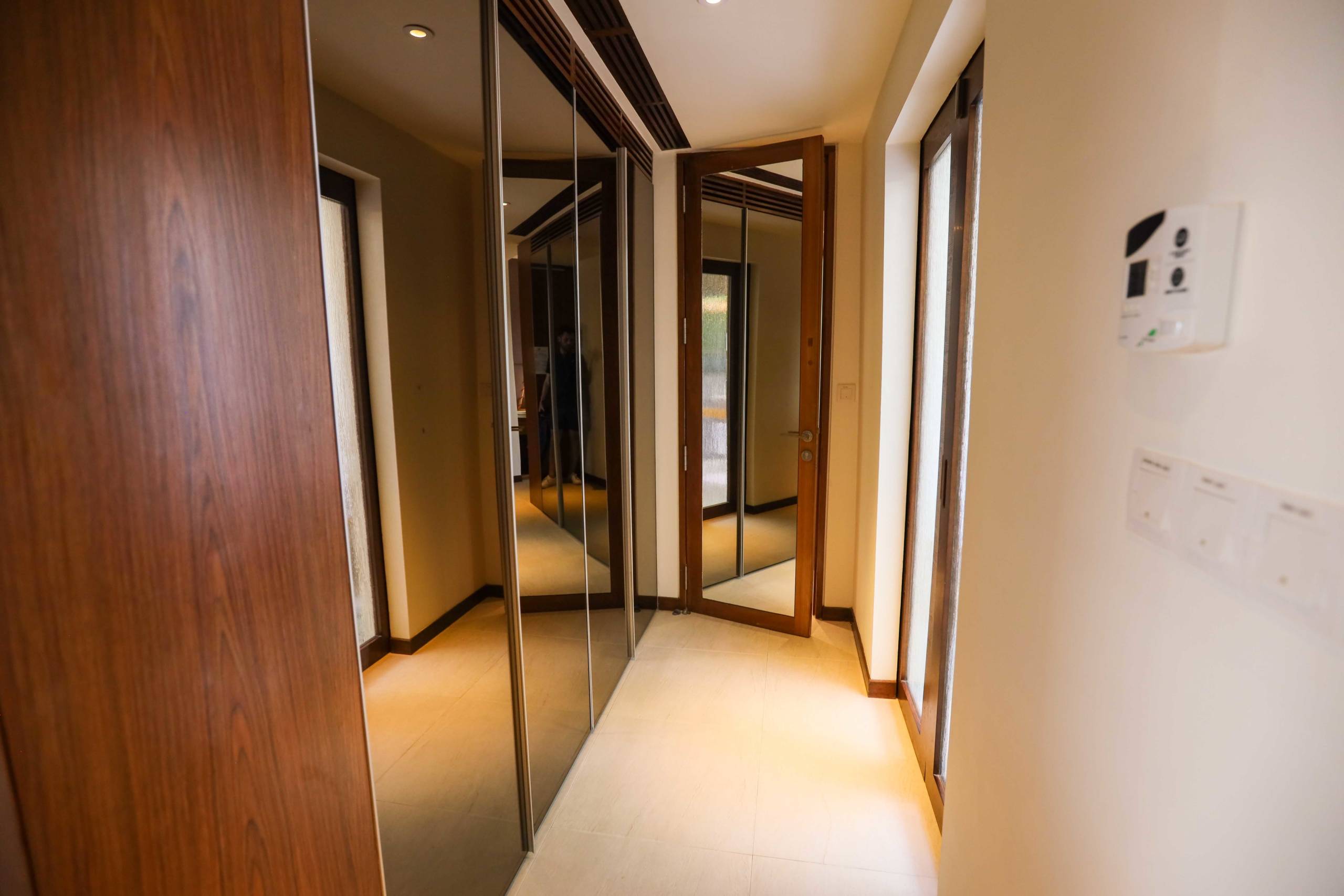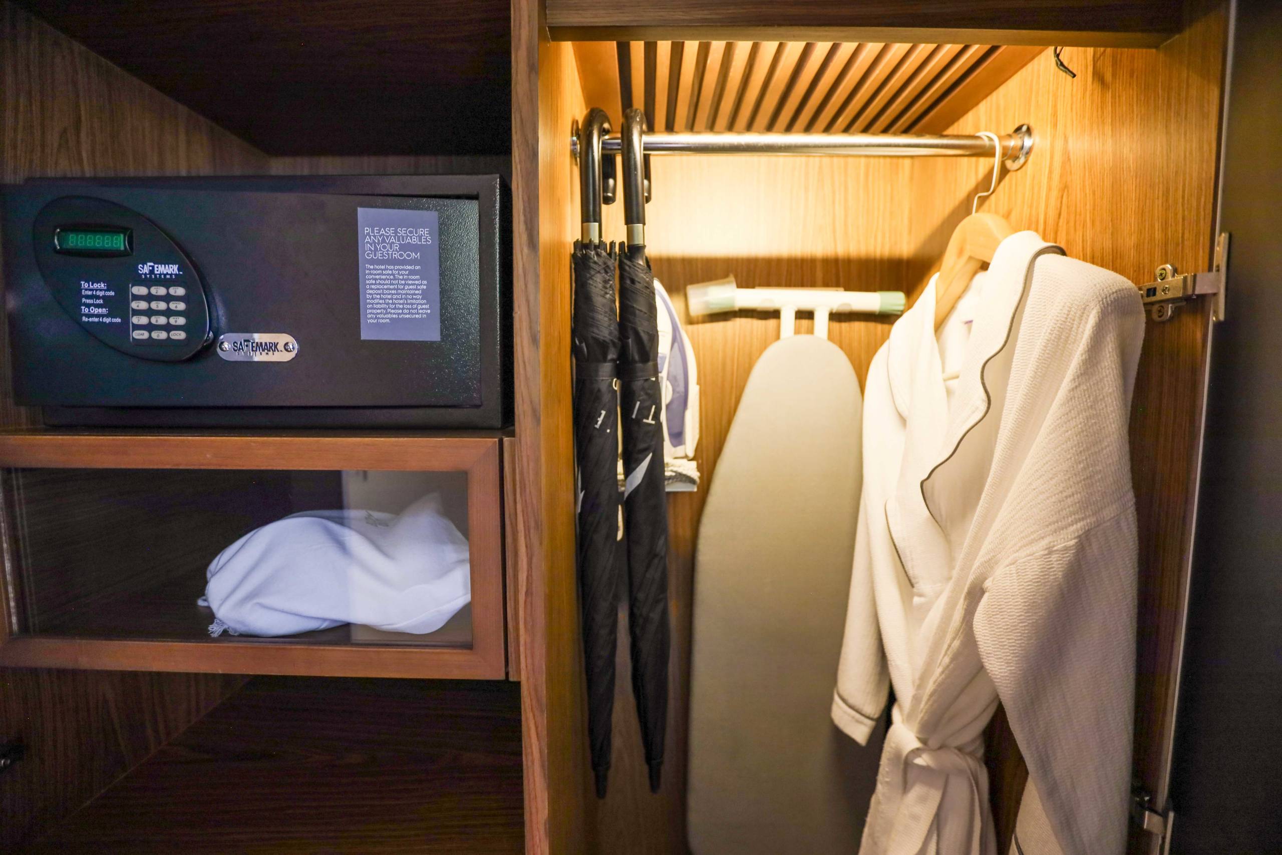 There is a small corridor by the villa entrance with generous wardrobe space, a safe, robes, hairdryer, umbrellas and an iron and ironing board.