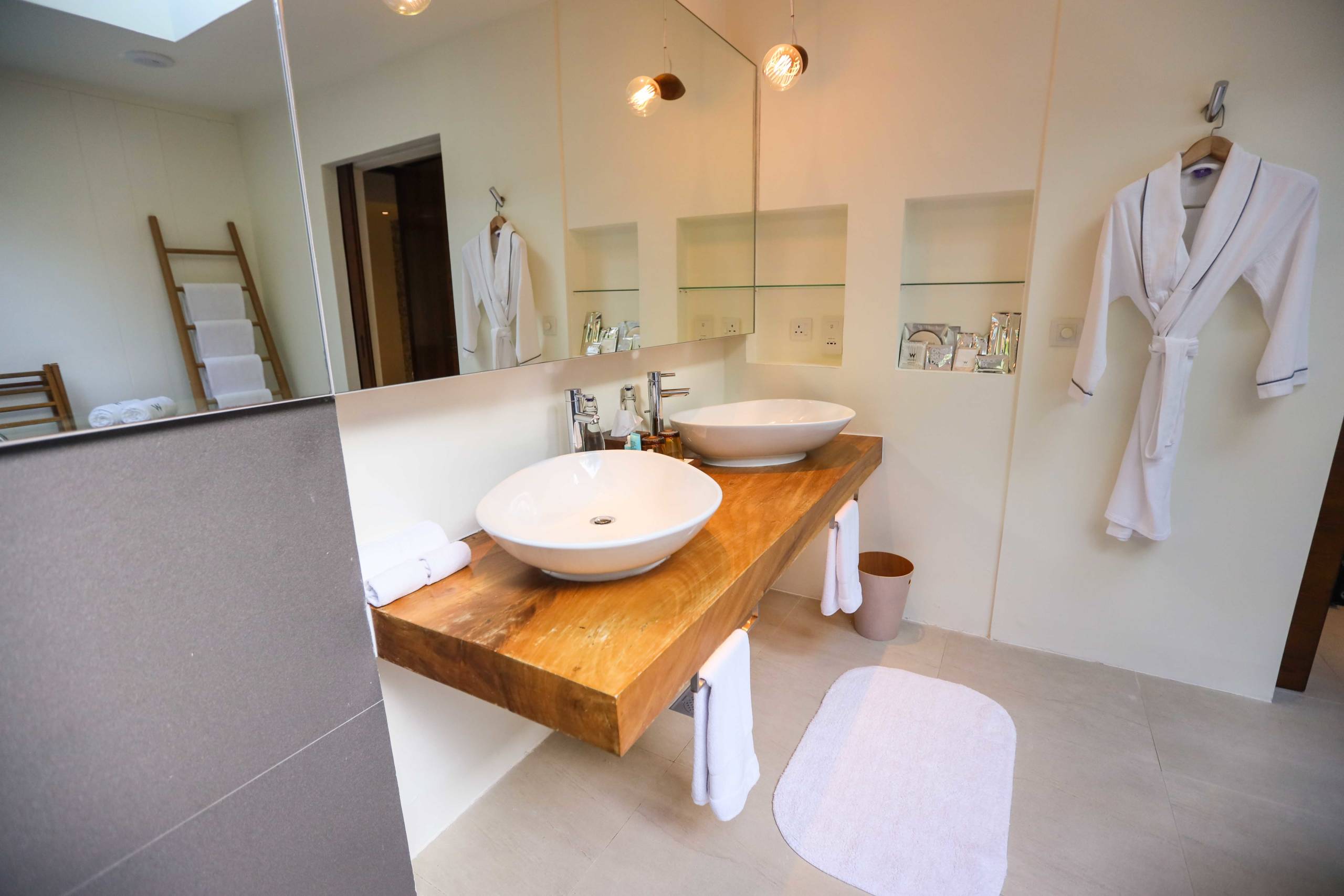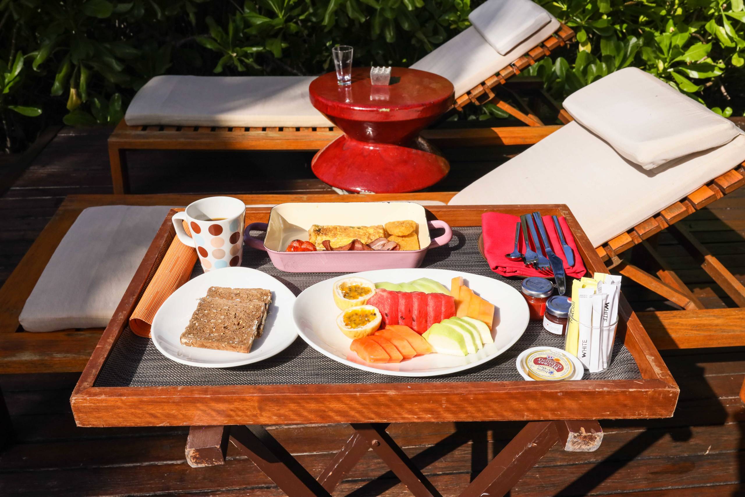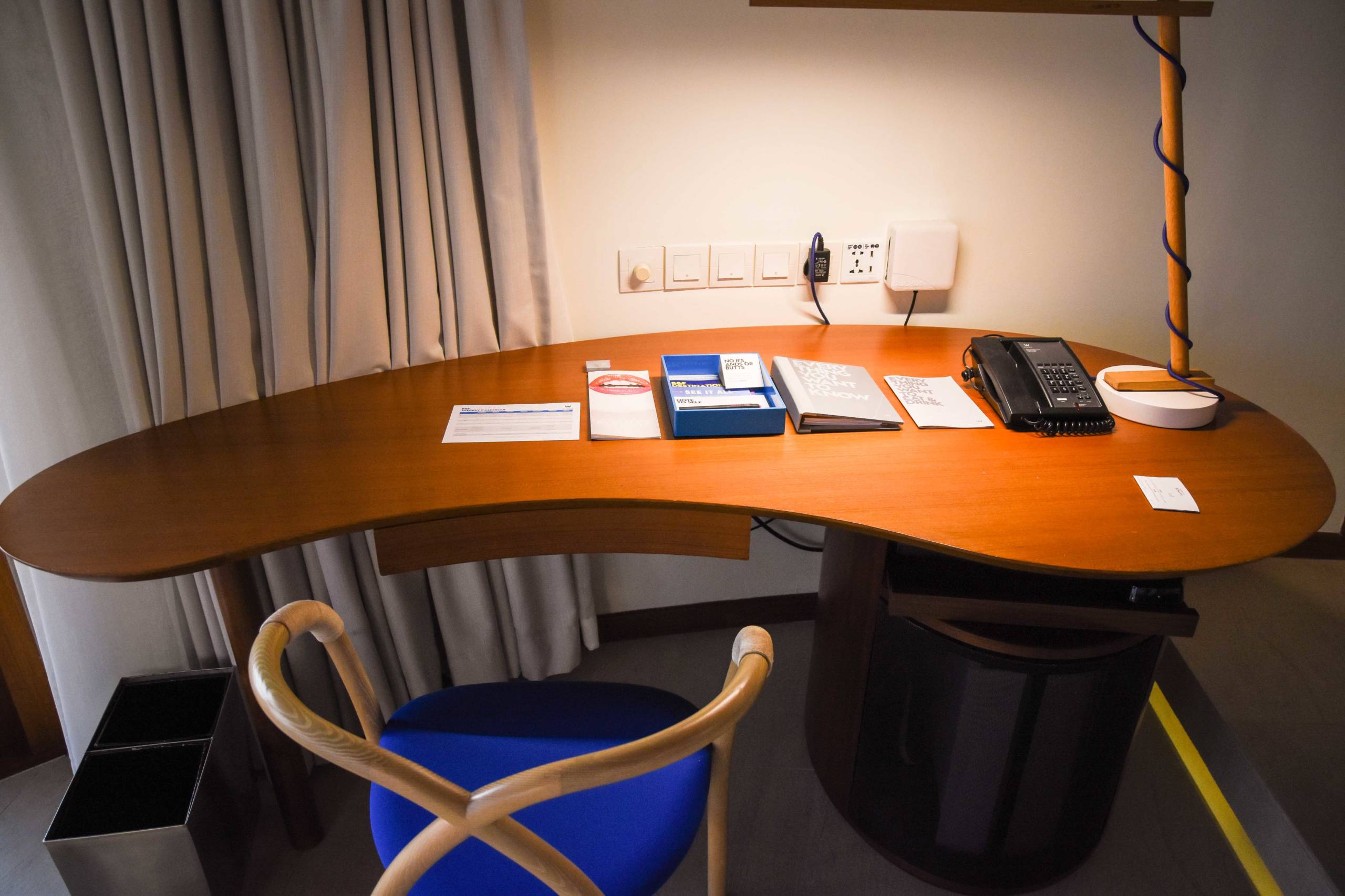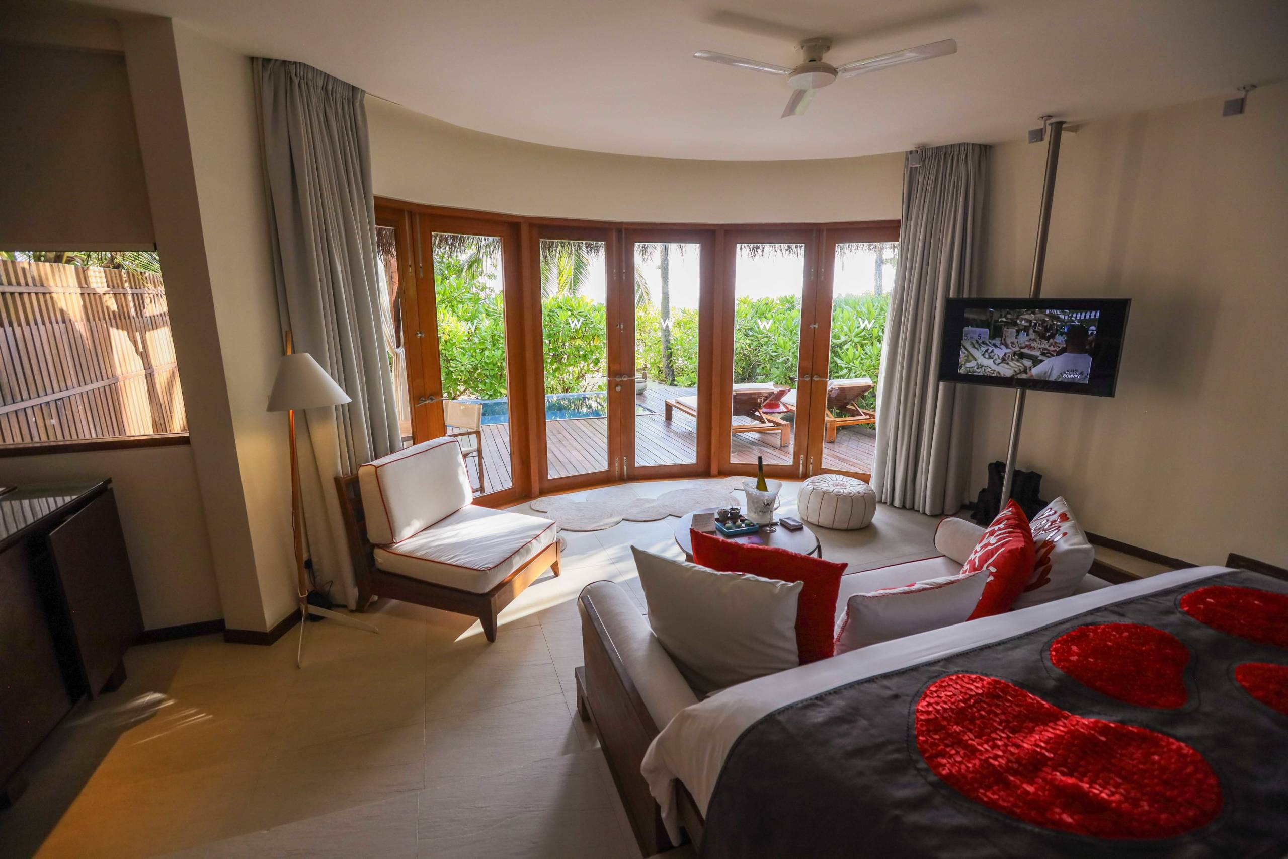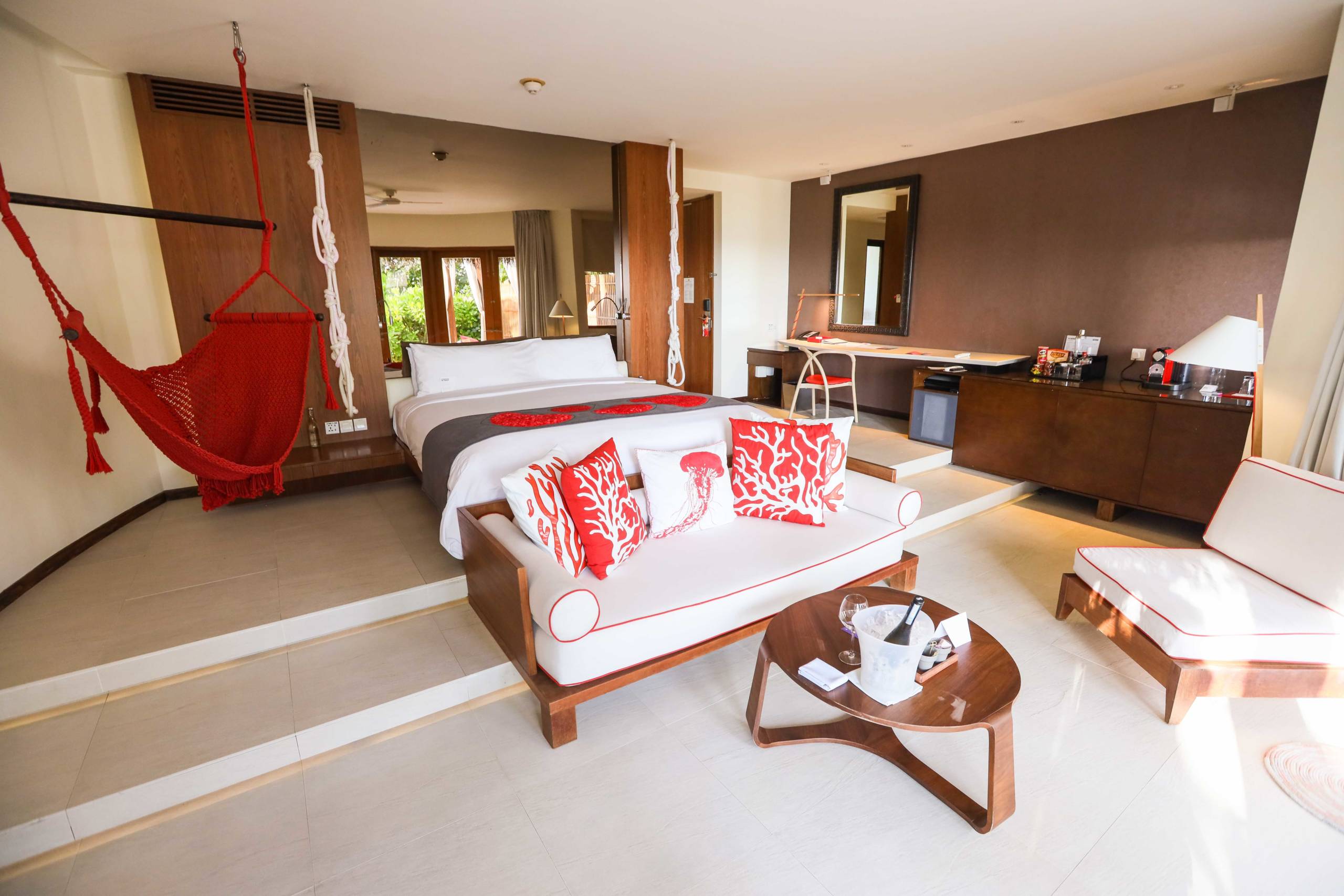 My villa, No. 127, had a playful W charm, with flashes of bright red, crazy textured throws and cushions, a red hanging rope seat in one corner and a chic comfortable white chair. It was also handy having a proper desk area for work. The bed was large and comfortable.