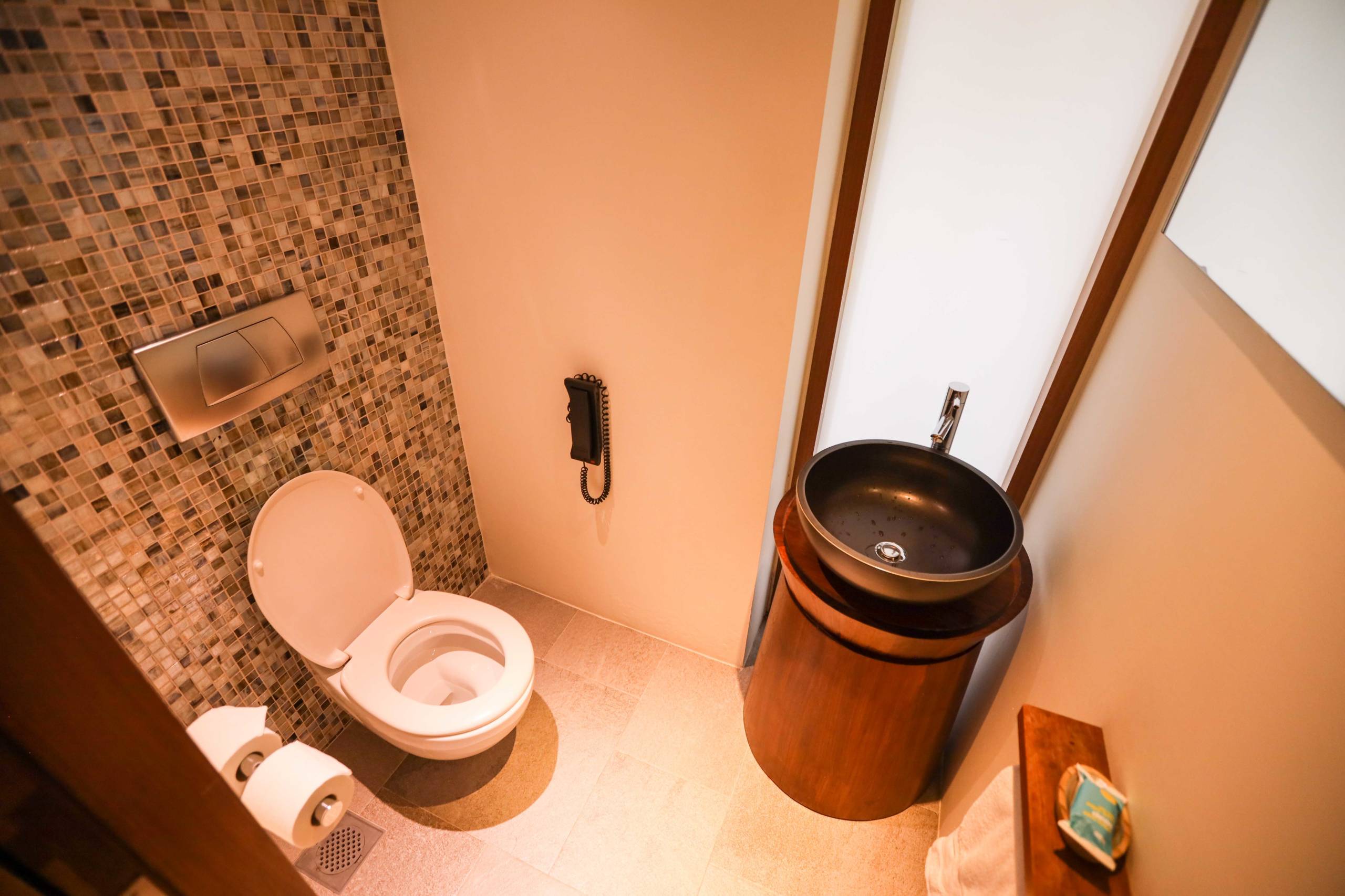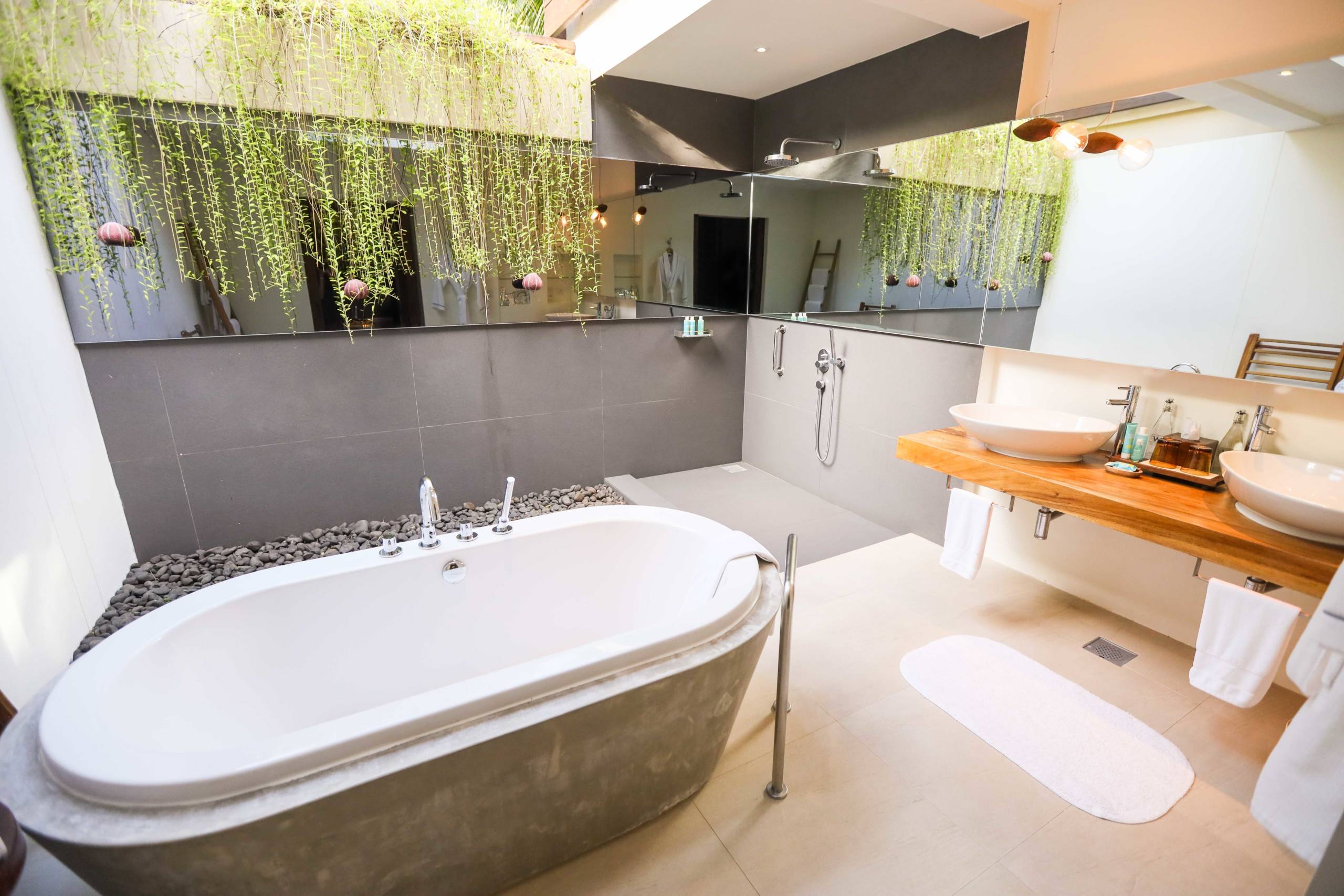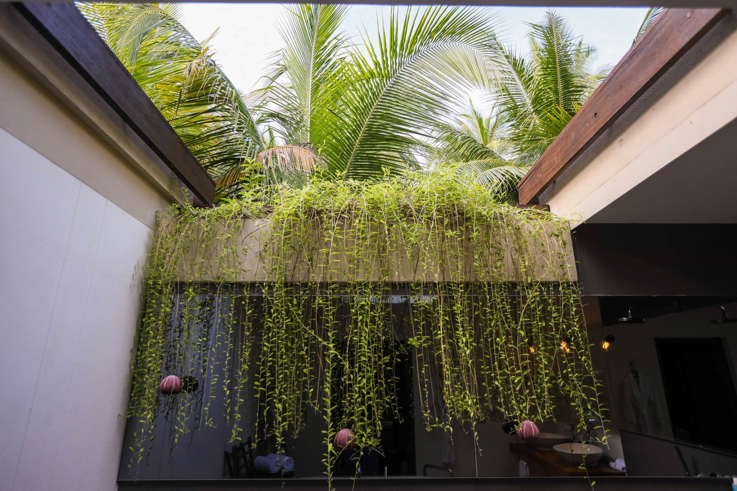 The bathroom was one of my favorite features of the room as it is about 30% exposed to the elements with a section of roof open to the sky. Hanging plants cascade in, giving it a wild jungle feel. But because only a portion of the roof was absent, the bathroom still felt private.