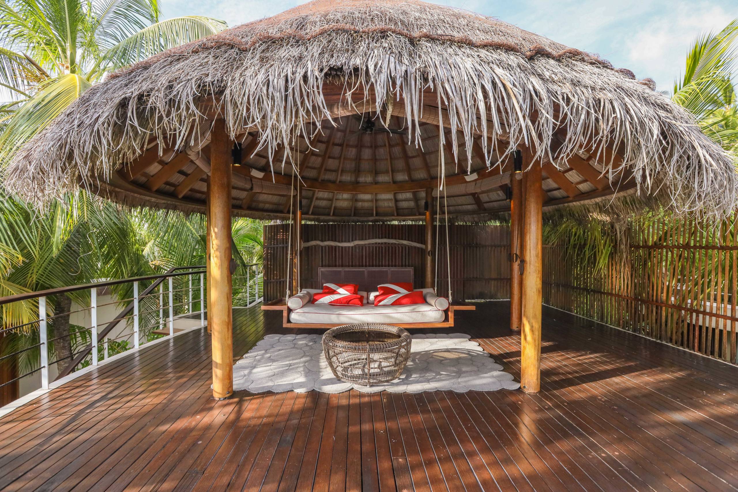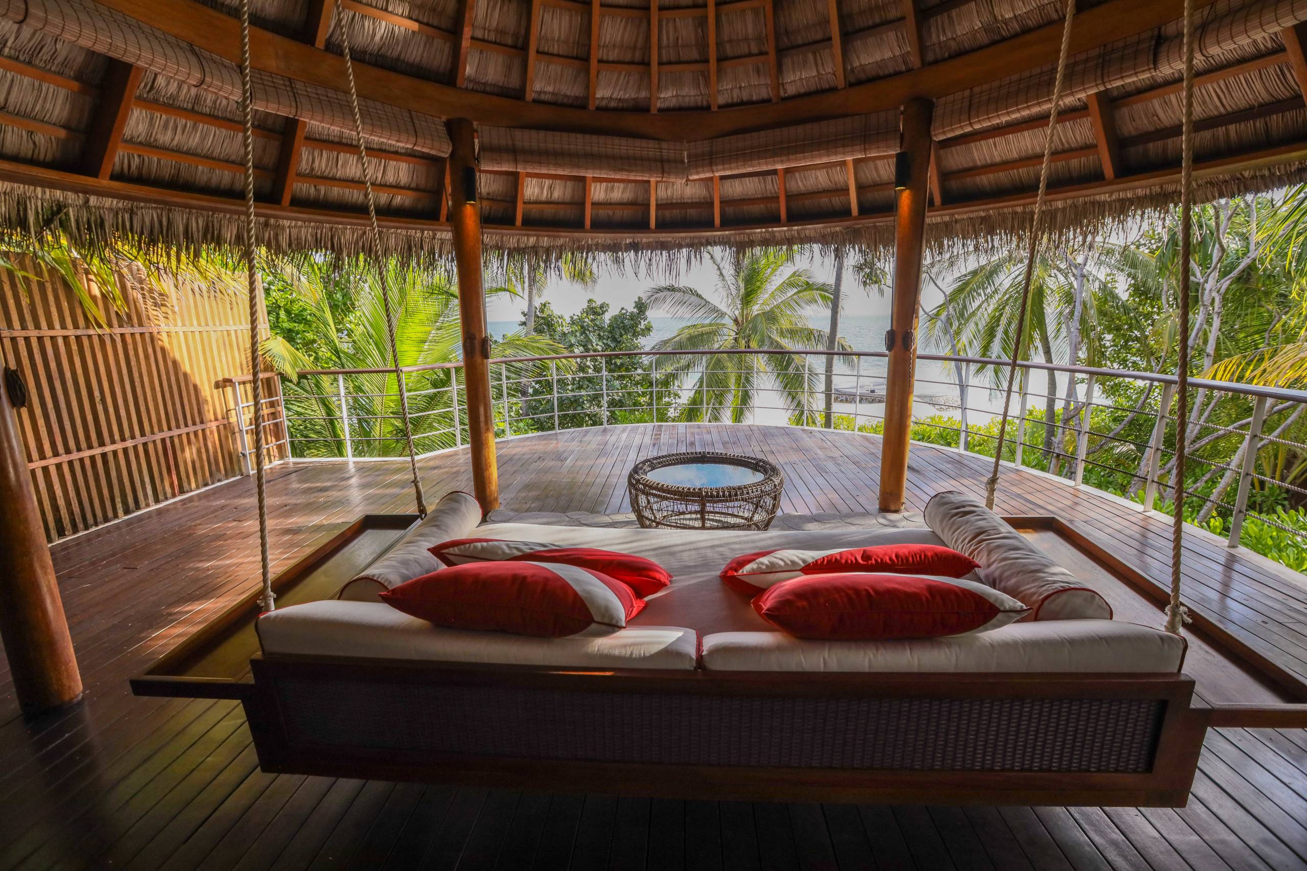 You reach the terrace by climbing a set of stairs wrapped around the outside of the bedroom. It is set beneath a thatched roof, with a huge swinging bed-style lounger and a large table facing out across the pool below and to the ocean.