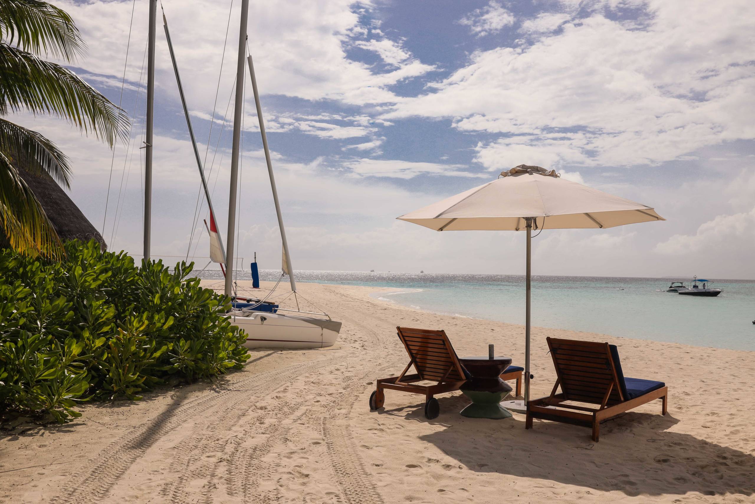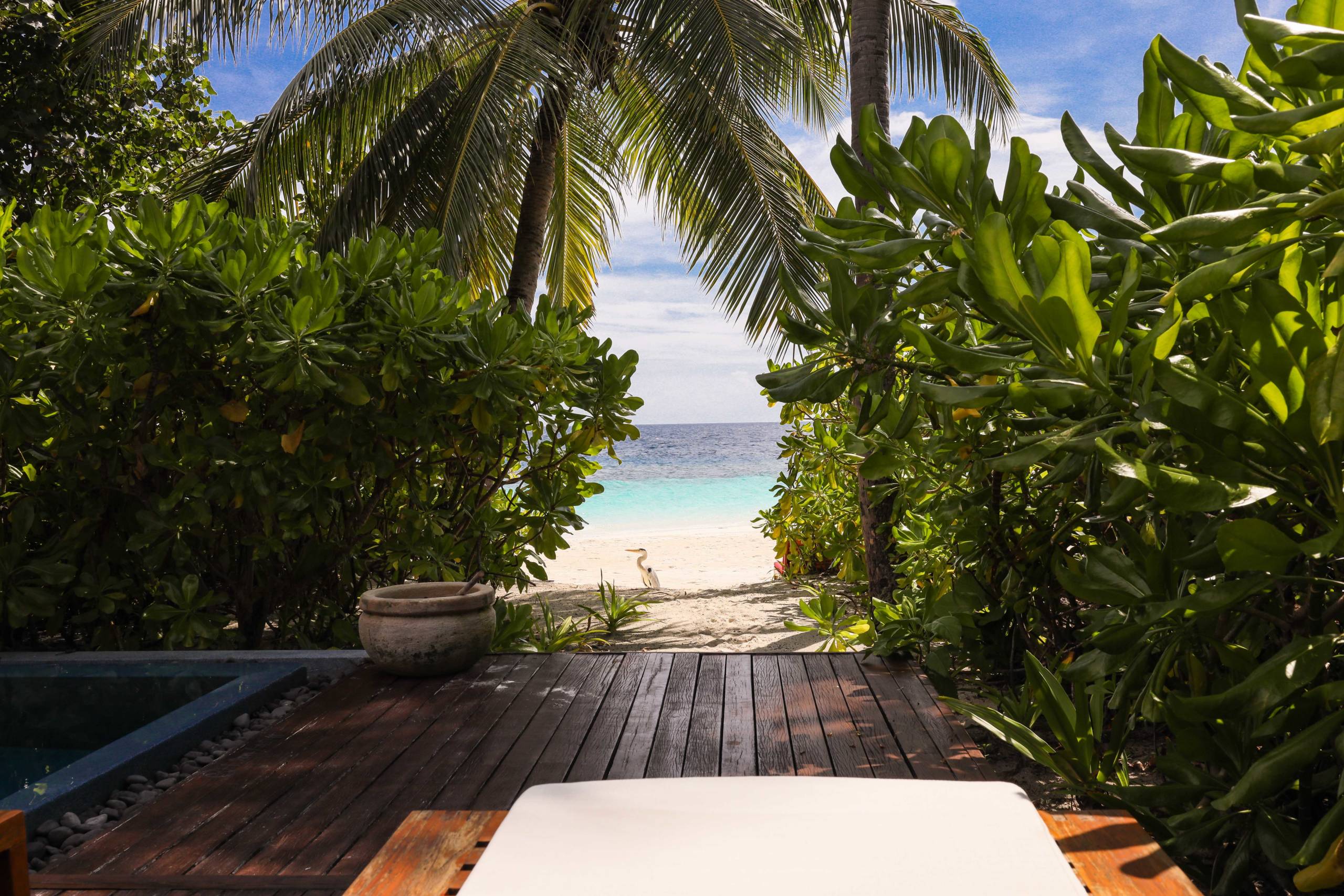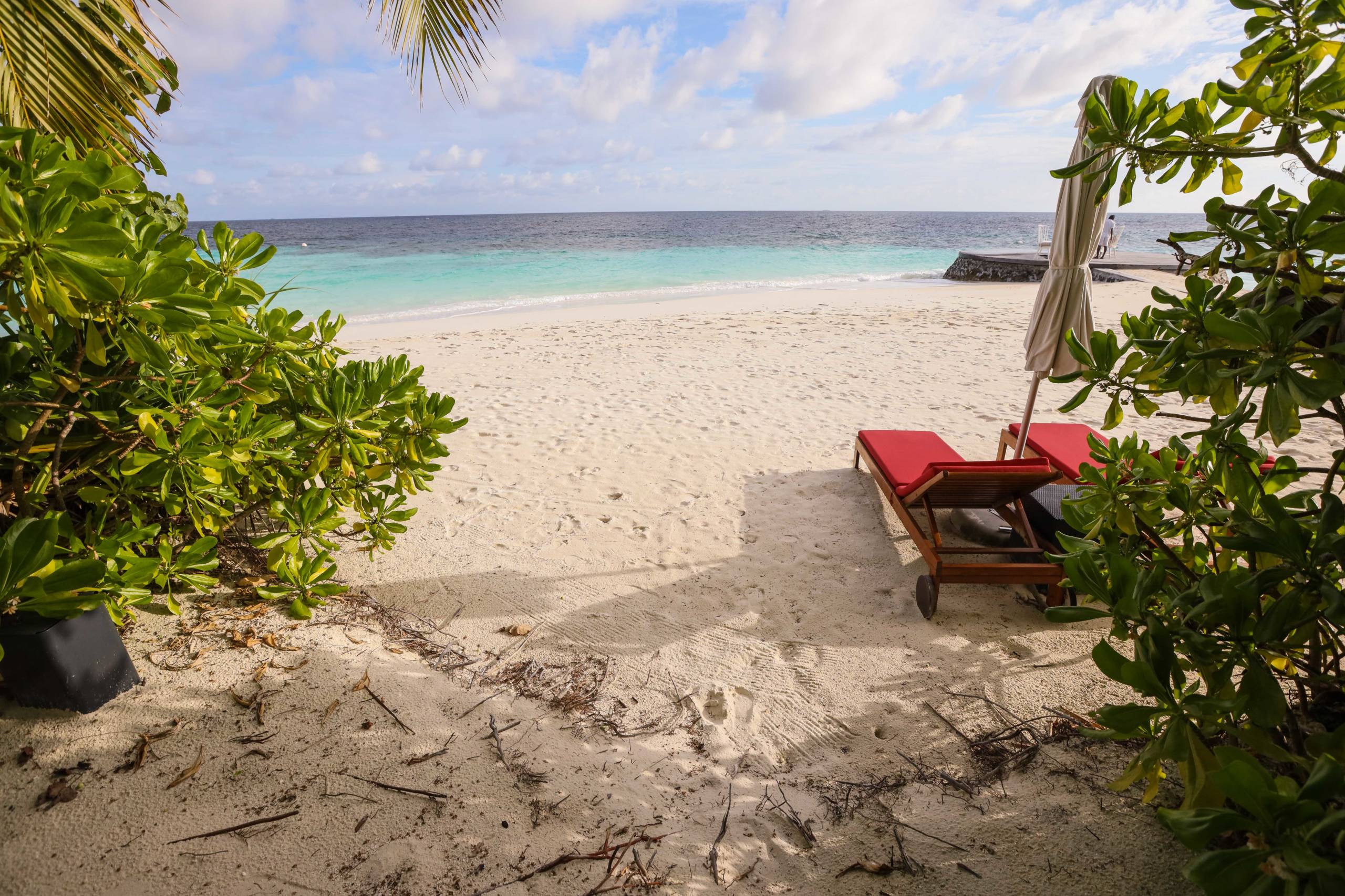 Just beyond the pool and plants is a gorgeous stretch of beach. White sands and turquoise seas. There were another two sun loungers there for use of the villa, although this spot felt much less private as guests strolled along the beach.