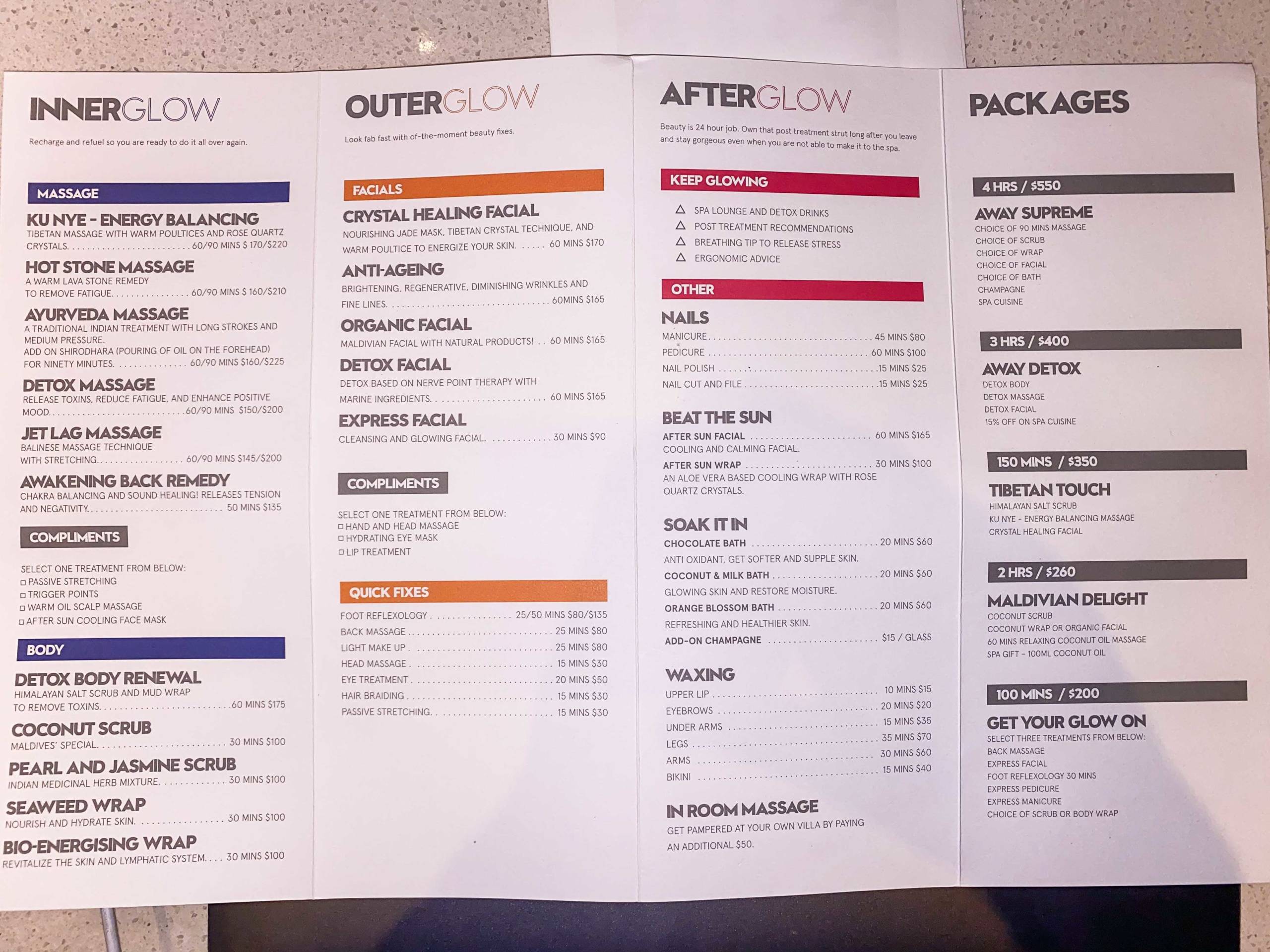 The spa is on the opposite side of the island, on a jetty fanning out from the perfect shoreline. I enjoyed the whole experience of the signature Ku Nye treatment which is a Tibetan massage with warm poultices and rose-quartz crystals. It began with a private steam-room session and the whole thing was so great I will ignore the moldy bowl of ginger and orange slices I found in the steam room.