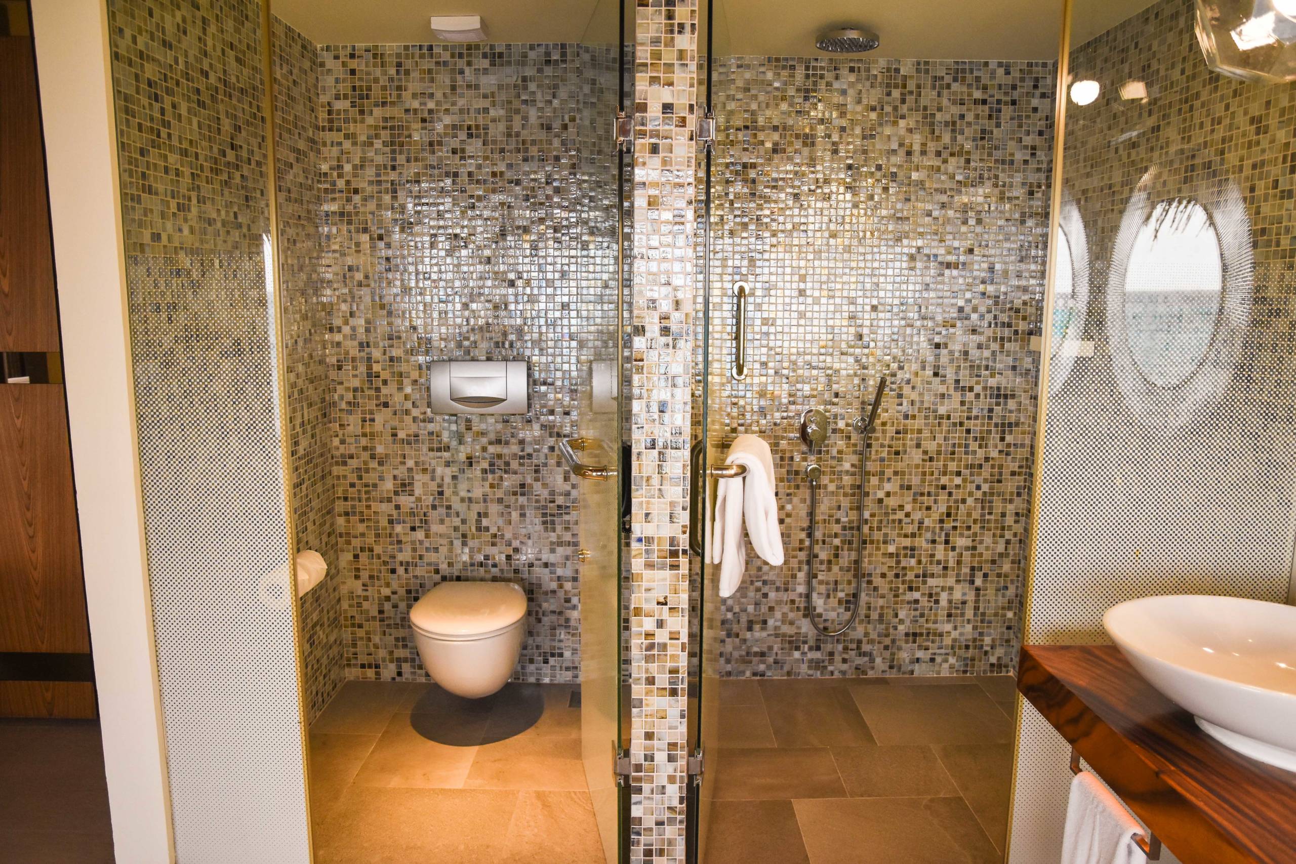 Off the corridor is a toilet and a separate bathroom with rain shower, bathtub, double sink and wraparound mirrors.
