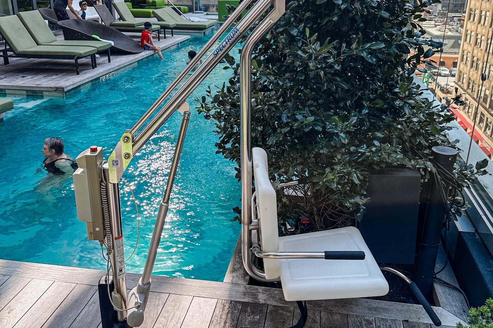 The hotel entrance is wheelchair accessible since it is at street level, and the transition from the indoor portion of the Wet Deck to the outdoor pool area is also wheelchair accessible. The Wet Deck pool has a lift as well, so guests who need extra assistance can easily enter and exit the water.