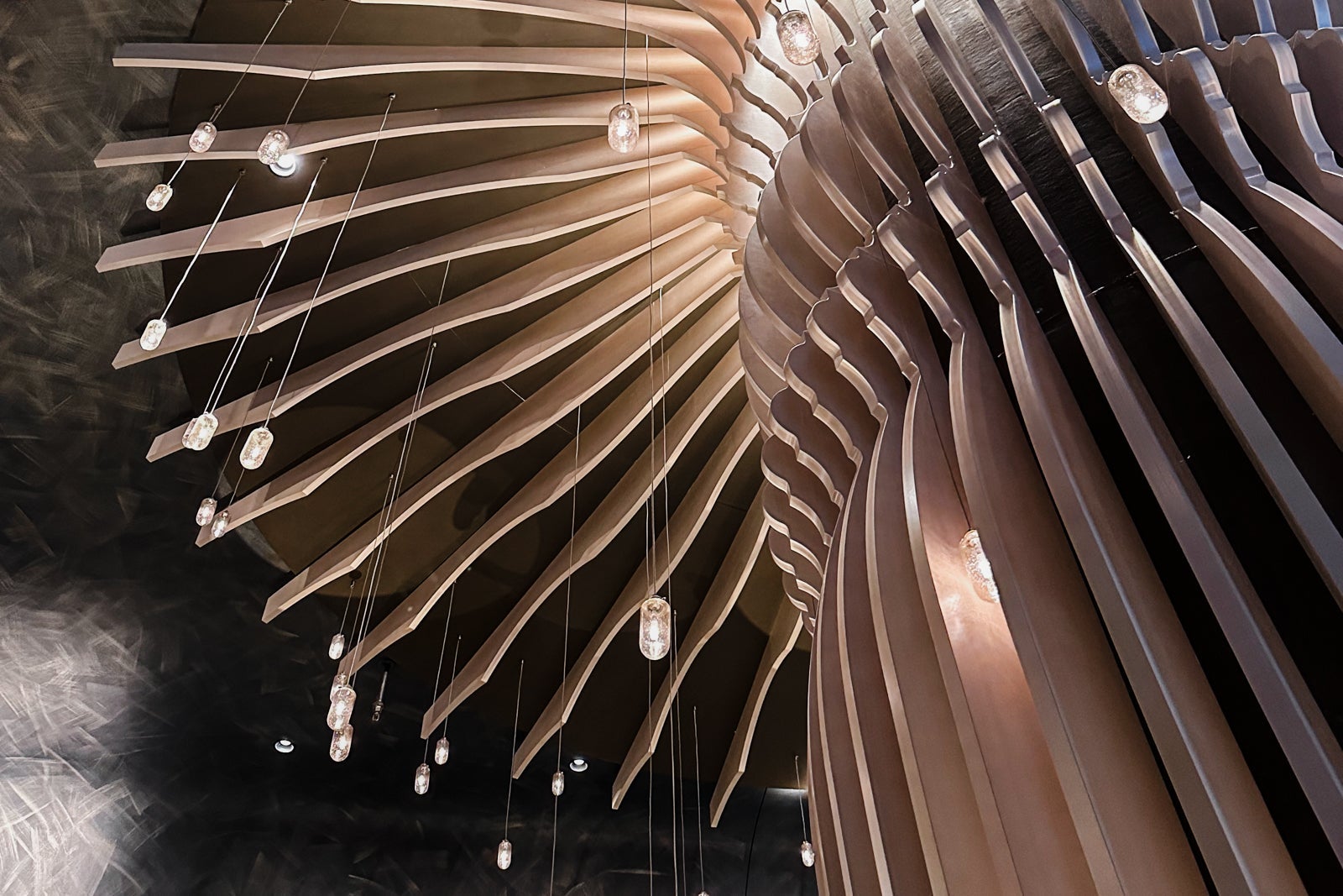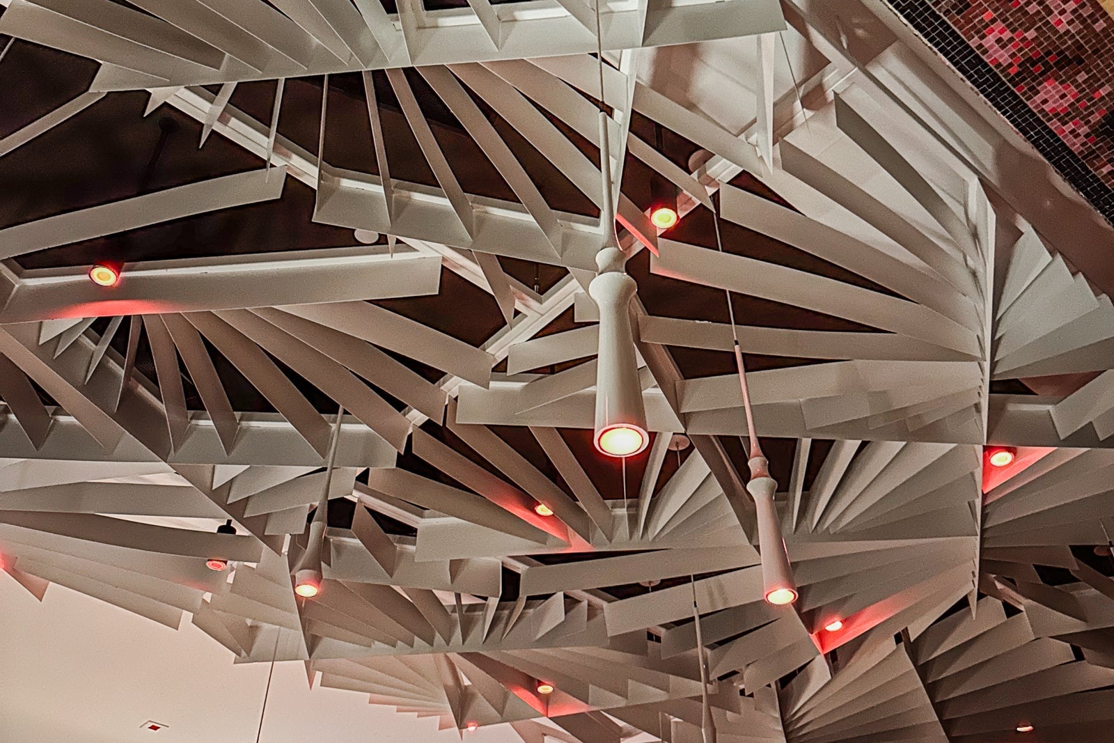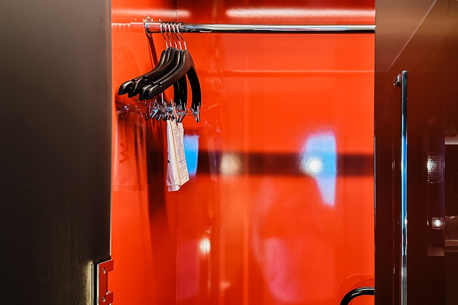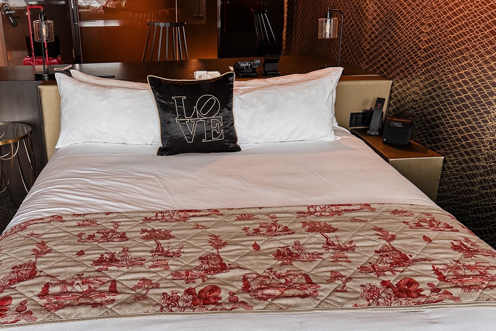 Unsurprisingly, the vibe at the W Philadelphia is similar, offering a moody aesthetic with black and deep, rich red accents, plus textured wallpaper in the rooms, the common spaces and the elevators. Funky light fixtures and art throughout the property add to the ambience.