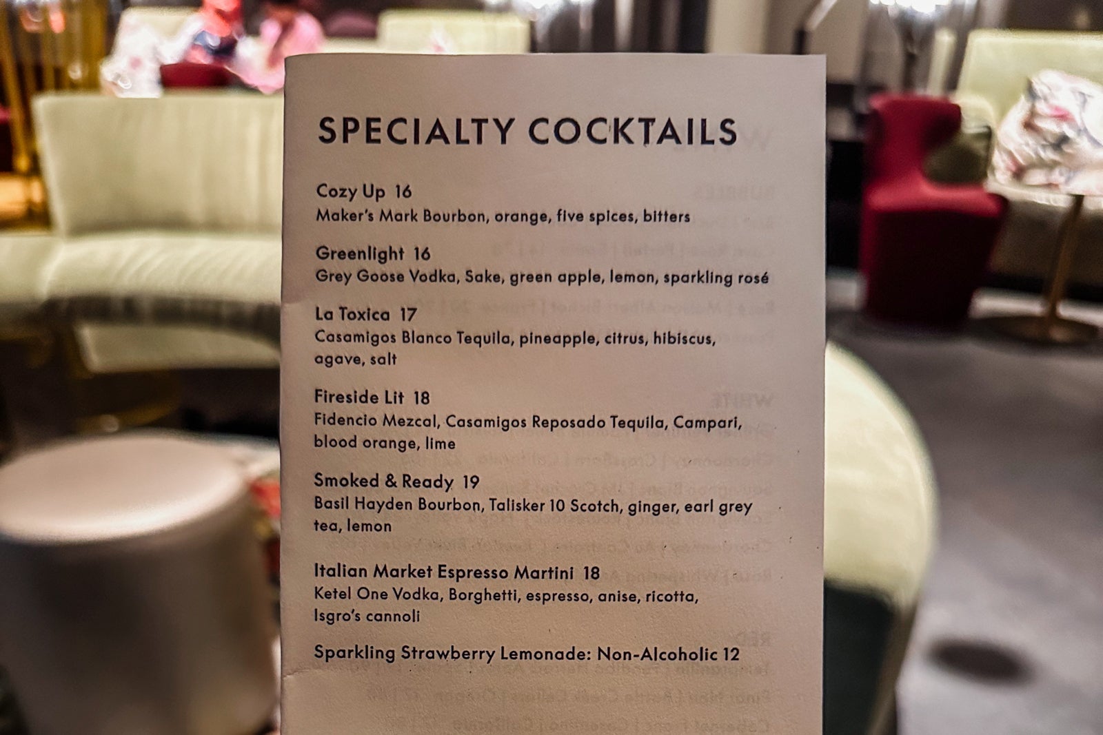 For our predinner drinks, my partner and I ordered La Toxica ($17), a fruit-forward but not overly sweet concoction, and the Smoked & Ready ($19), which masterfully blended Earl Grey tea with ginger, scotch and bourbon. We also shared an Italian Market Espresso Martini ($18) and loved that it came with a miniature cannoli garnish.