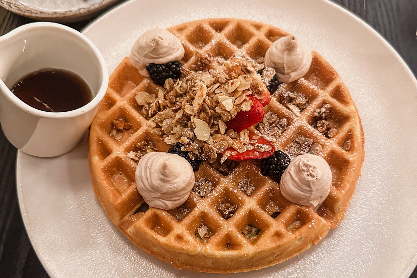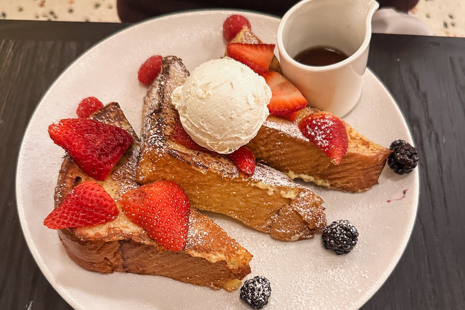 Our second meal at Dolce was breakfast on the morning we were set to depart the hotel. There were several options to choose from, including oatmeal, avocado toast, various egg-based dishes and even an acai bowl. We chose a Belgian waffle ($15) and French toast ($16) with a single cup of coffee ($4) and two sides of bacon ($12 total).
