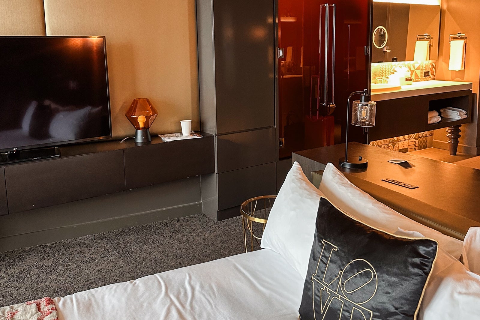 Upon stepping foot inside my room, I was immediately impressed with its overall layout and size. The 402-square-foot space matched the dark, moody design of the rest of the hotel while still offering tons of natural light from floor-to-ceiling windows.