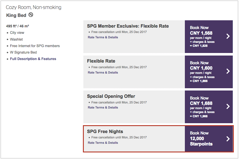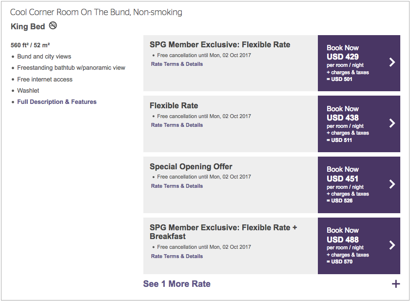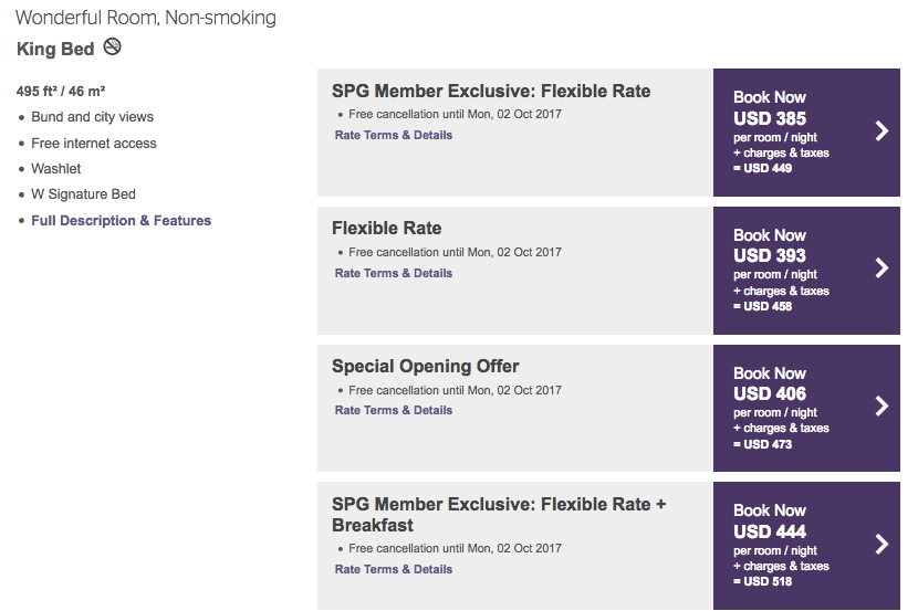 The lowest rate I could find was $385 per night for a Wonderful Room, which came to $449 including charges and taxes. There was one smaller category, Cozy, but none of those rooms were available for my dates. As an SPG member, I qualified for an exclusive flexible rate that was actually $5 cheaper than the regular flexible rate and would still allow me to cancel up to two days before my stay.